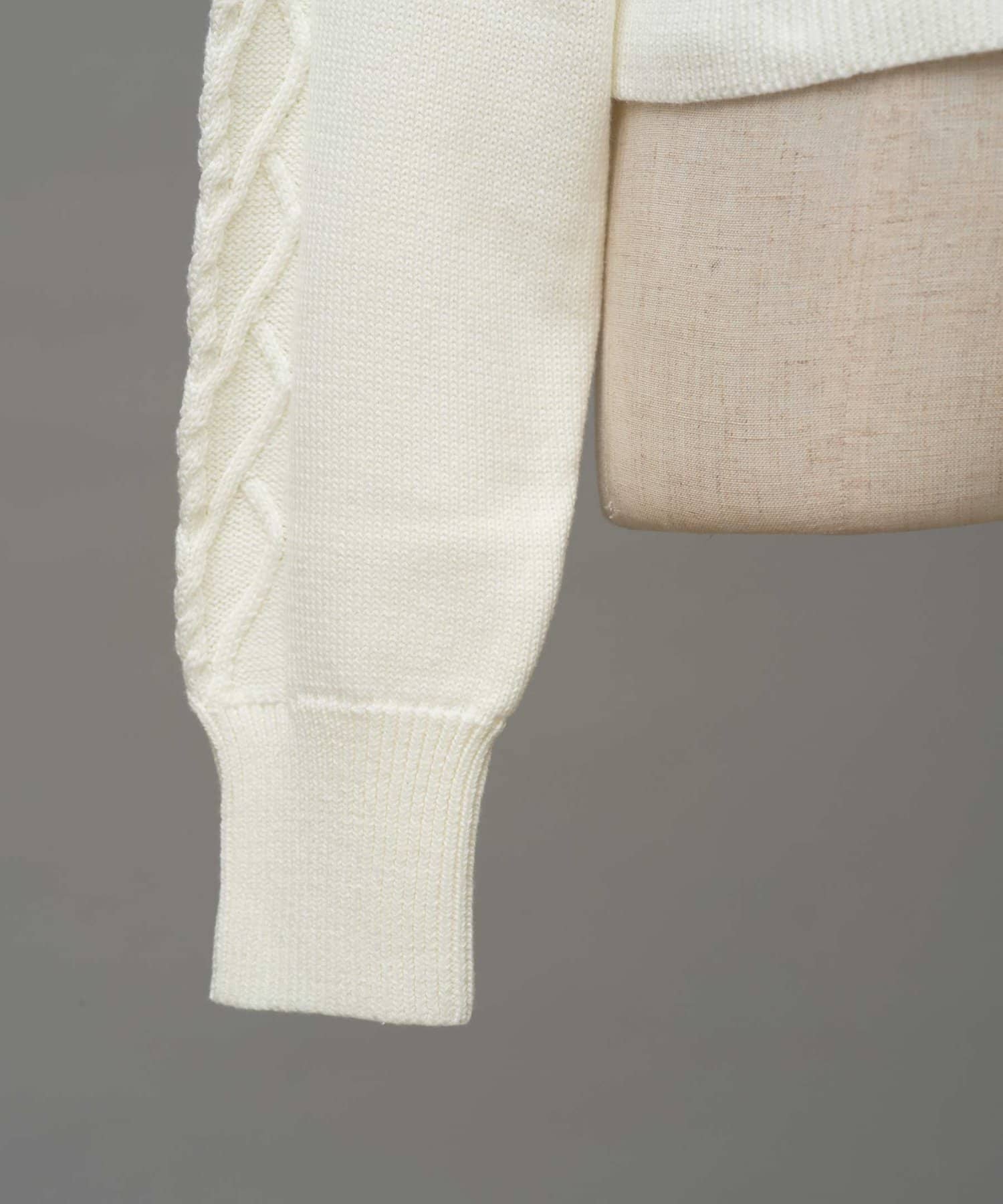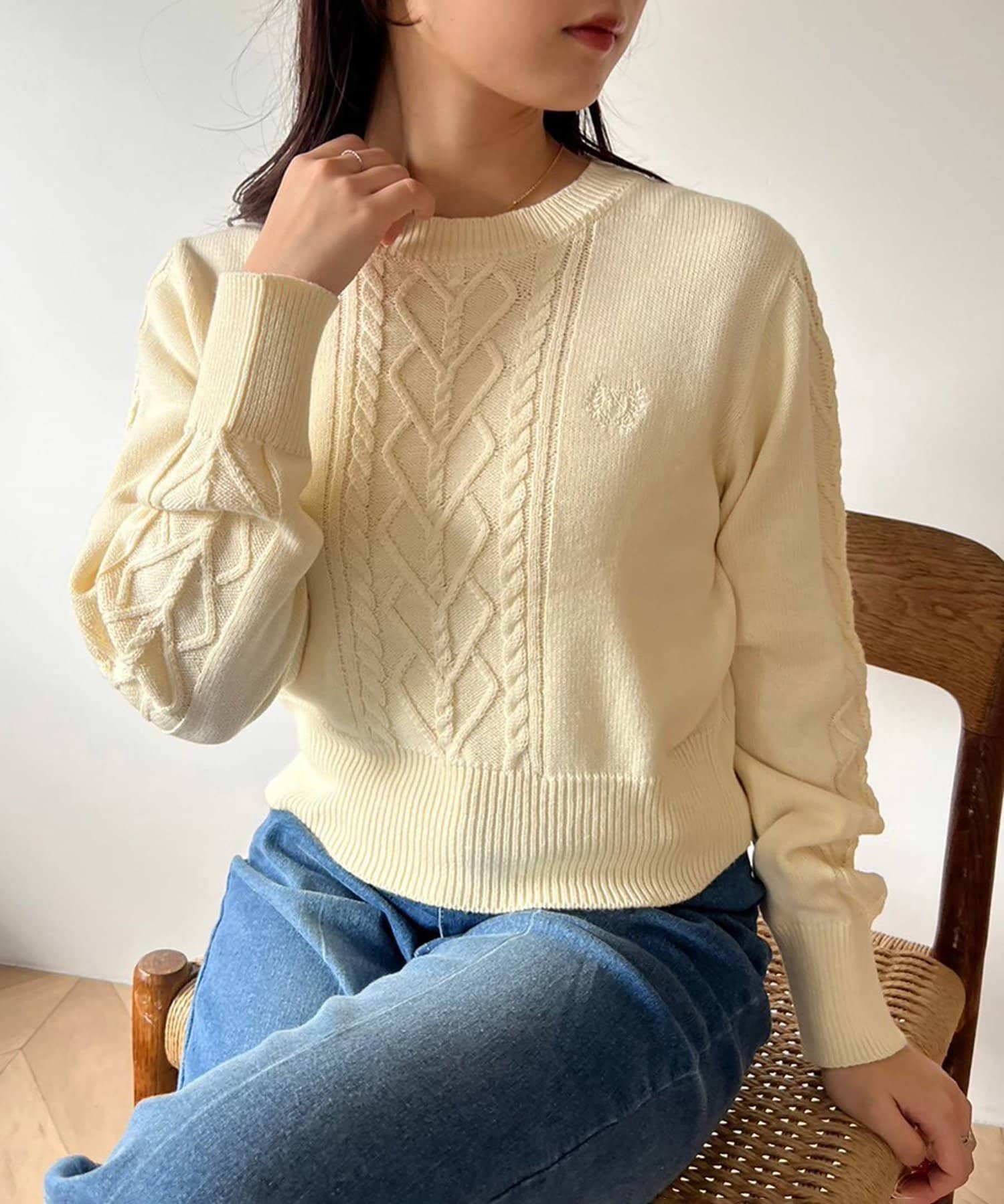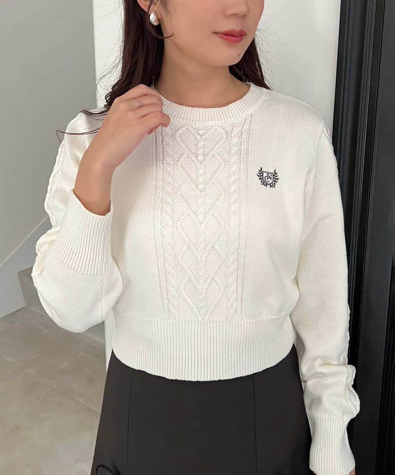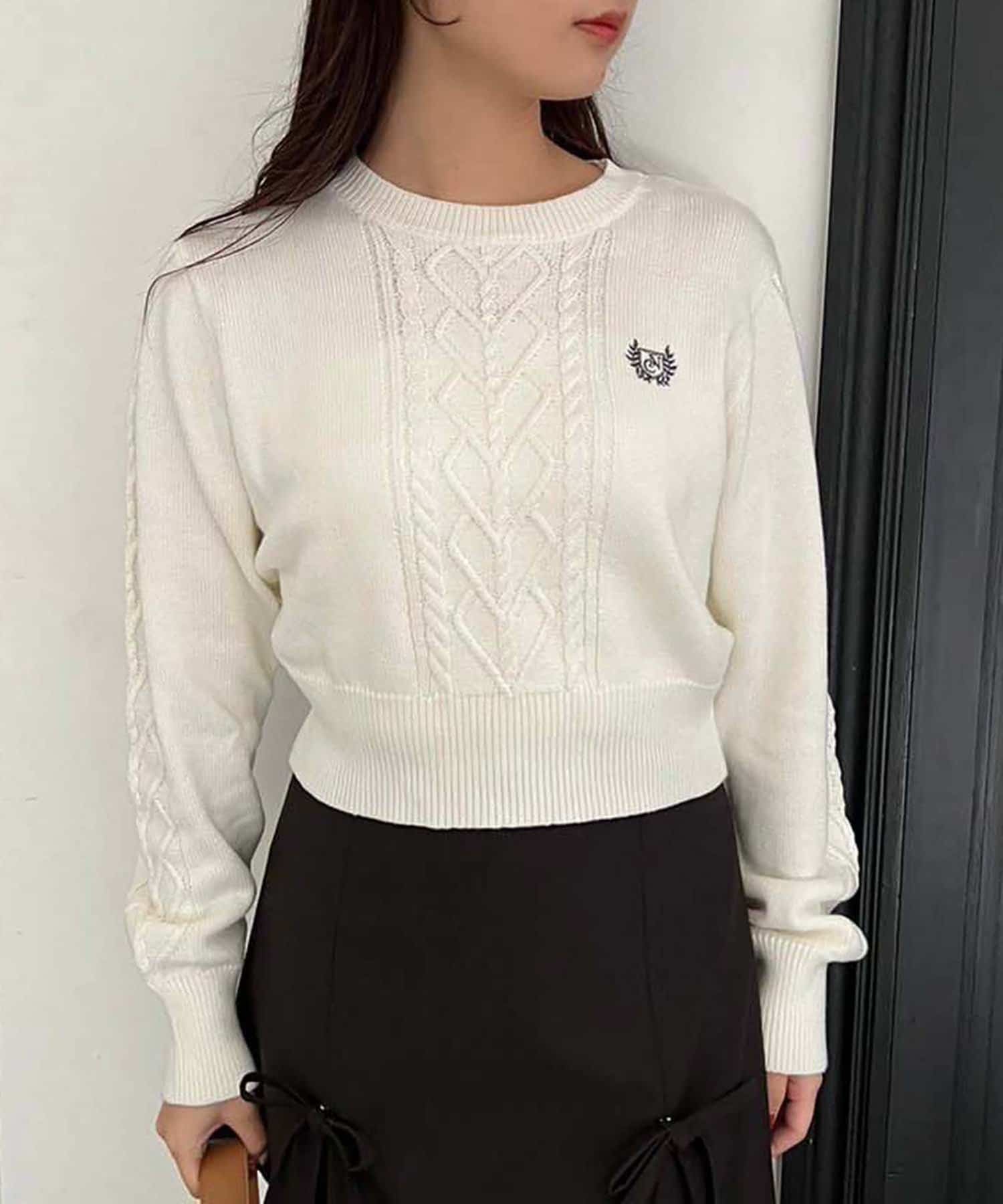 胸元のワンポイント刺しゅうロゴがアクセントのケーブルニット