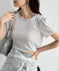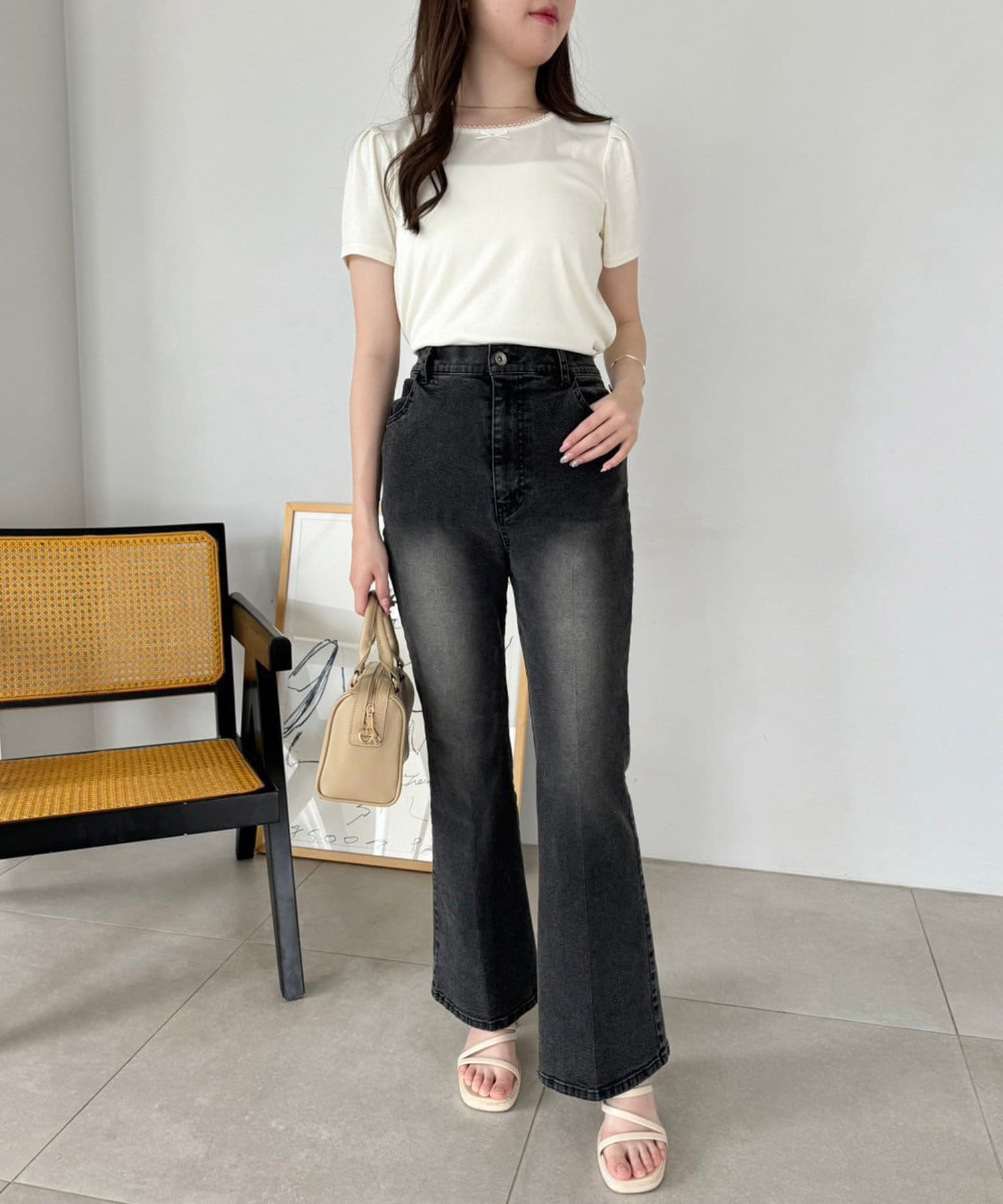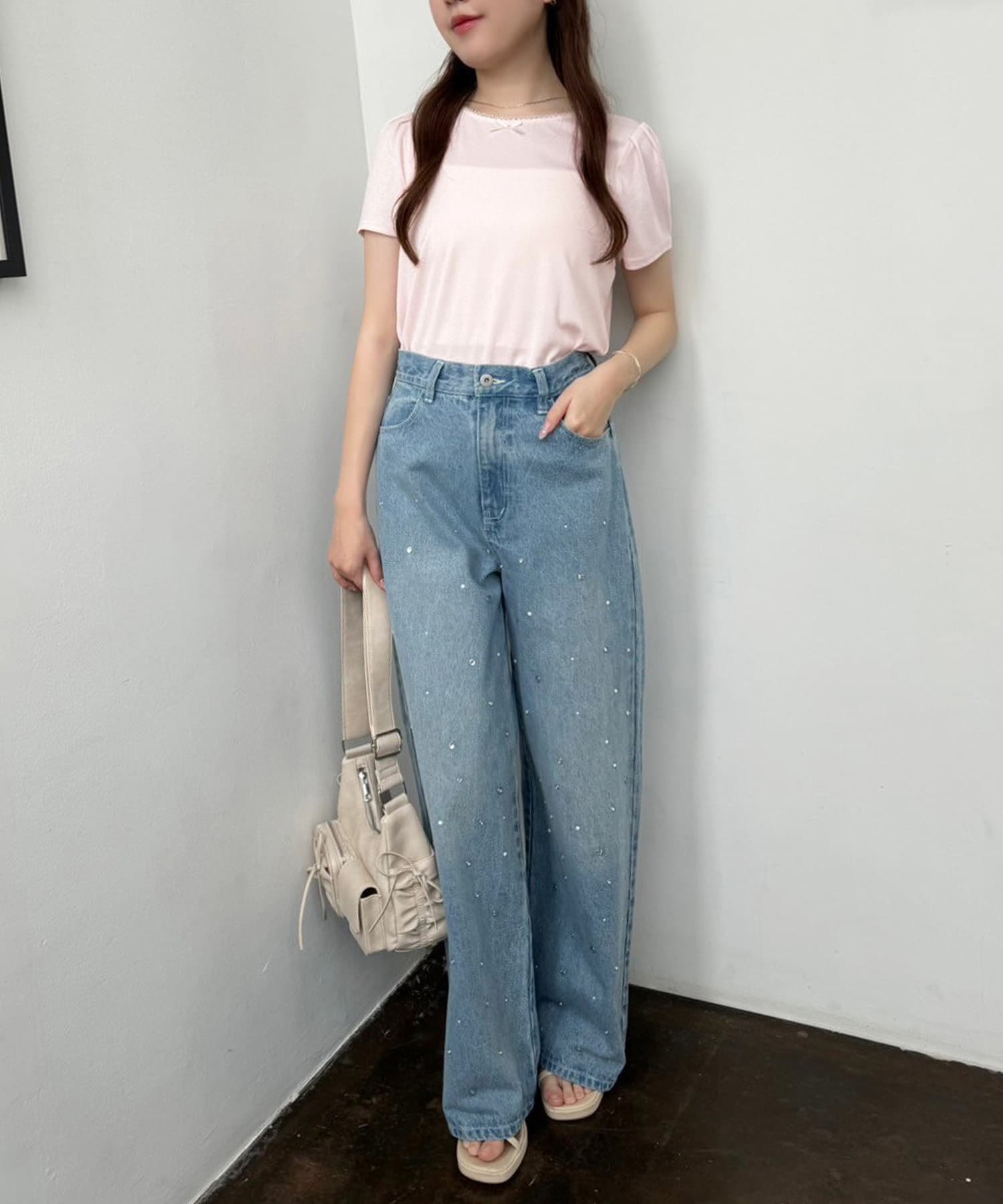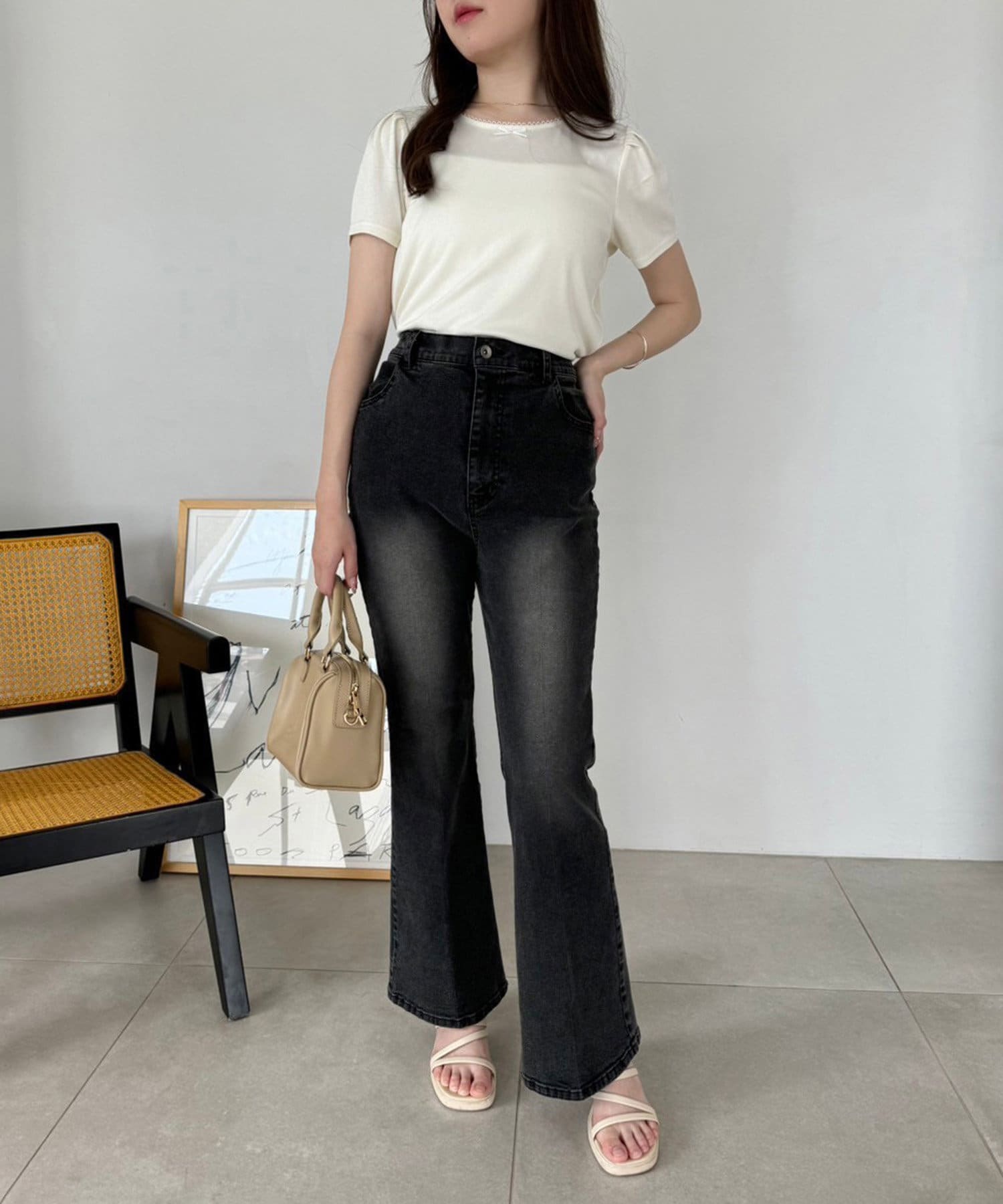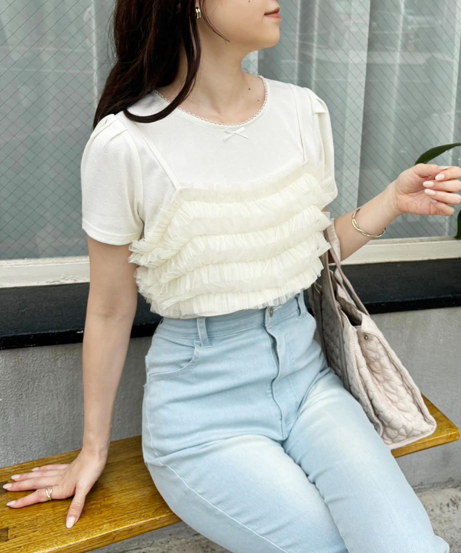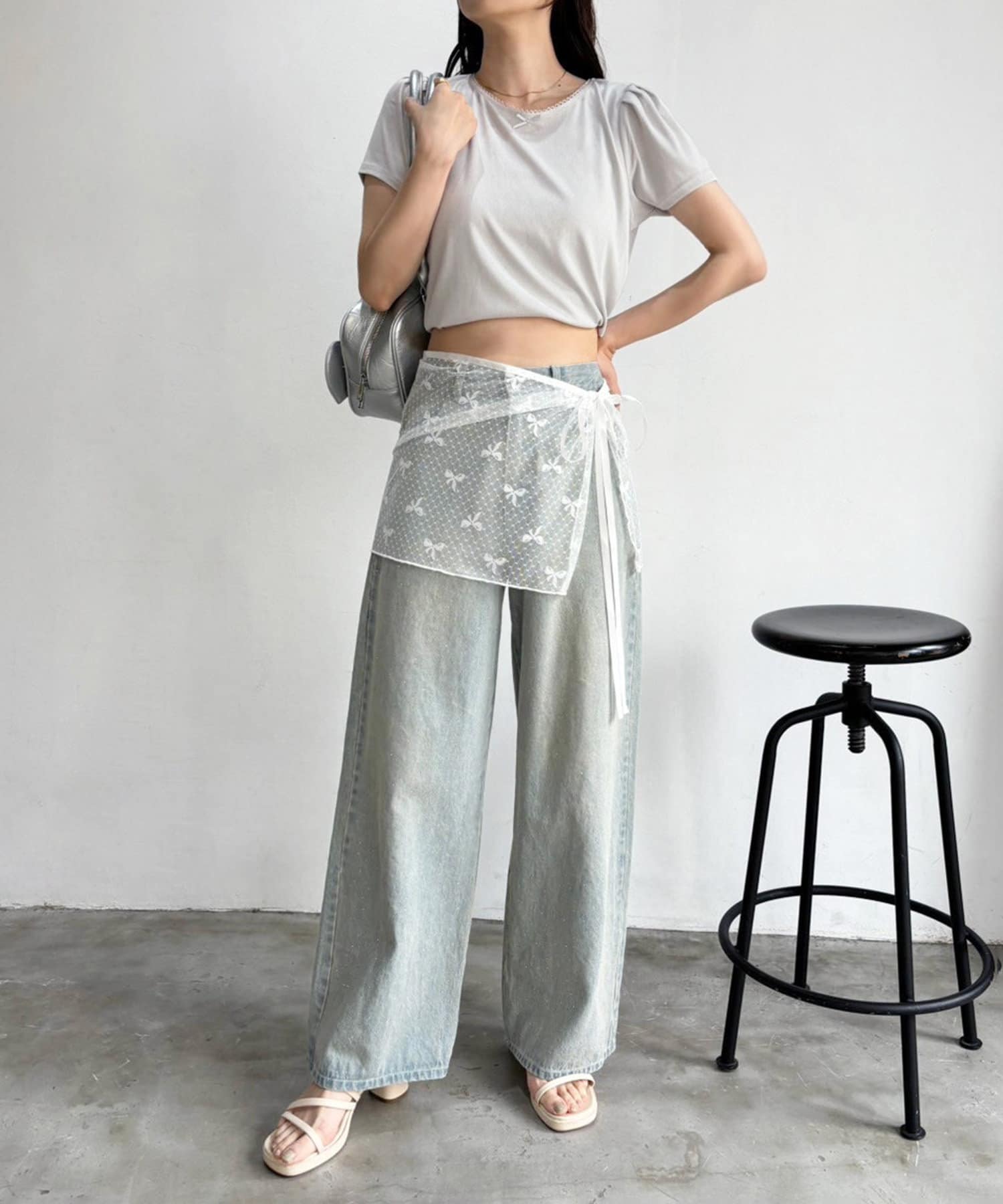 ガーリーなトップスだからこそあえてデニムと合わせてカジュアルなスタイリングに。