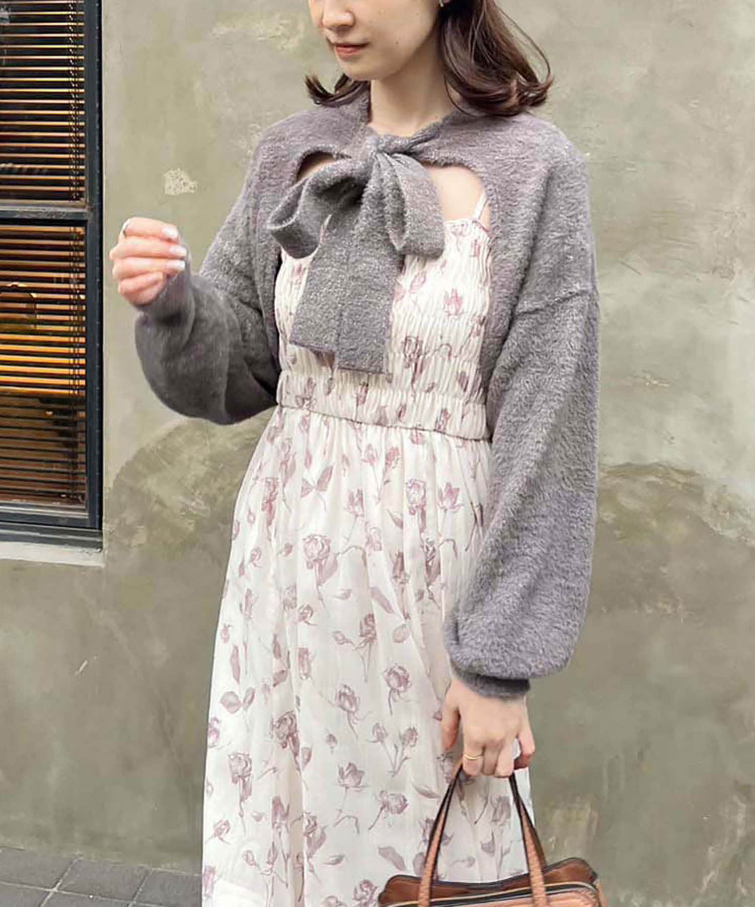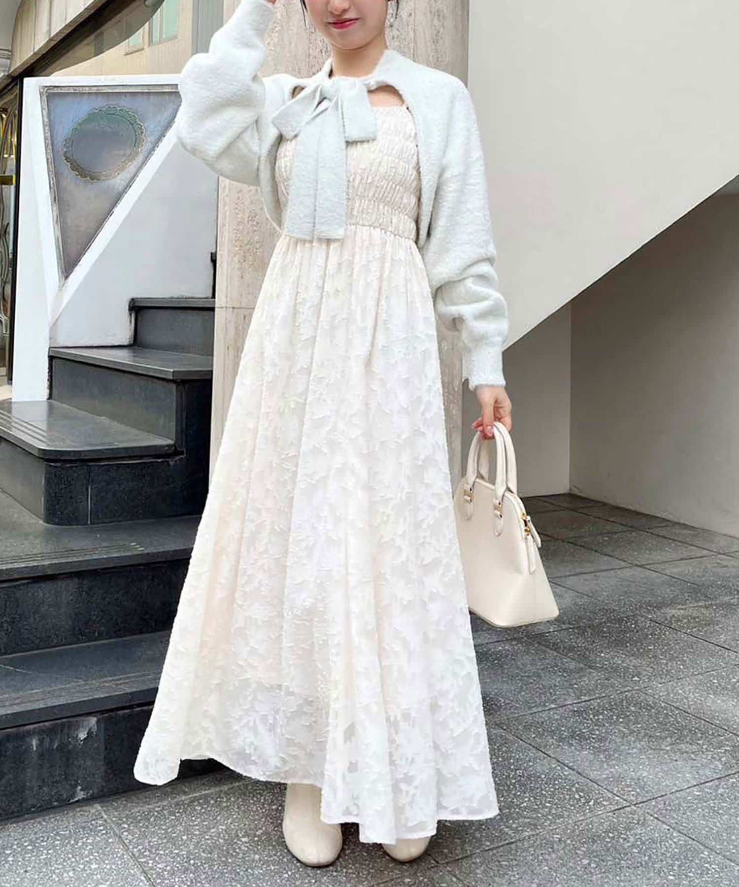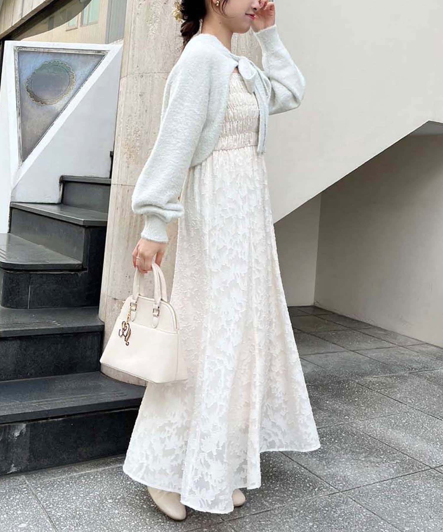 胸元にシャーリングを施したキャミワンピース×ボレロのセットアイテム