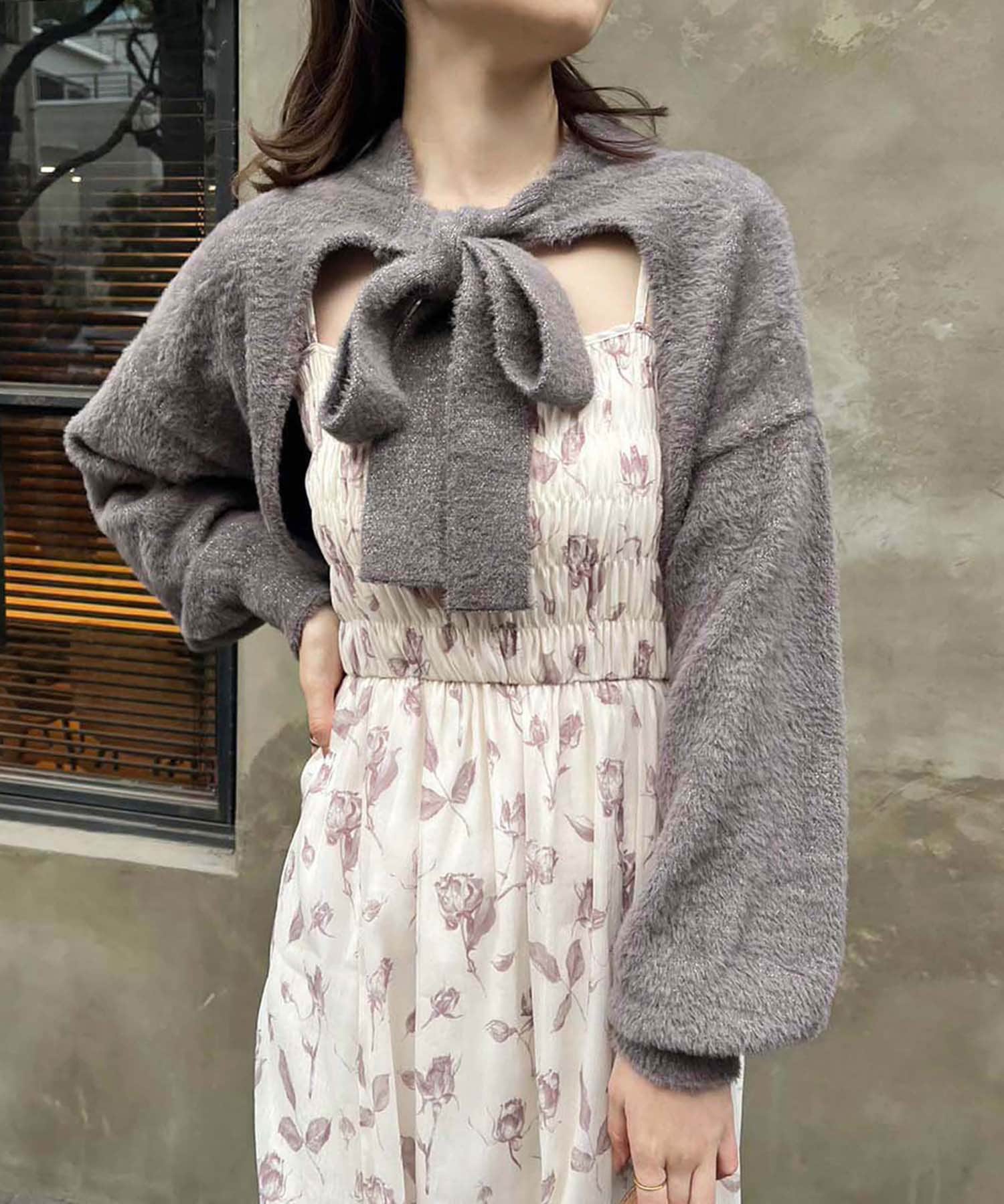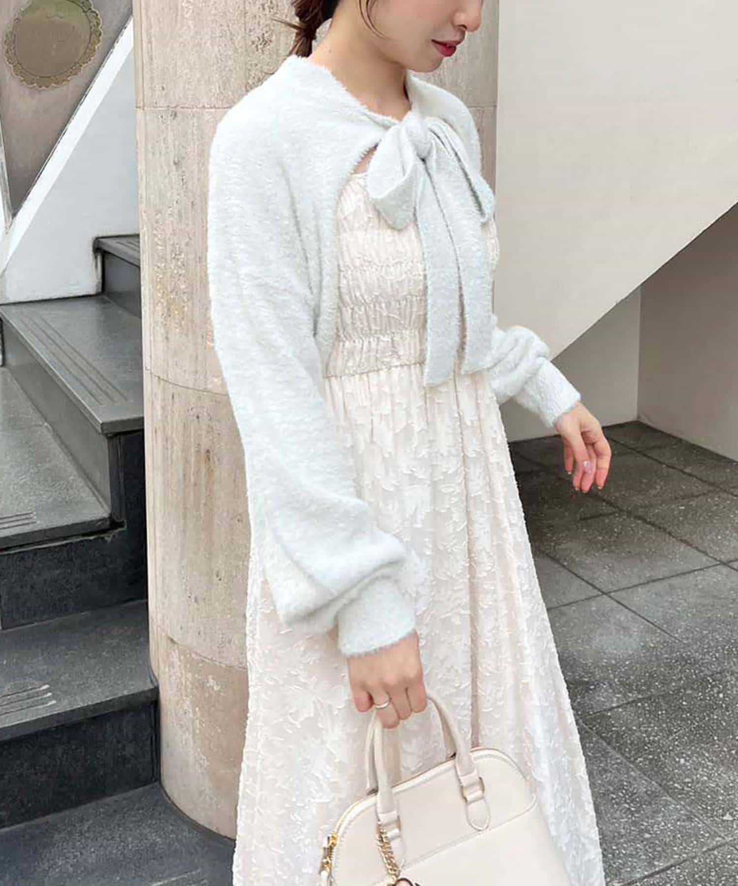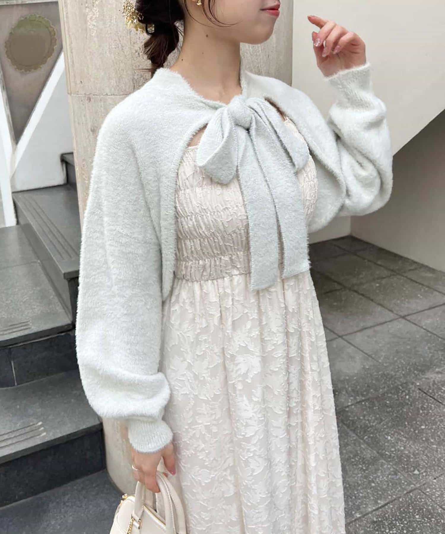 ニットボレロは肌ざわりの良いフェザーニットで前後どちらが前でもお使い頂けます。