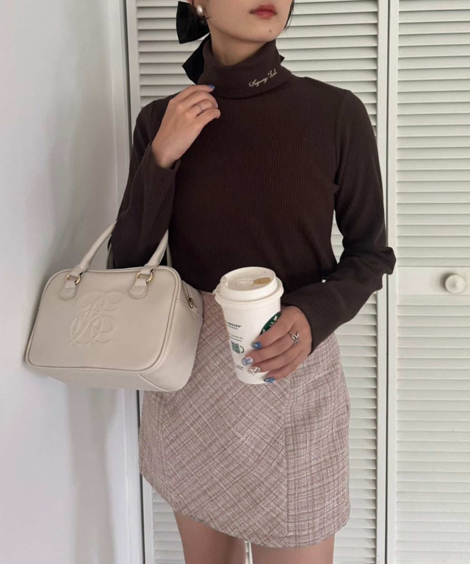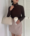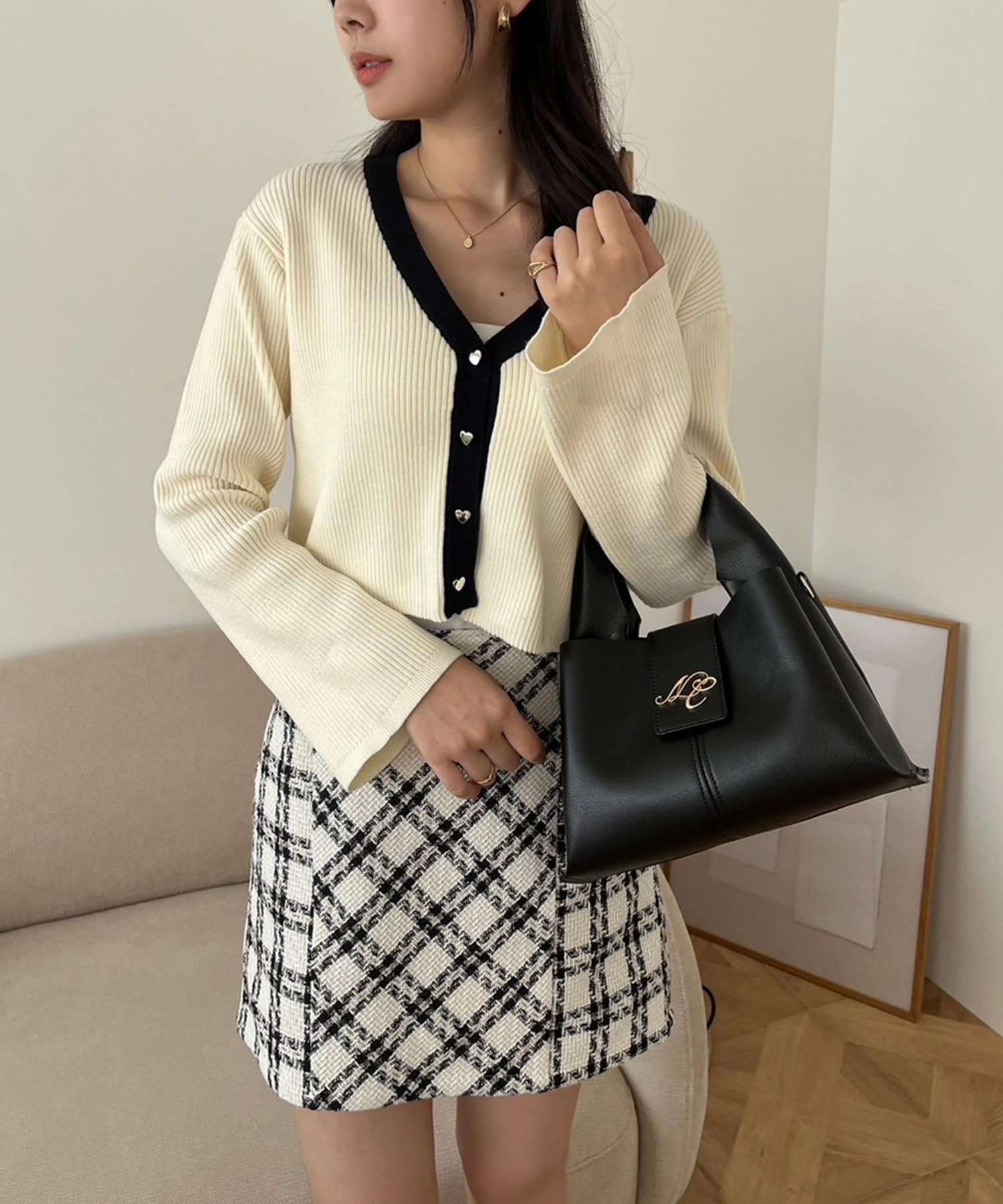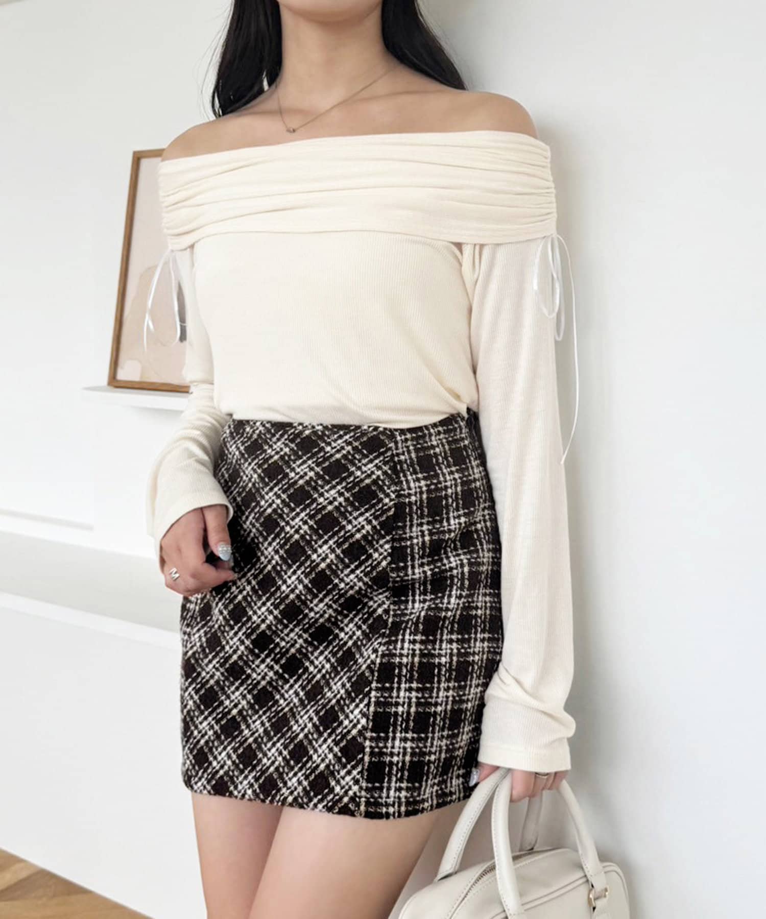 大きめなダボっとニットやトレーナーと合わせて上品なチェックをチラ見せさせた着こなしもオススメです。