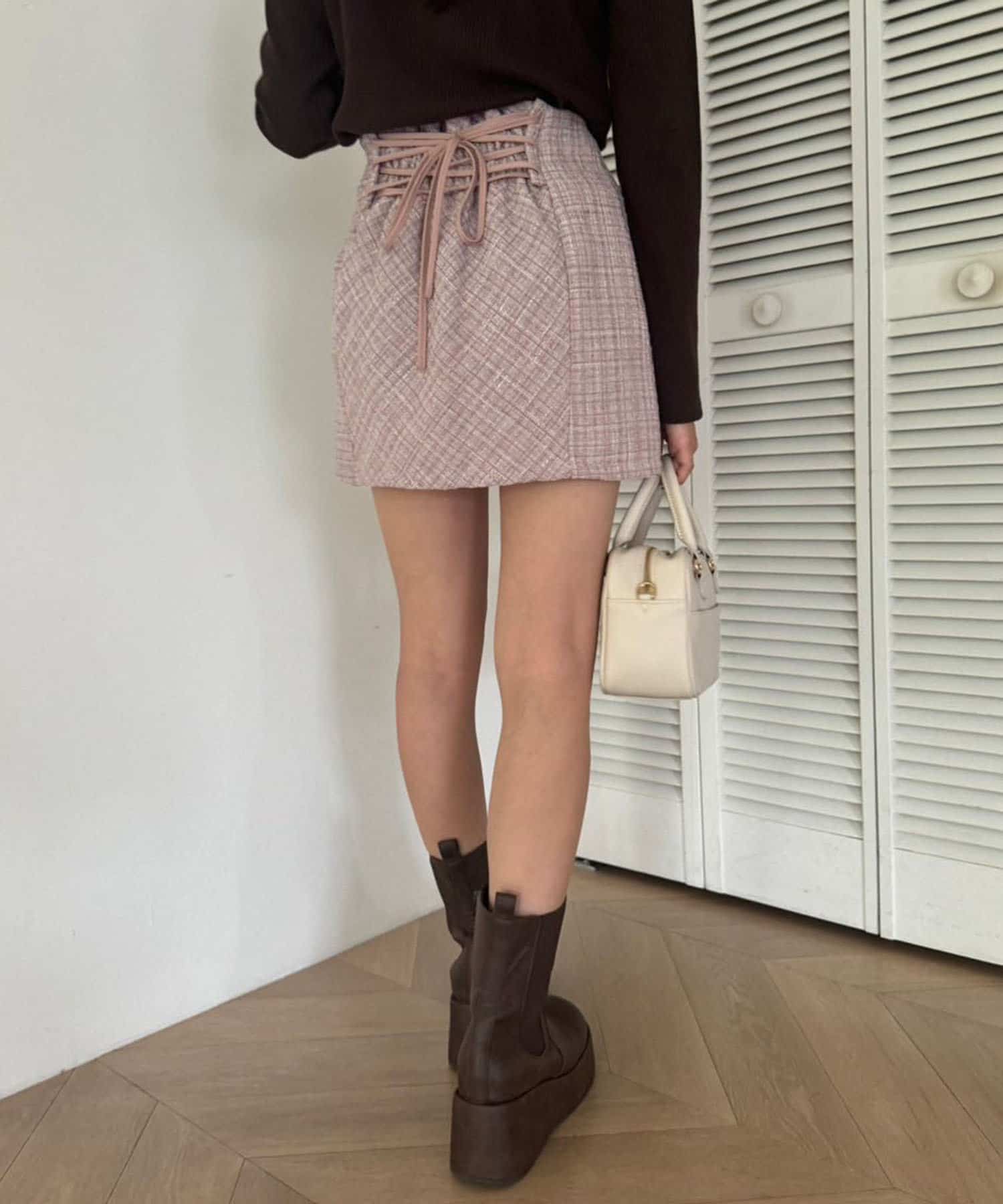 後ろがレースアップデザインなので、スッキリコンパクトなニットトップスなどとの相性が◎