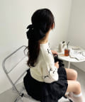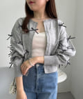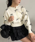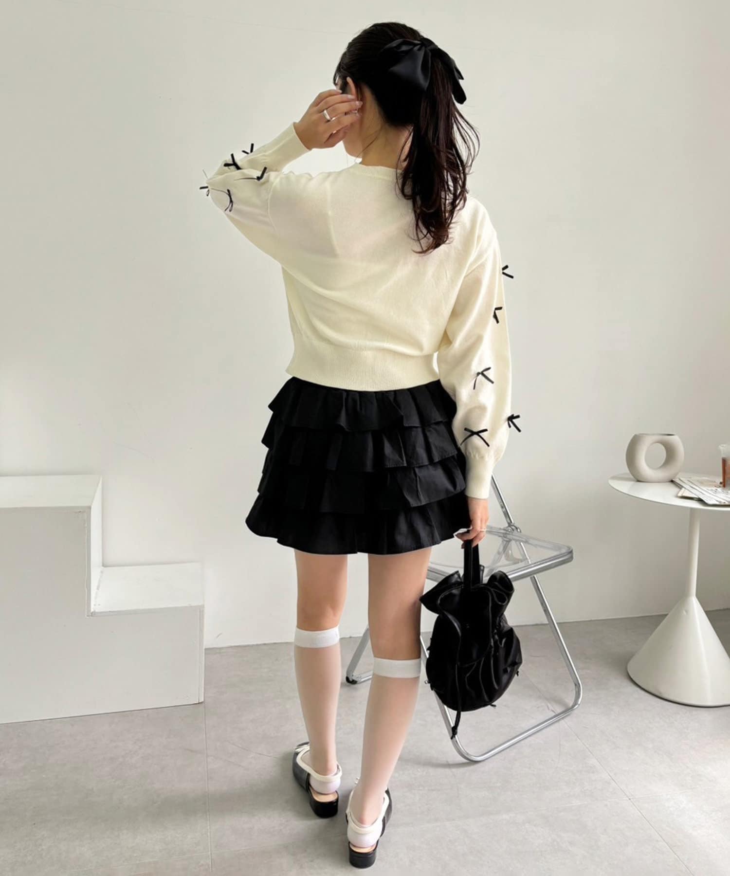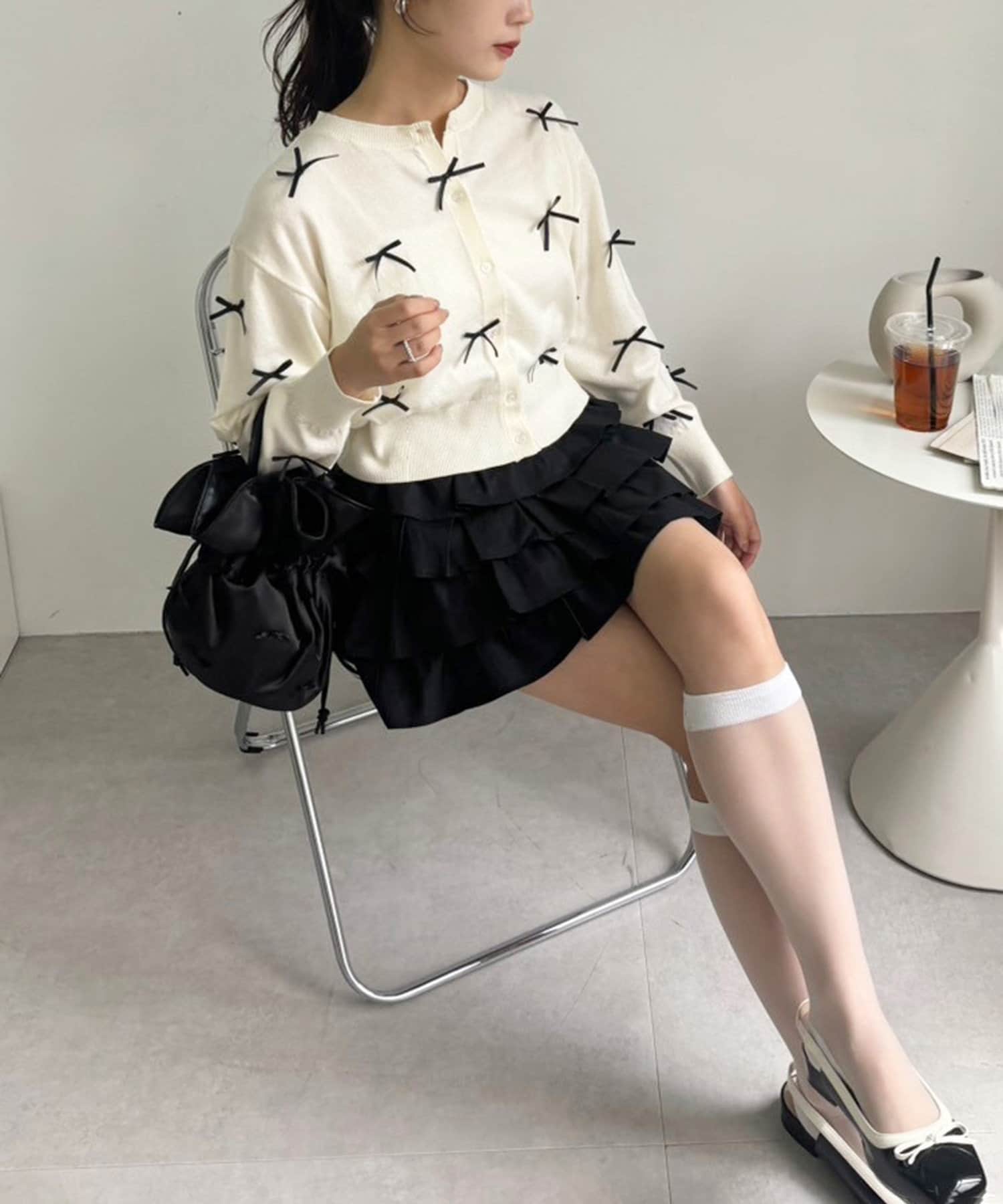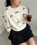 リボンが可愛らしいアイテムなので、ミニボトム合わせでフェミニンコーデに♪