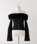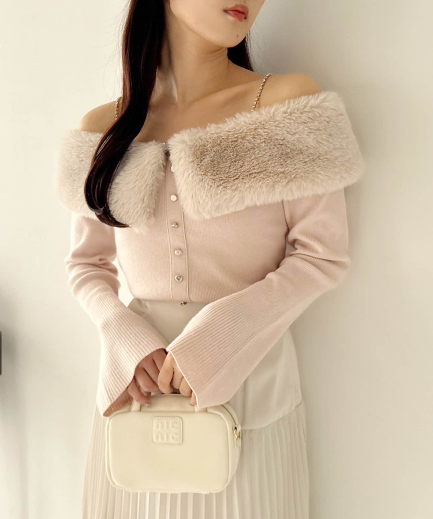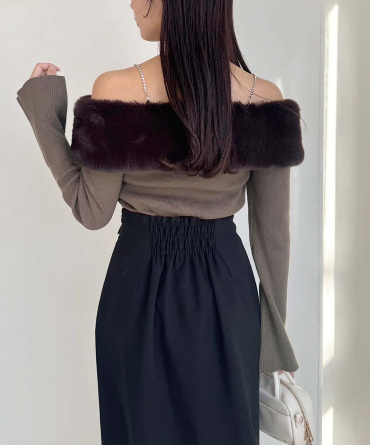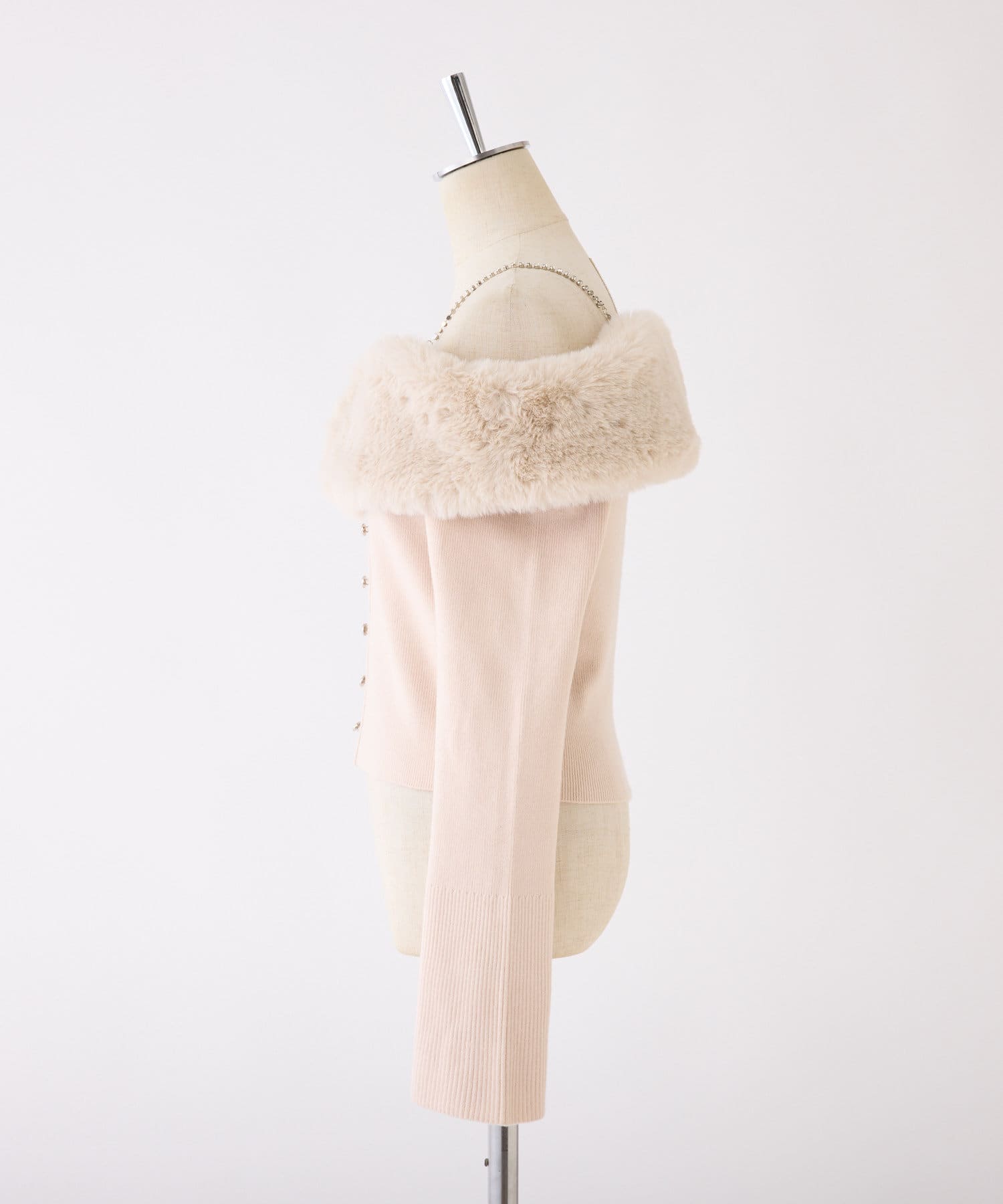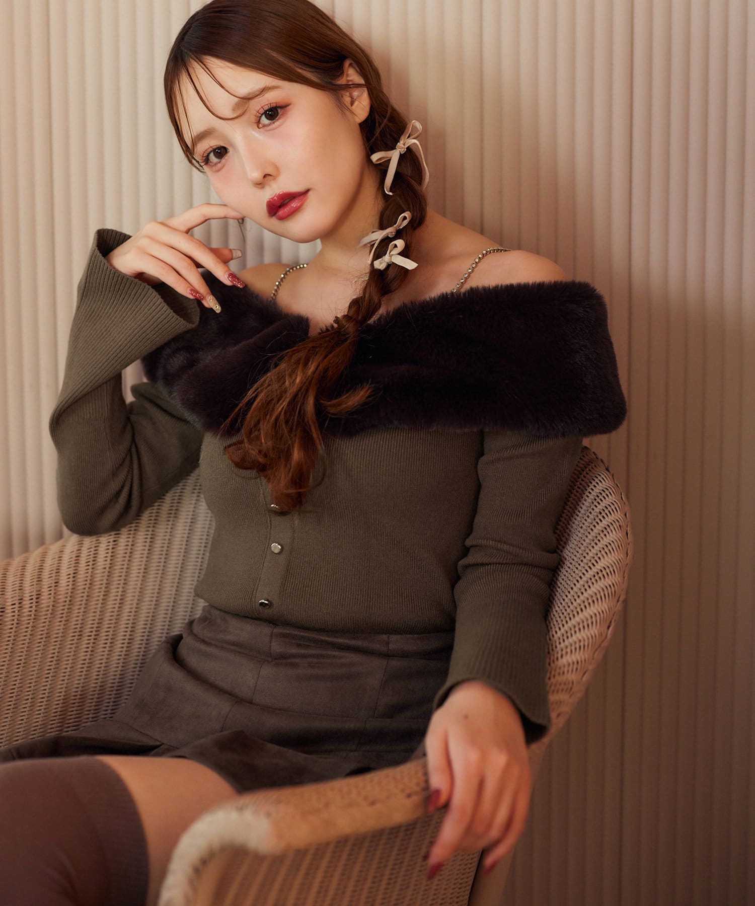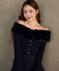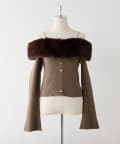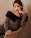 襟元のフェイクファーと肩のビジュー紐が高見えするモテニット
