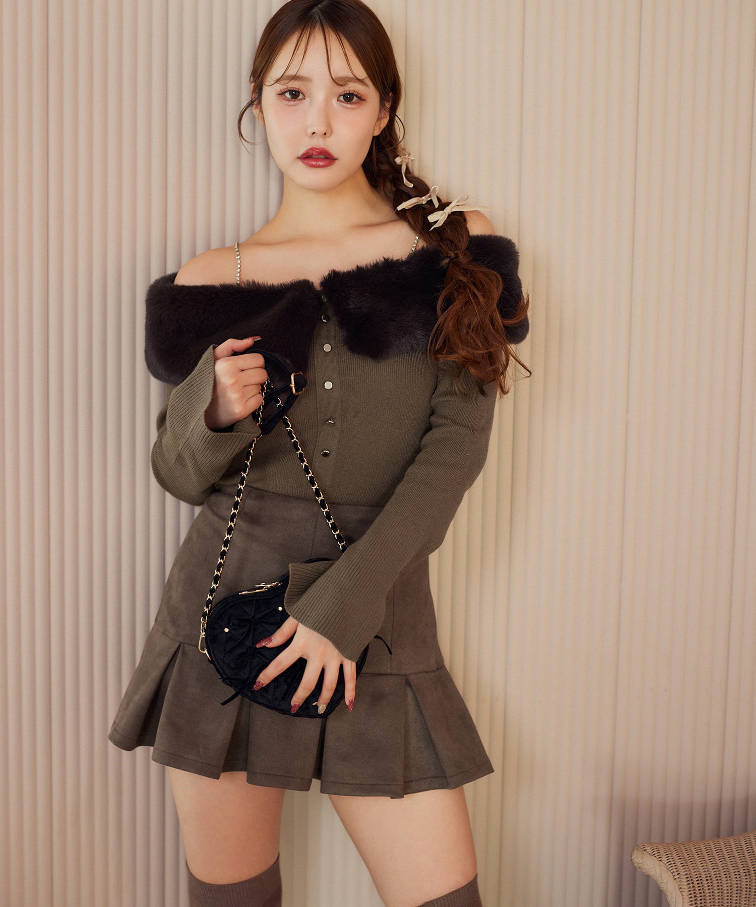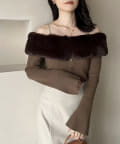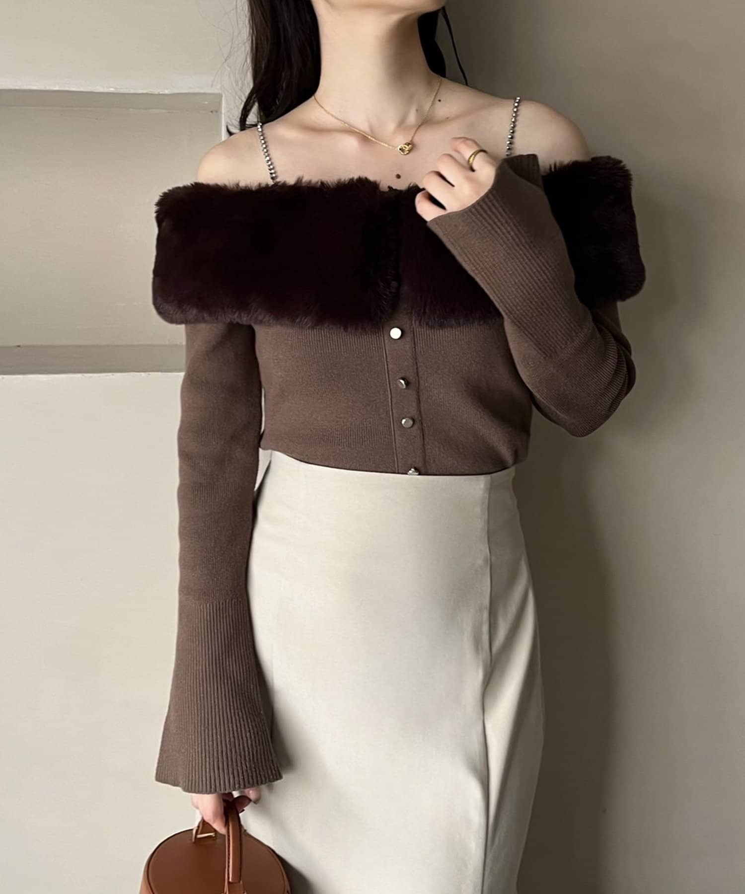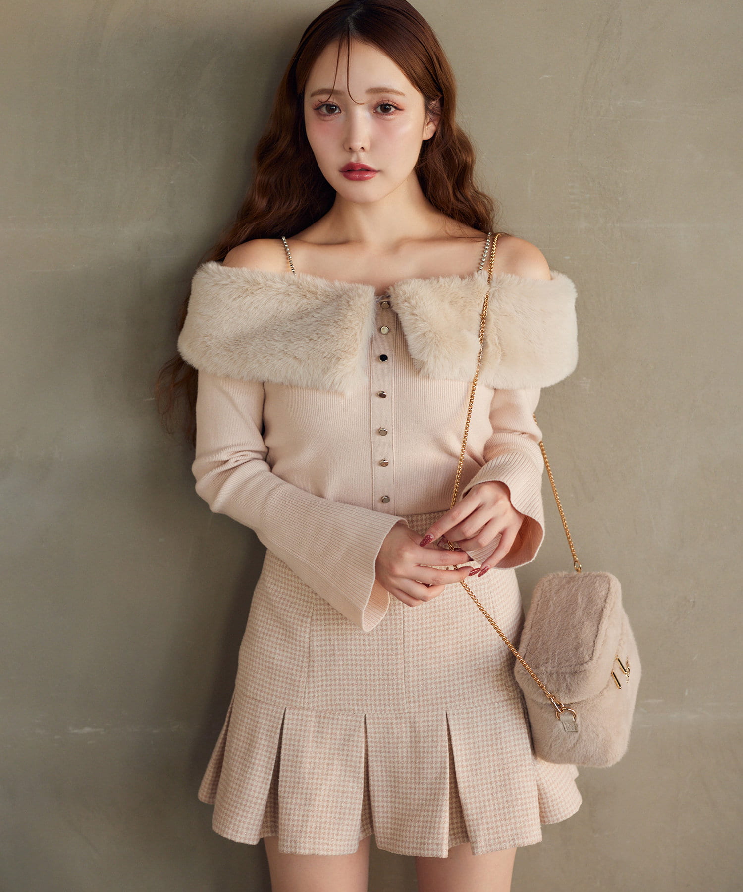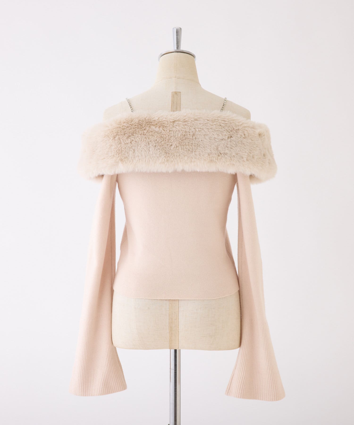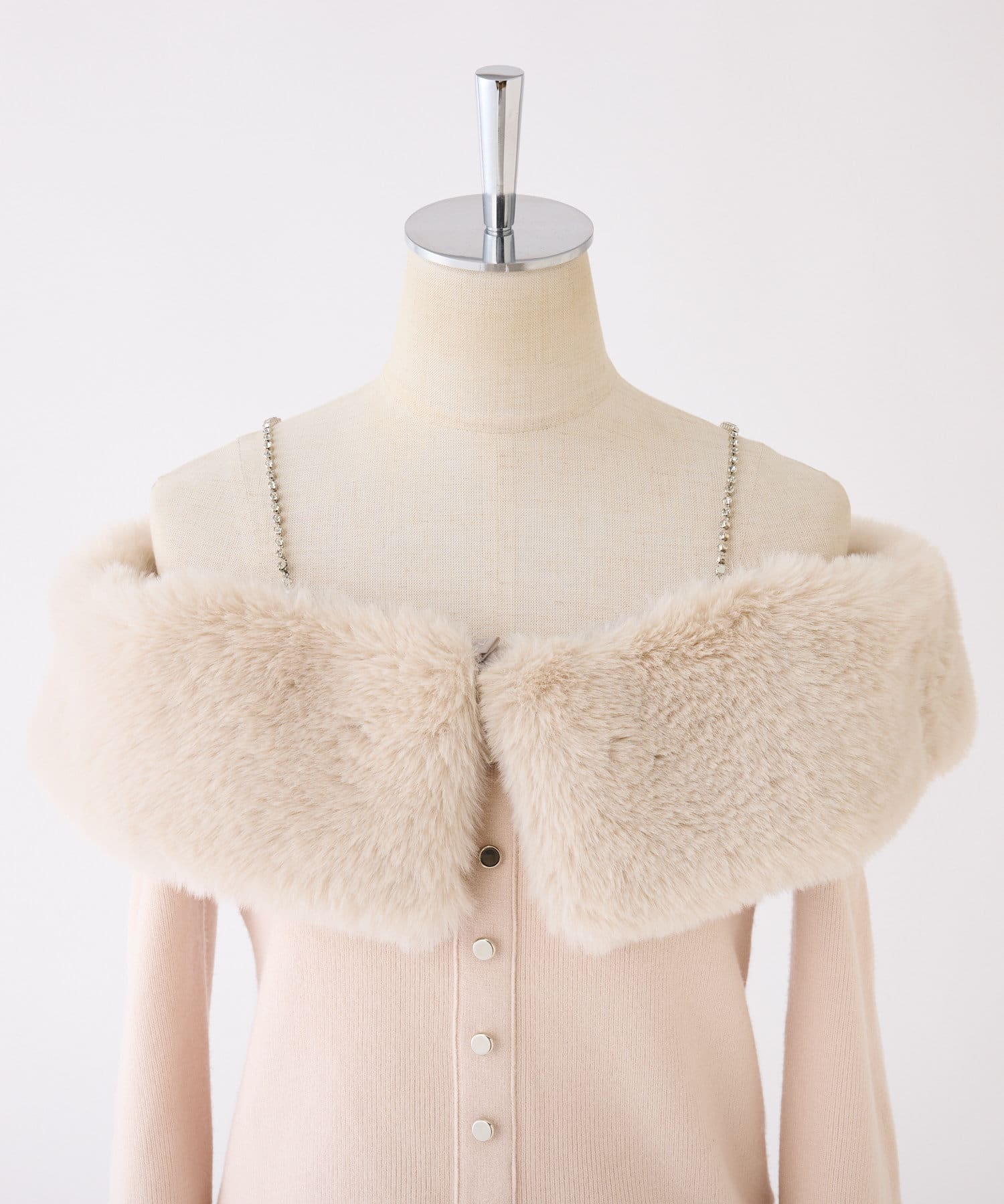 襟元のフェイクファーと肩のビジュー紐が高見えするモテニット