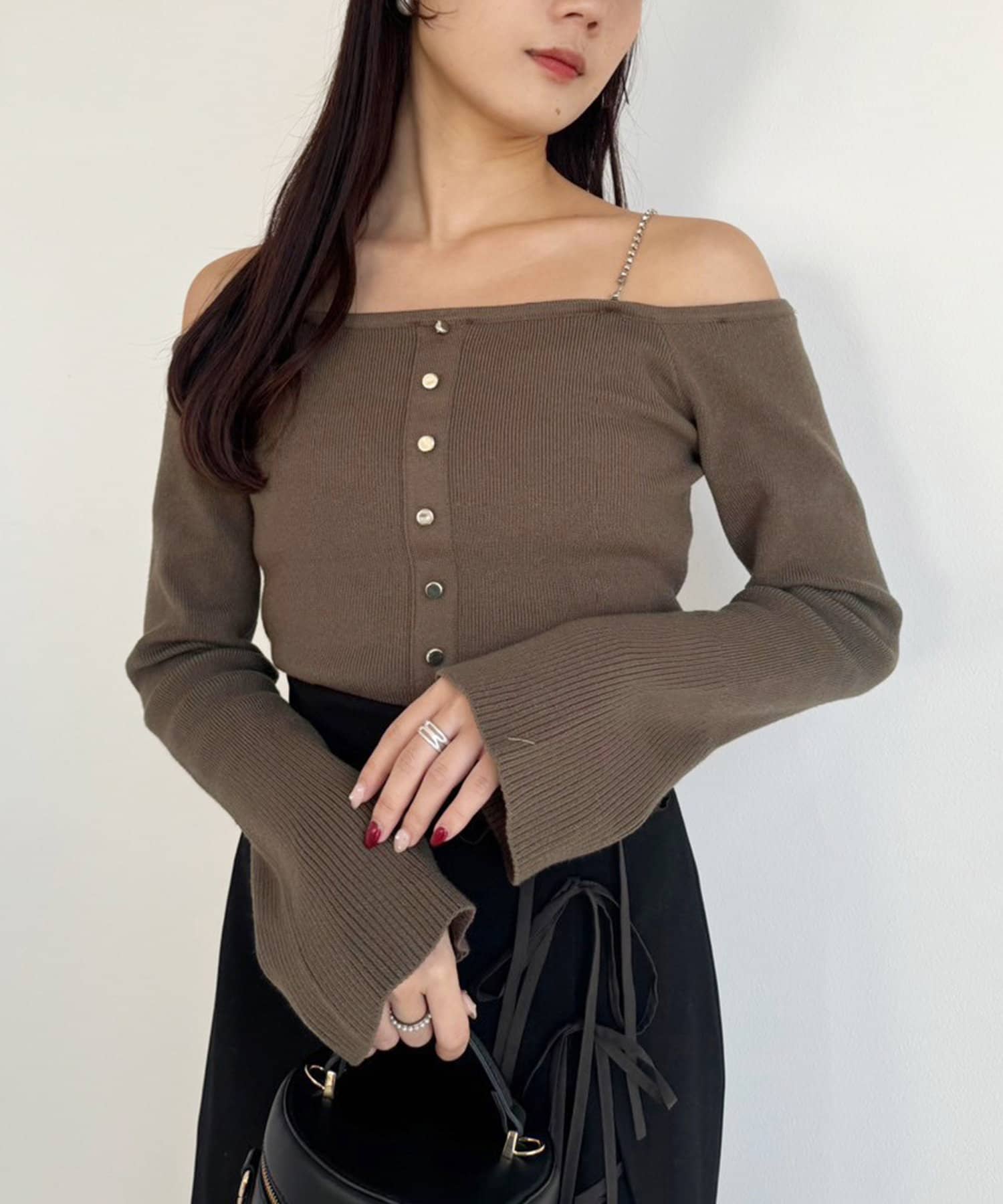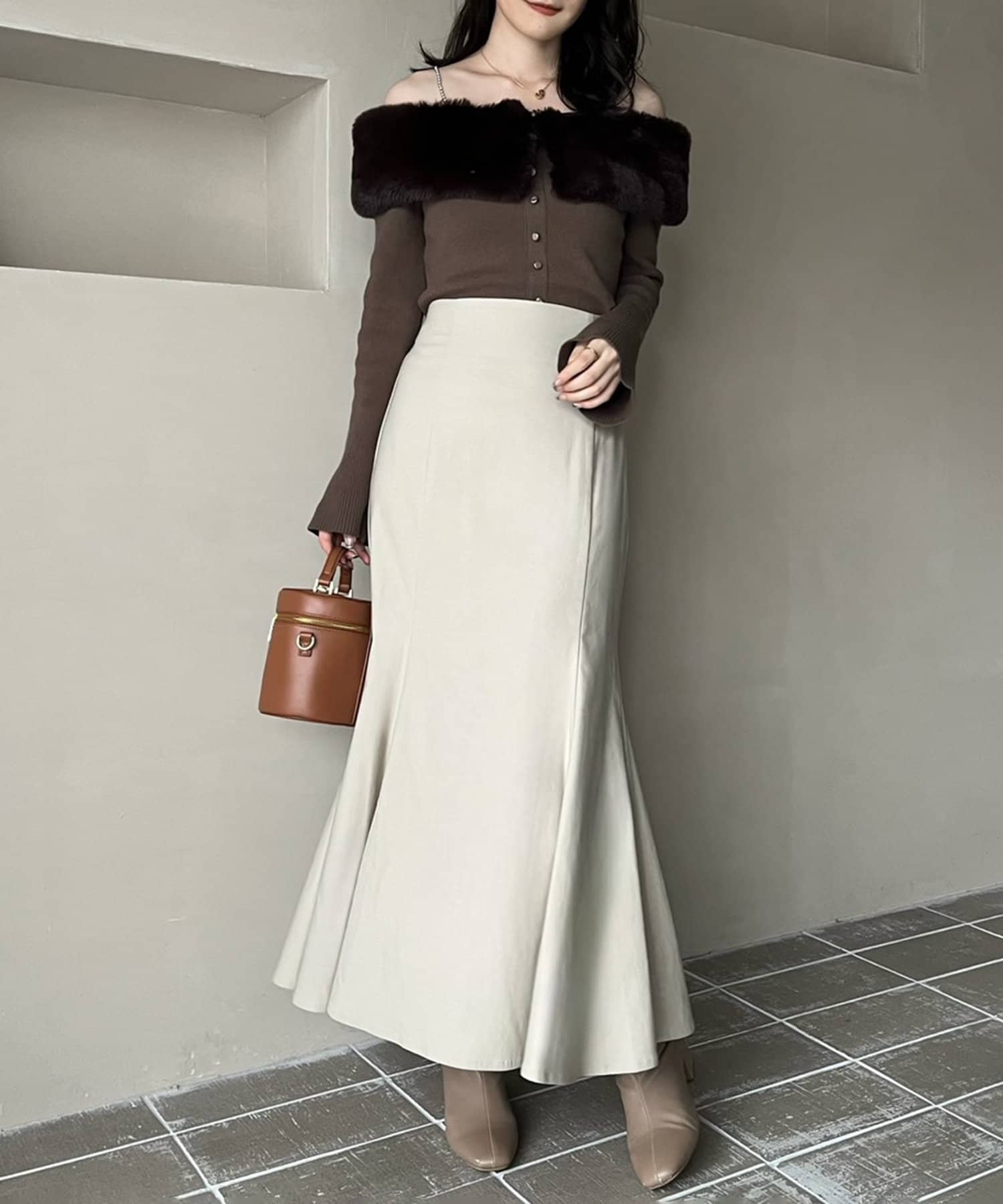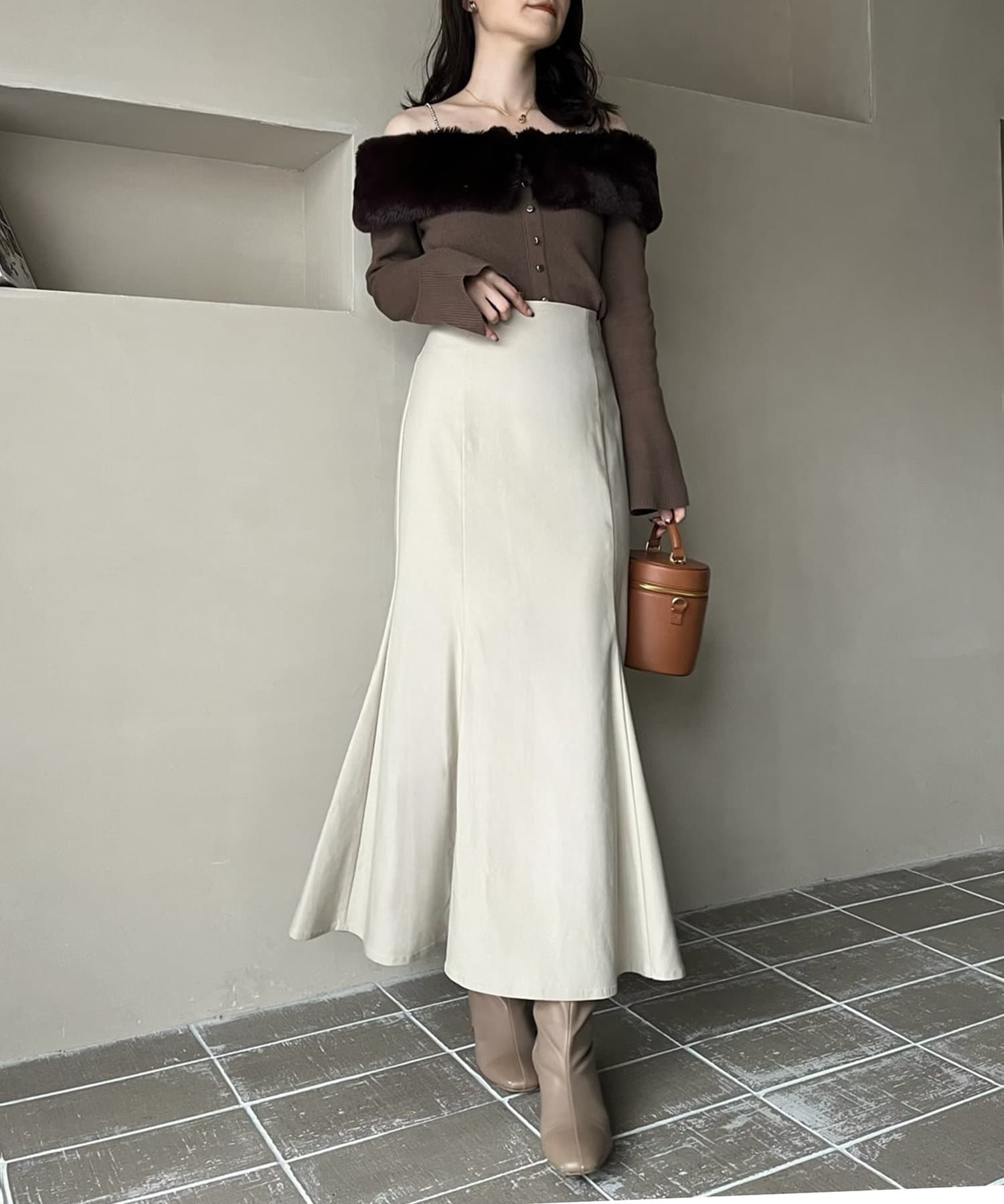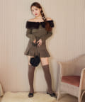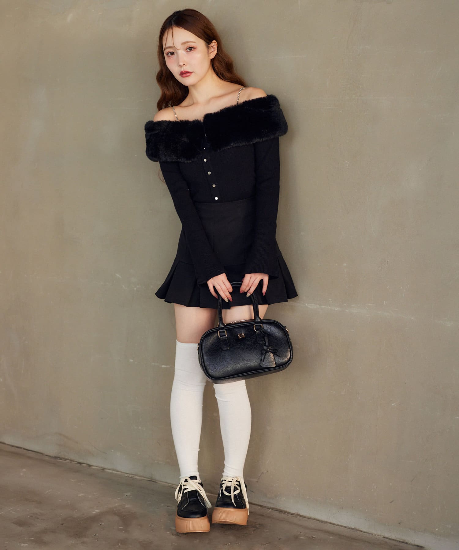 襟元のフェイクファーと肩のビジュー紐が高見えするモテニット