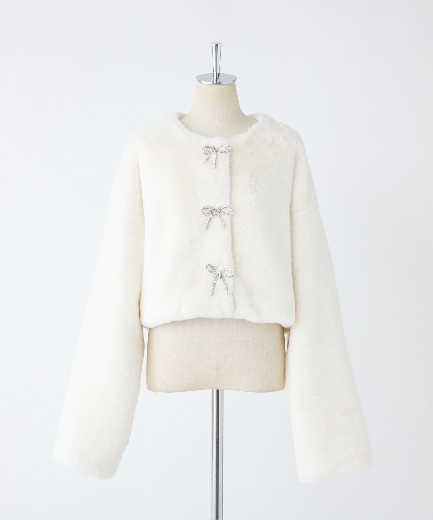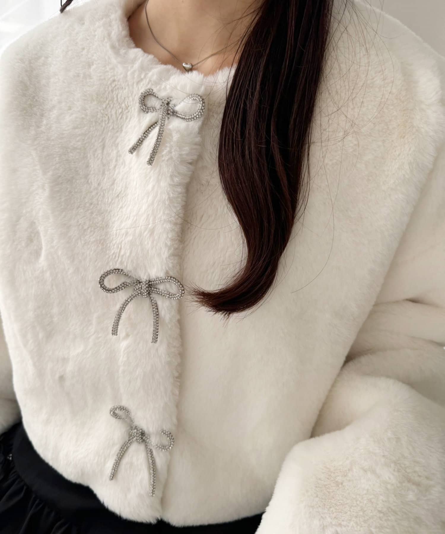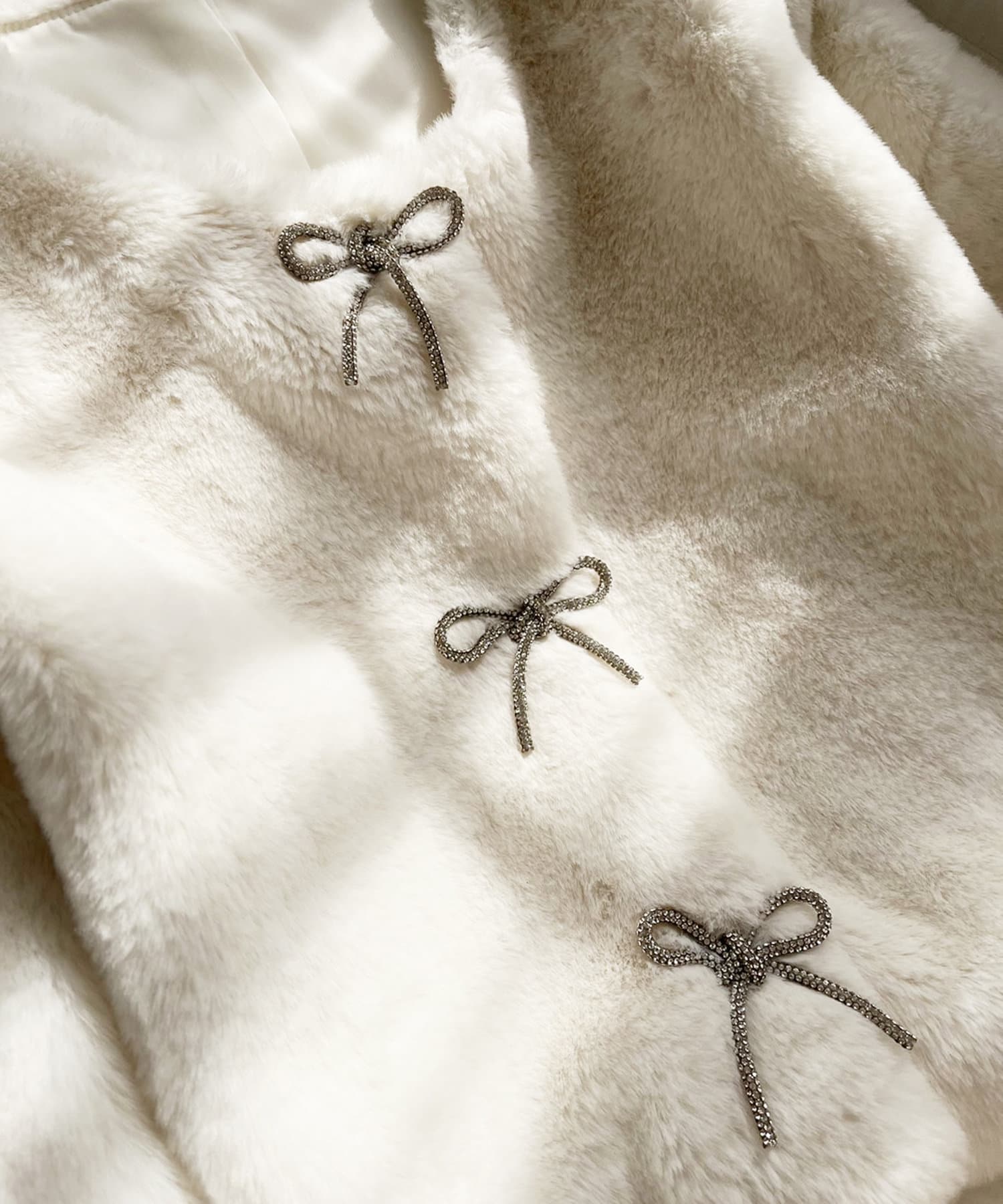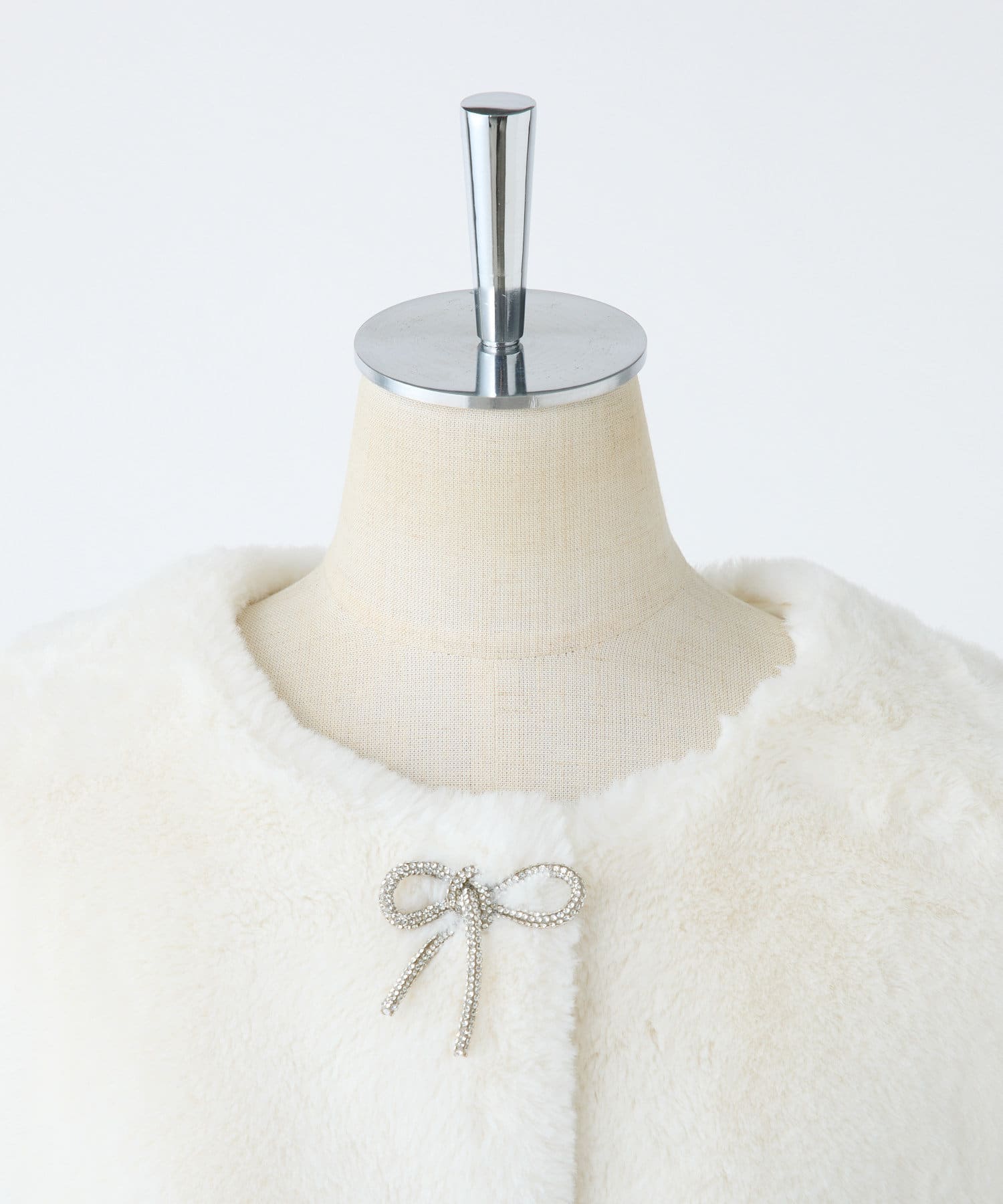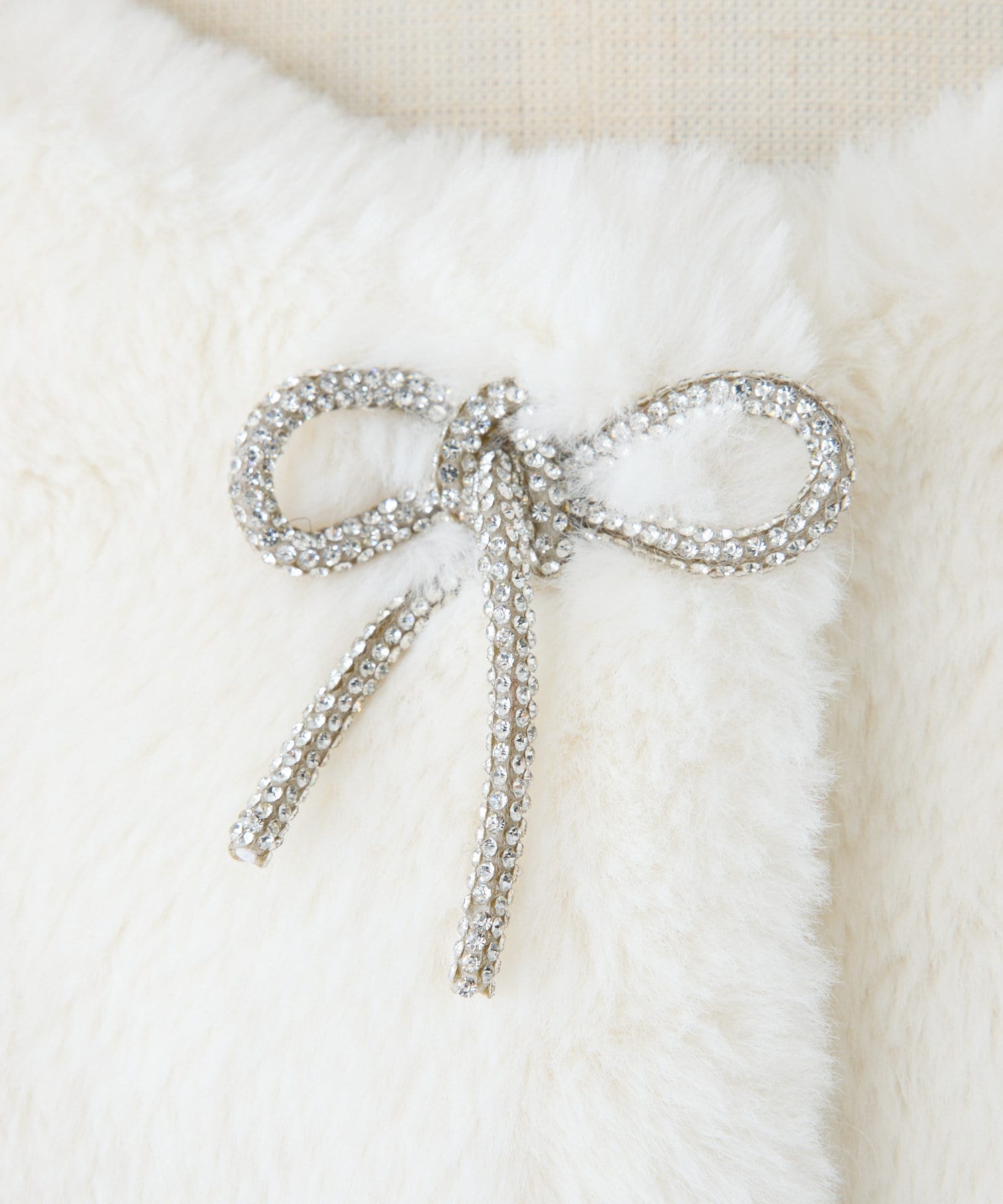 ふんわり柔らかで肌触りも良く、リボンのビジューがポイントのフェイクファーコート