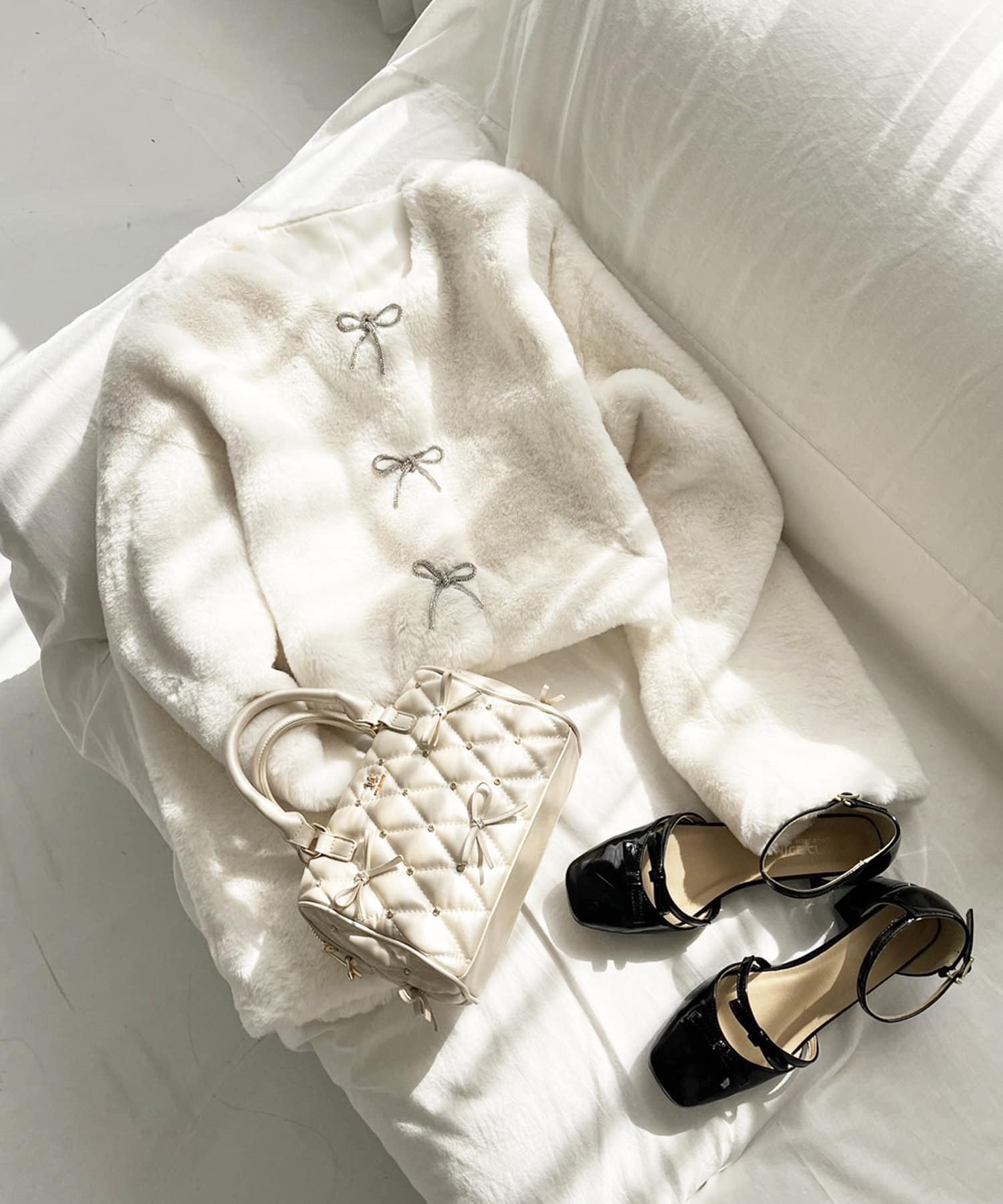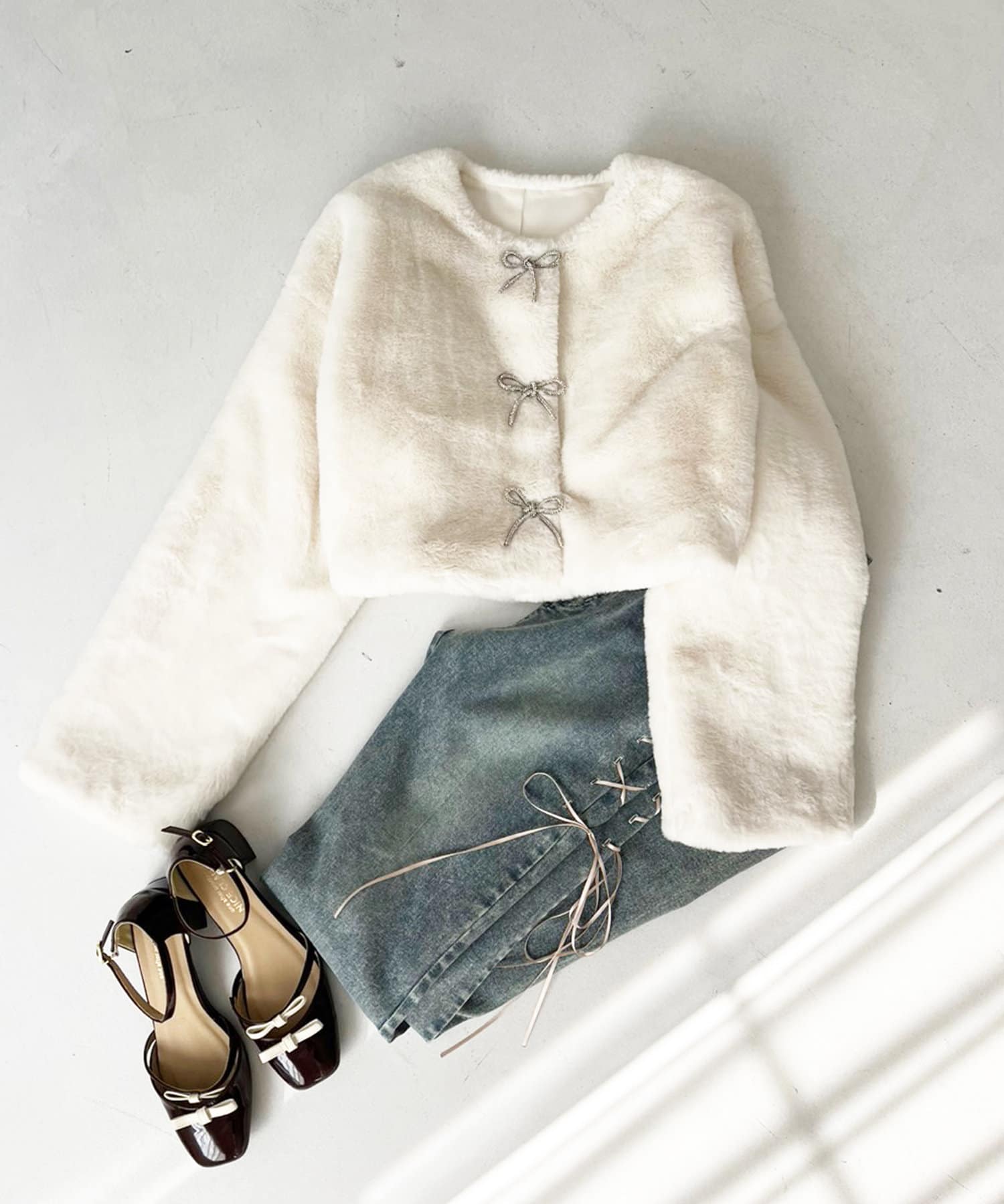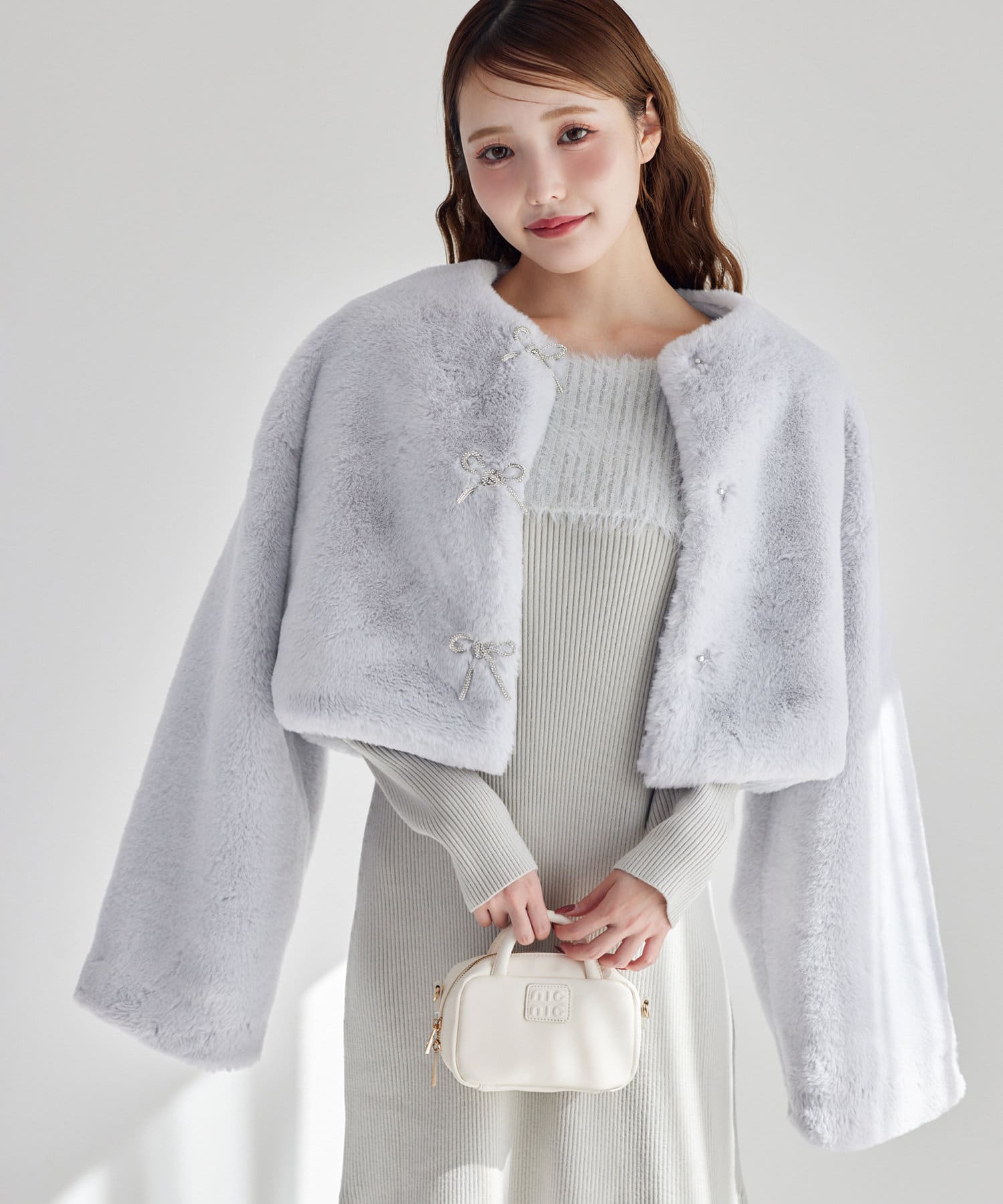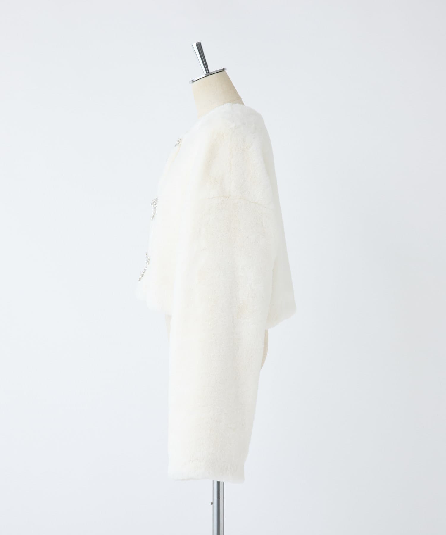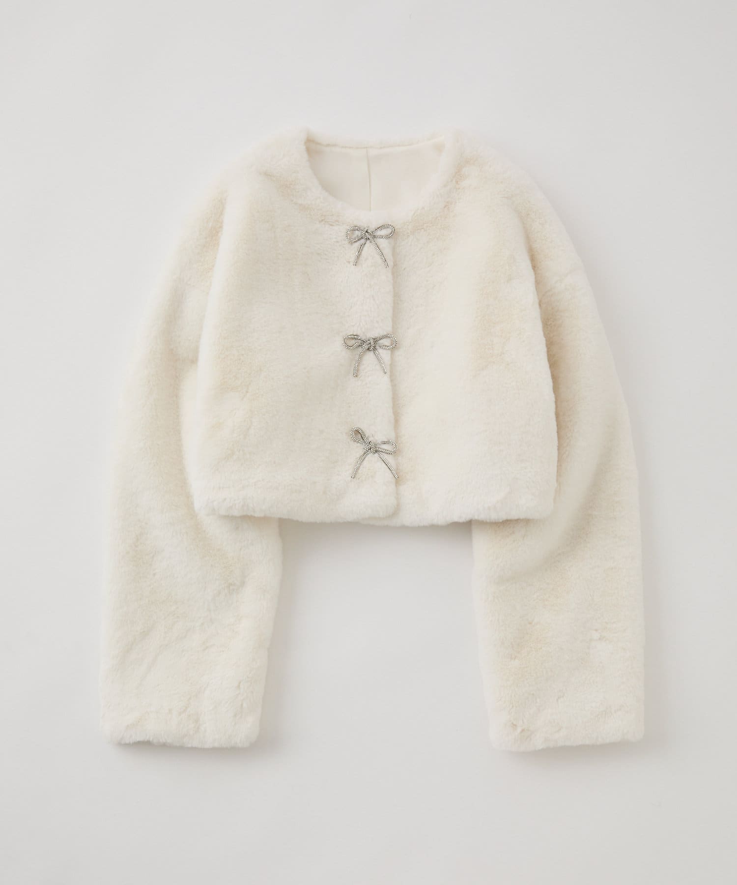 ふんわり柔らかで肌触りも良く、リボンのビジューがポイントのフェイクファーコート