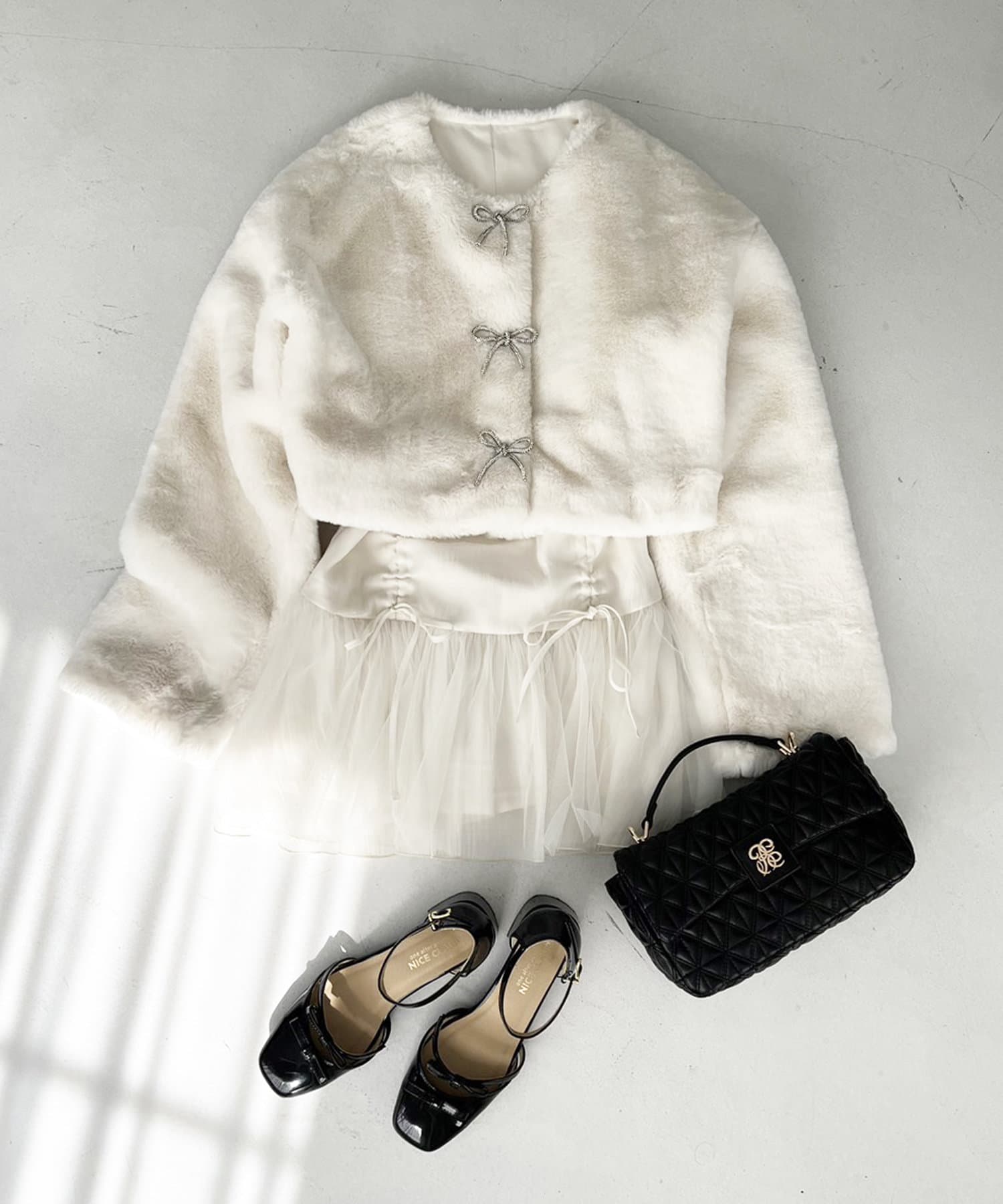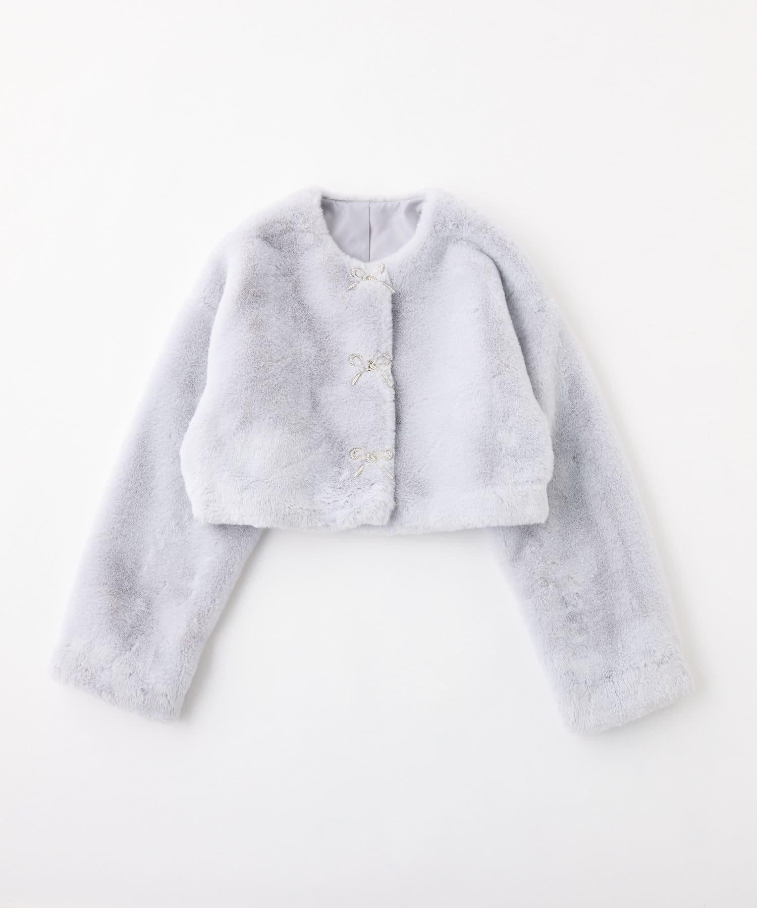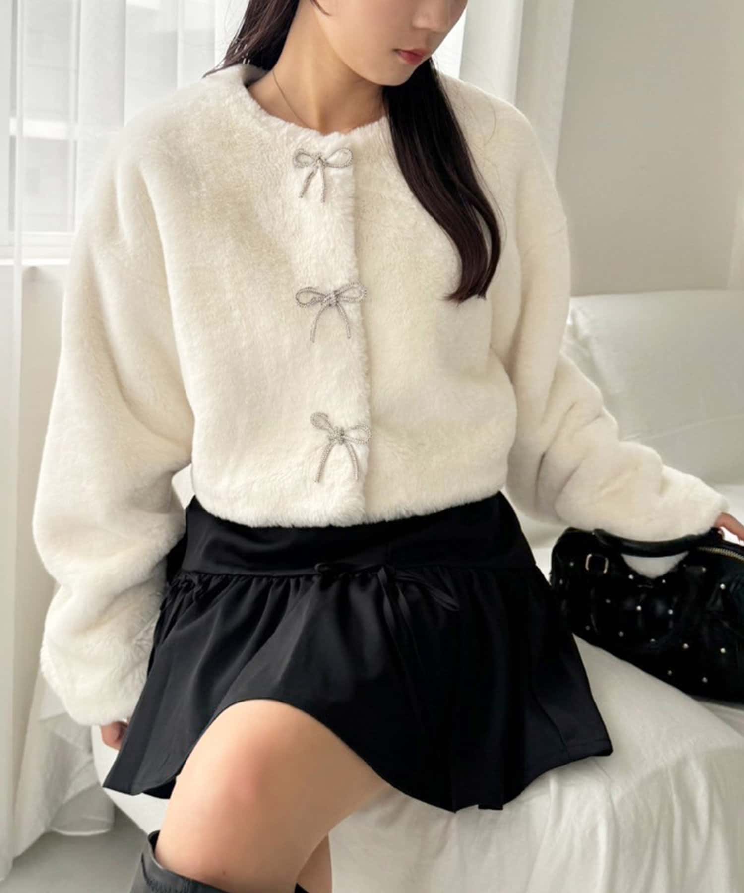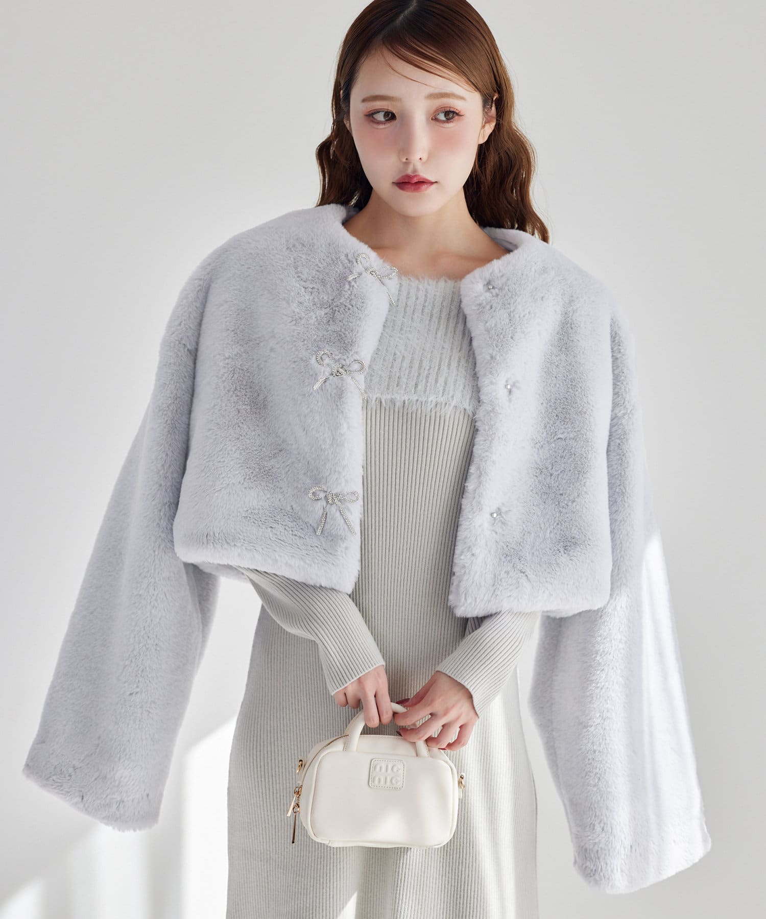 ふんわり柔らかで肌触りも良く、リボンのビジューがポイントのフェイクファーコート