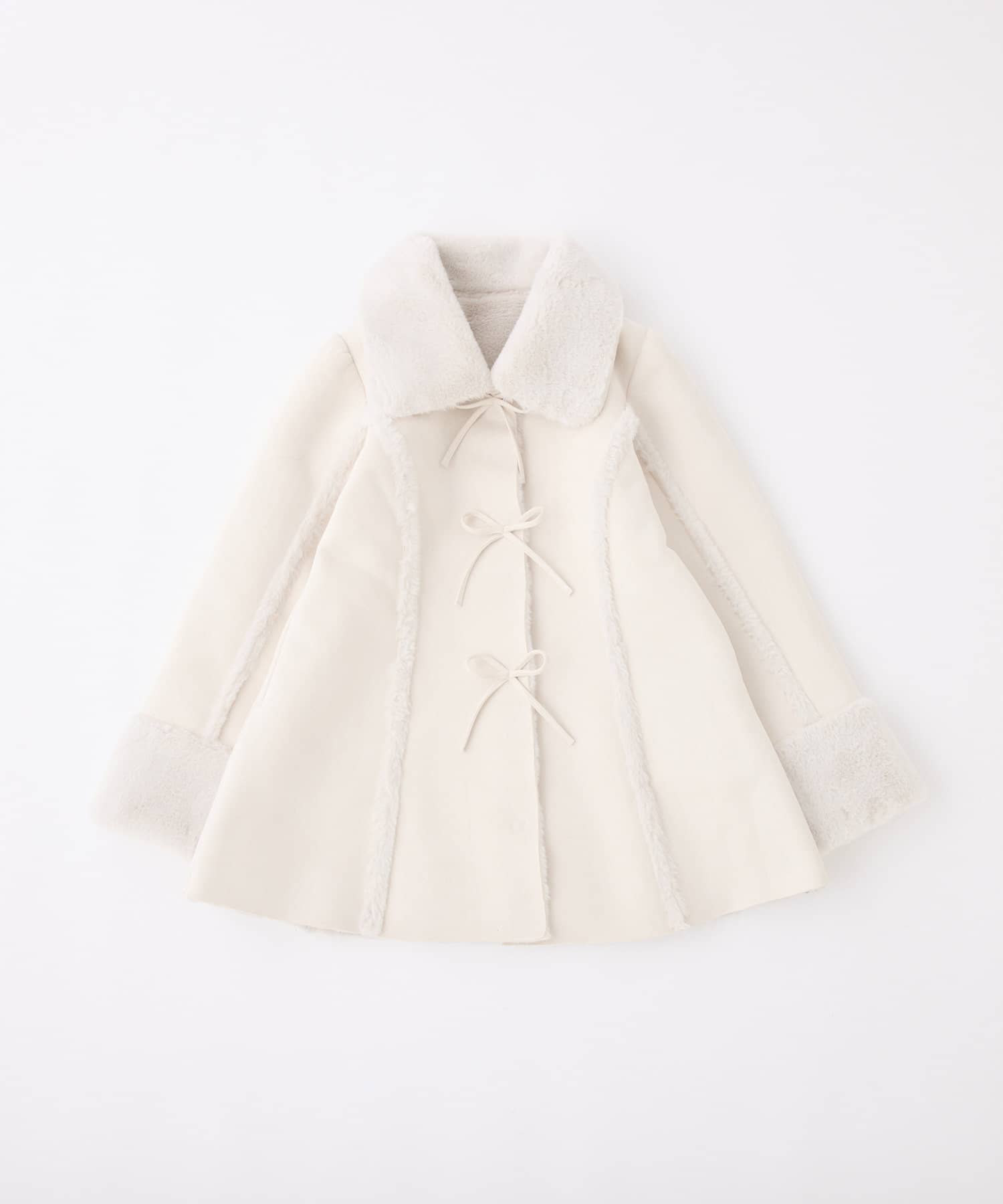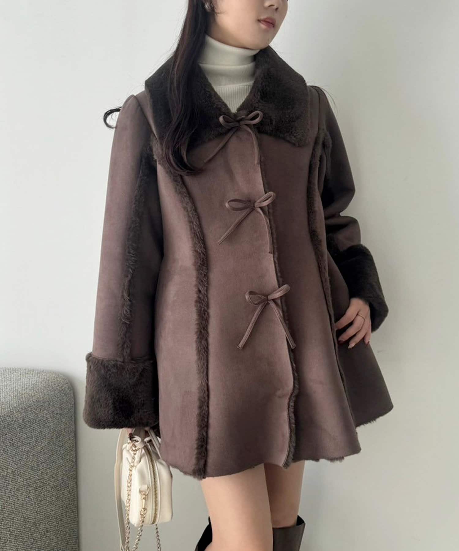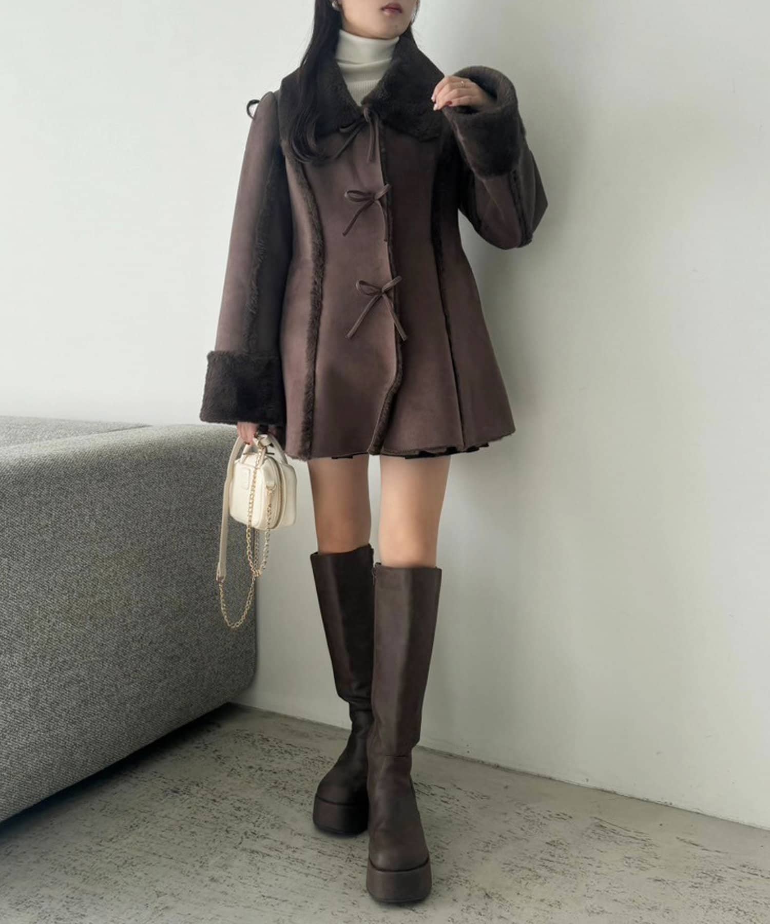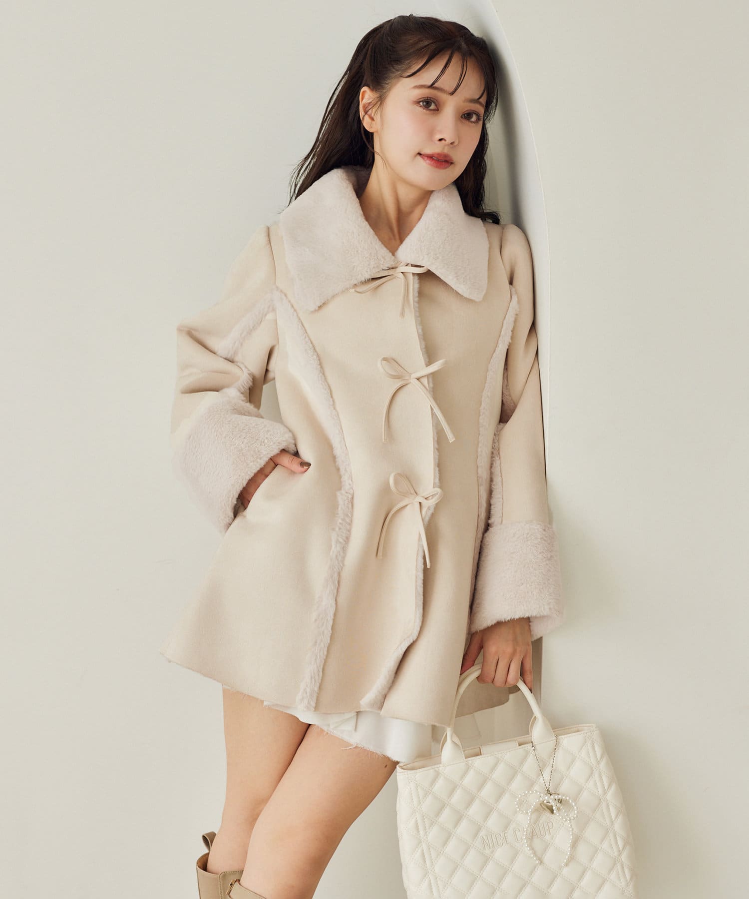 柔らかなムートン素材とリボンディテールが女性らしさを引き立て、