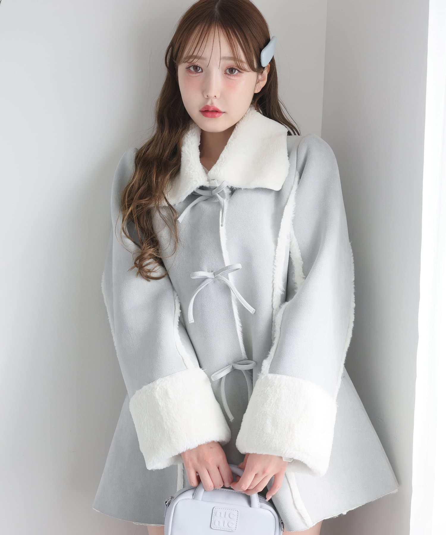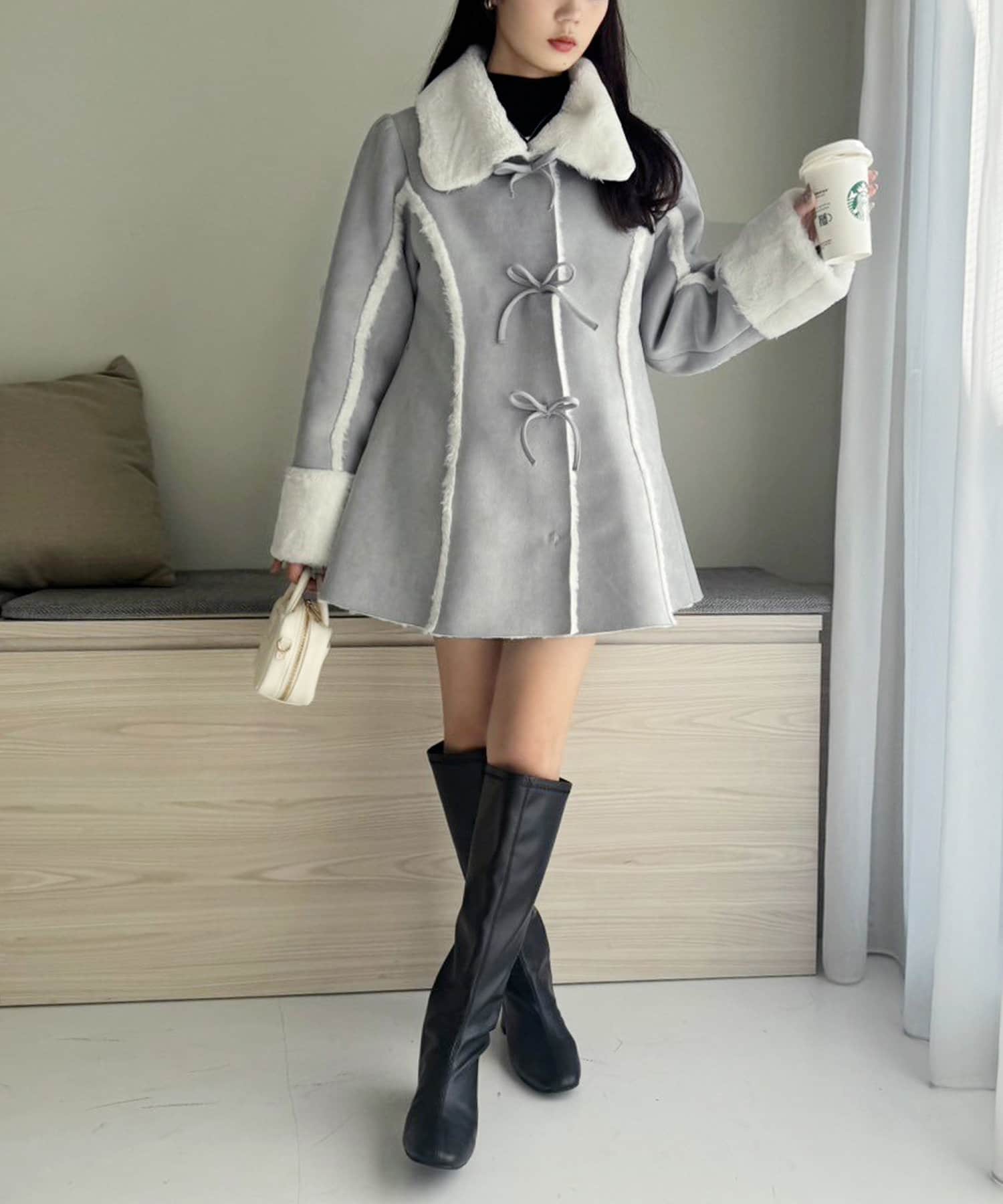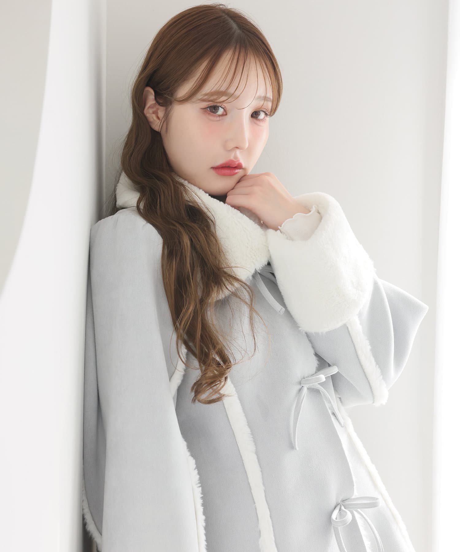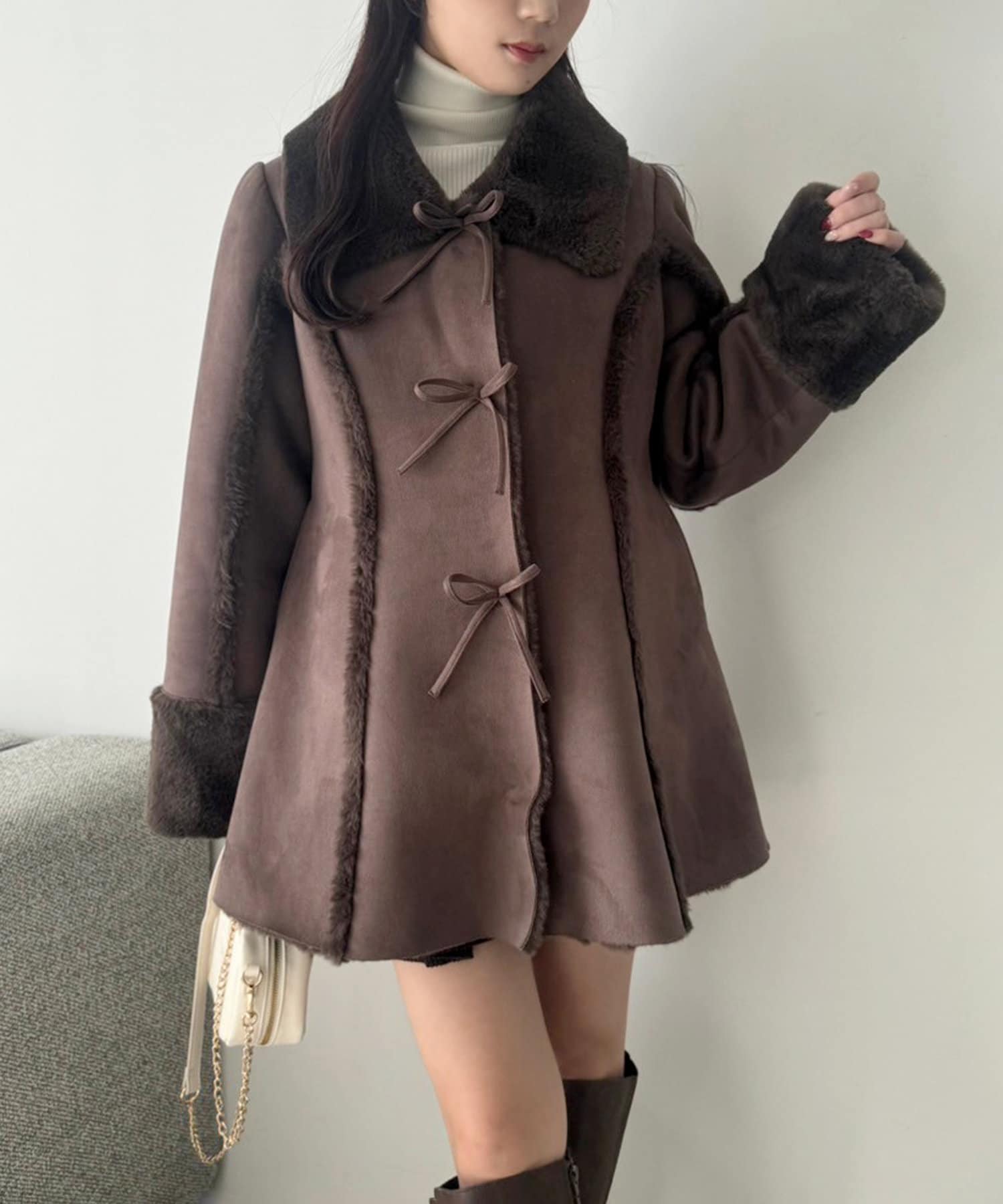 柔らかなムートン素材とリボンディテールが女性らしさを引き立て、
