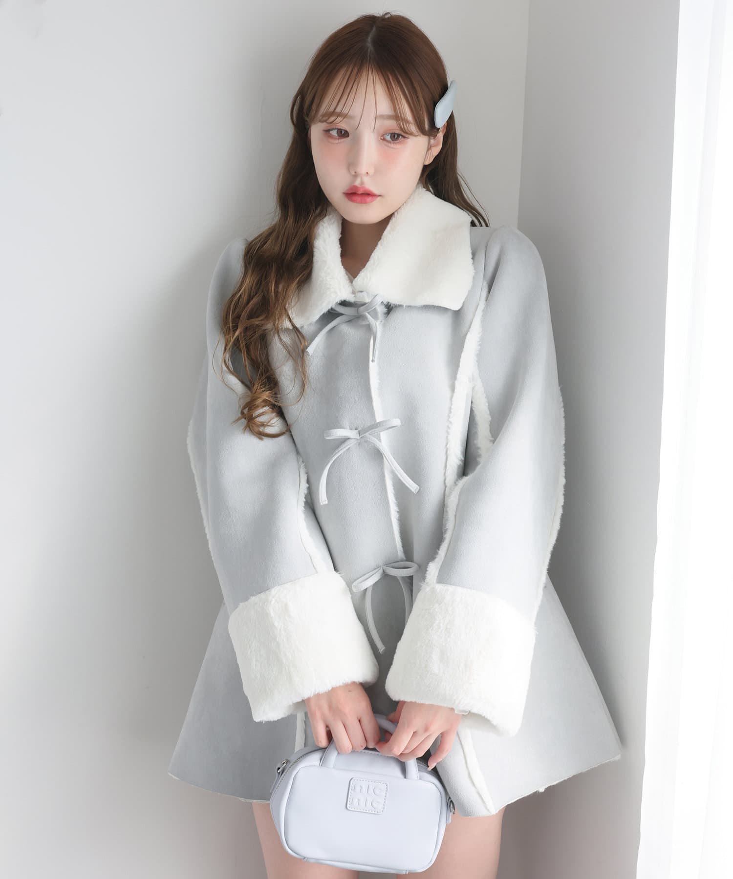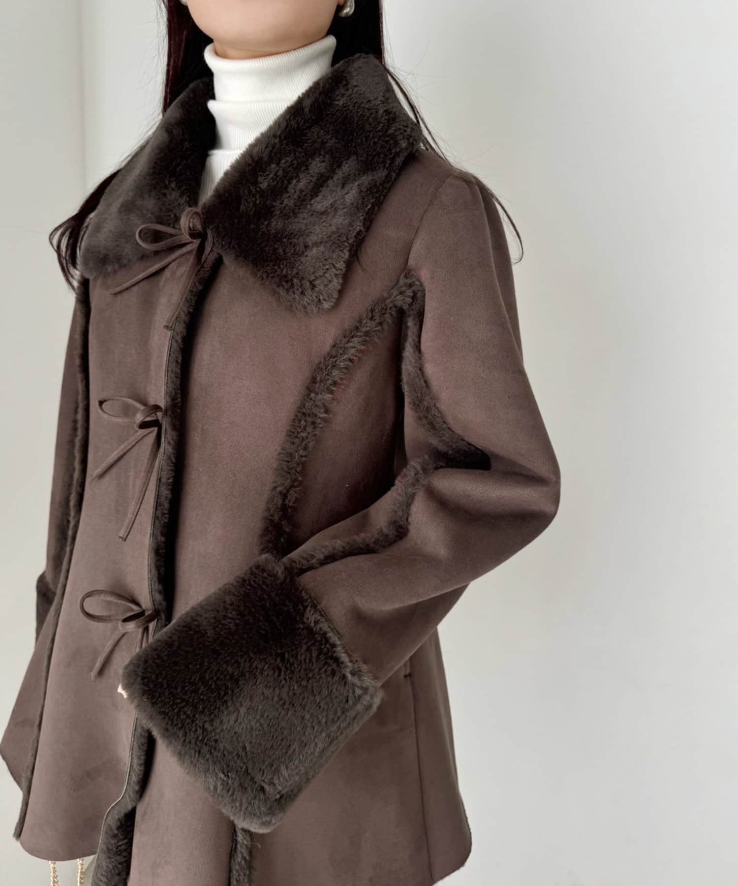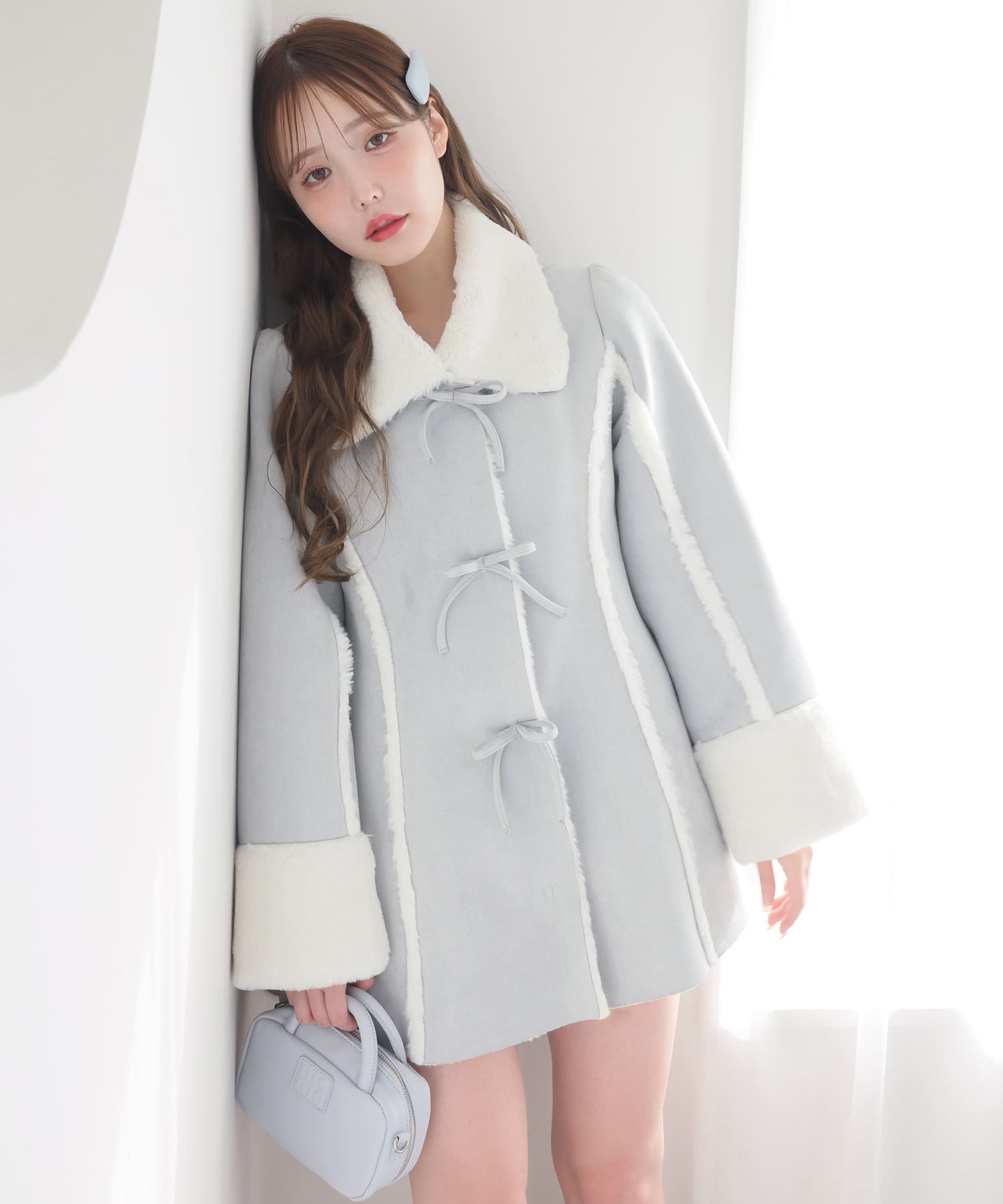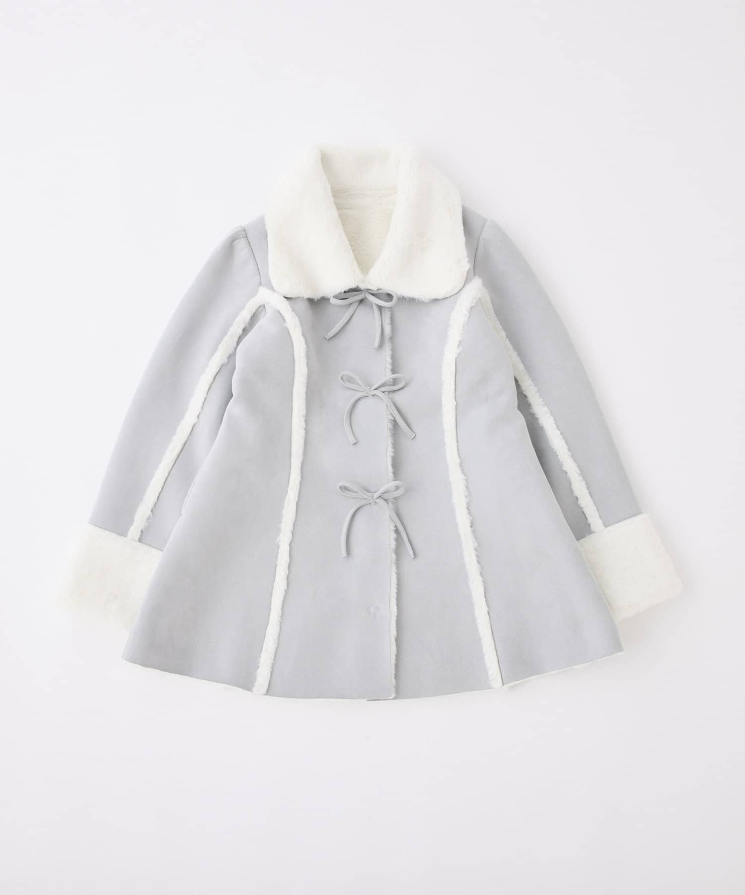 柔らかなムートン素材とリボンディテールが女性らしさを引き立て、