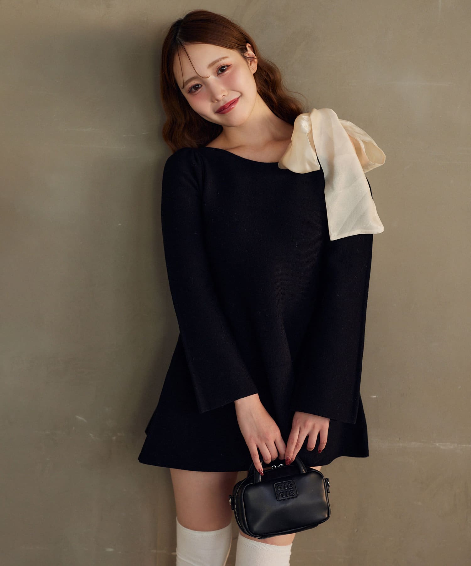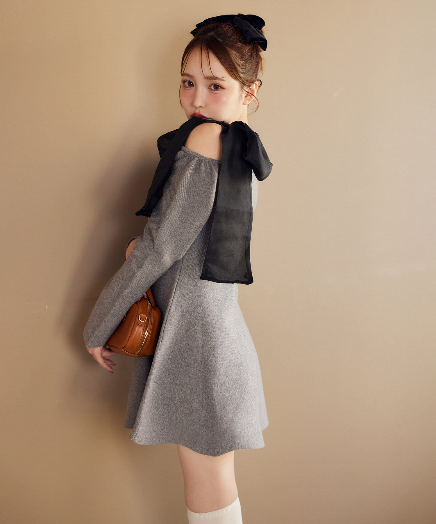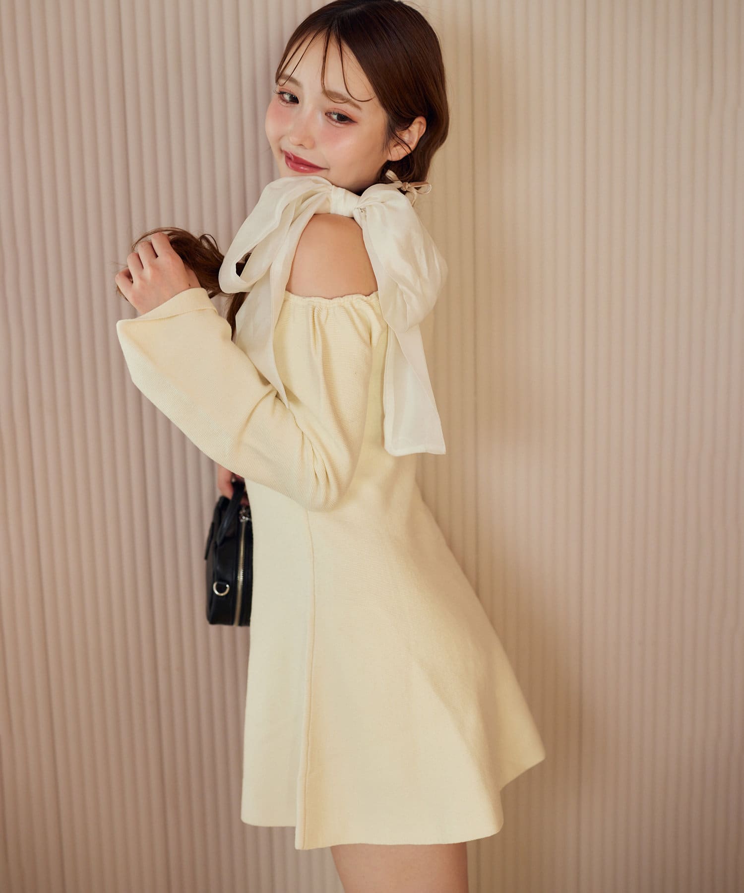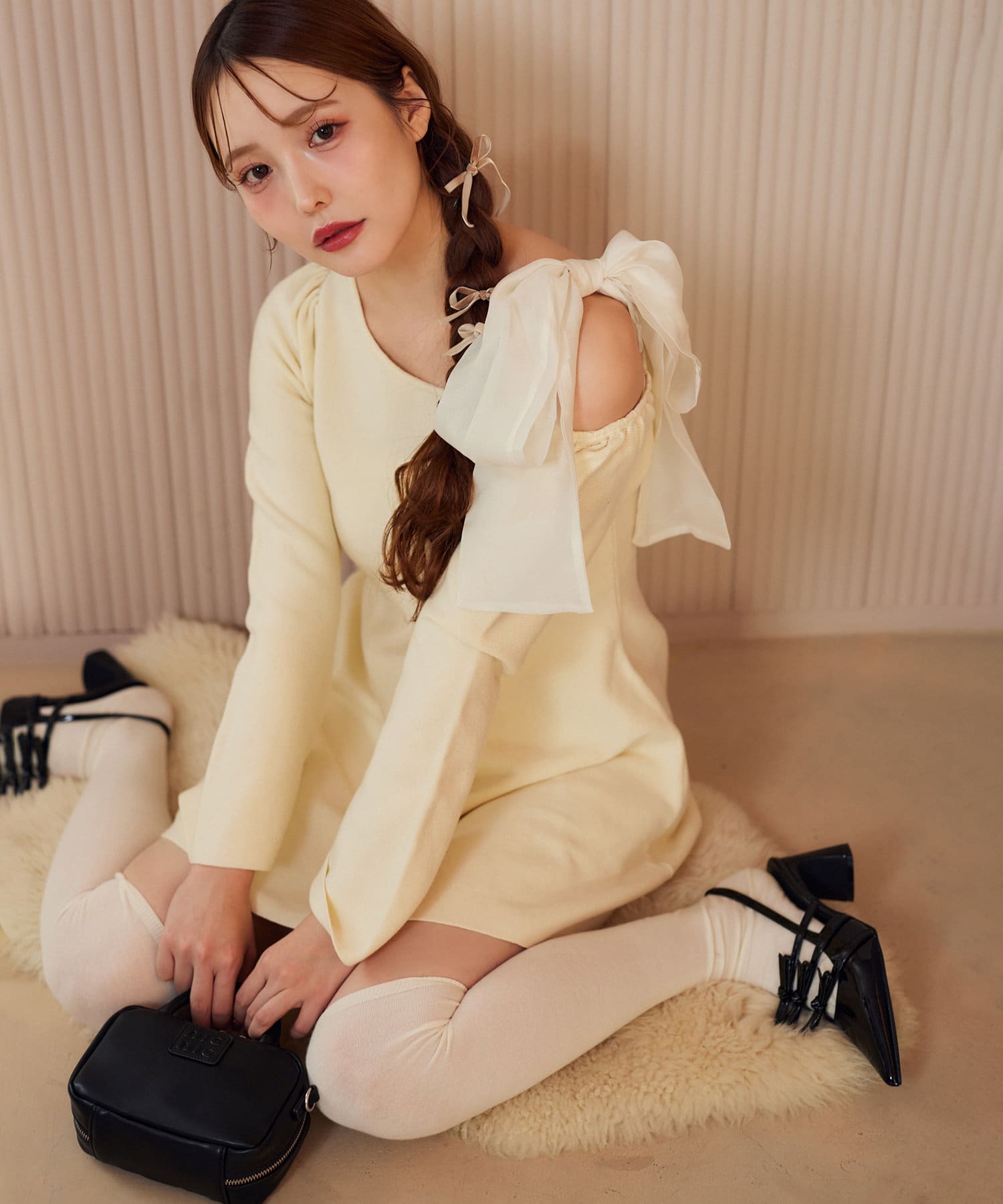 肩の大きなリボンが可愛さを引き立てるニットワンピース