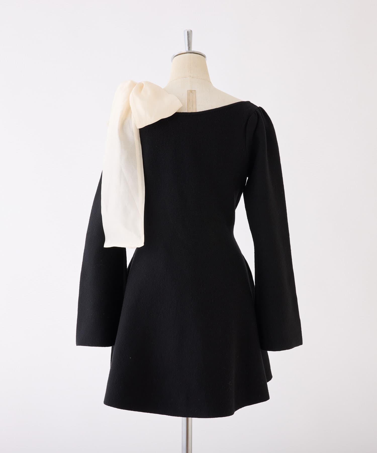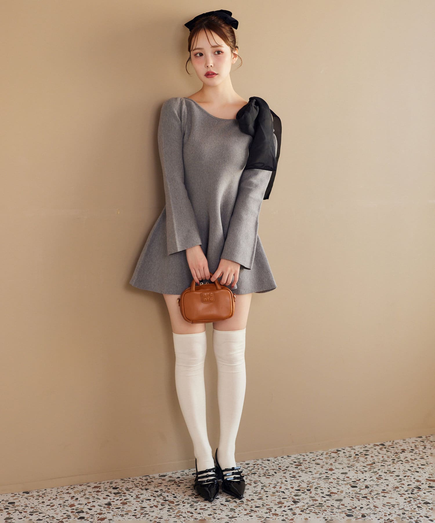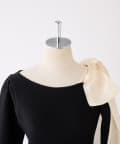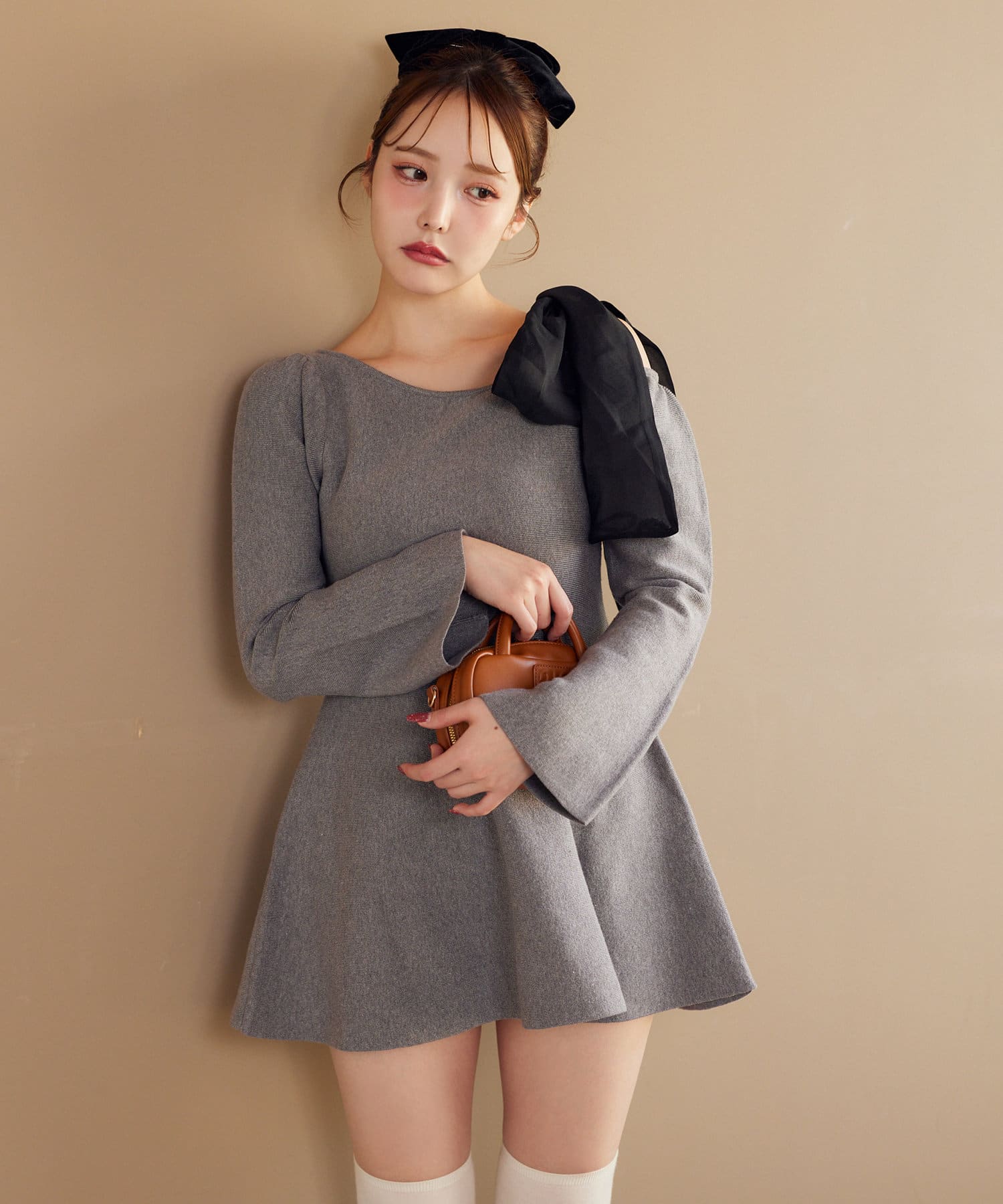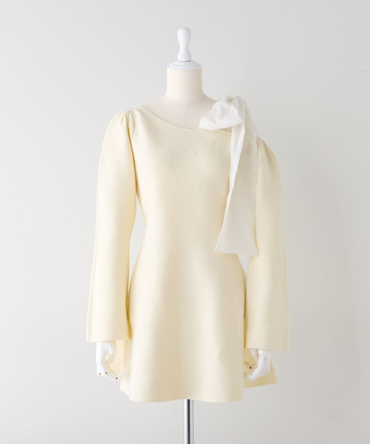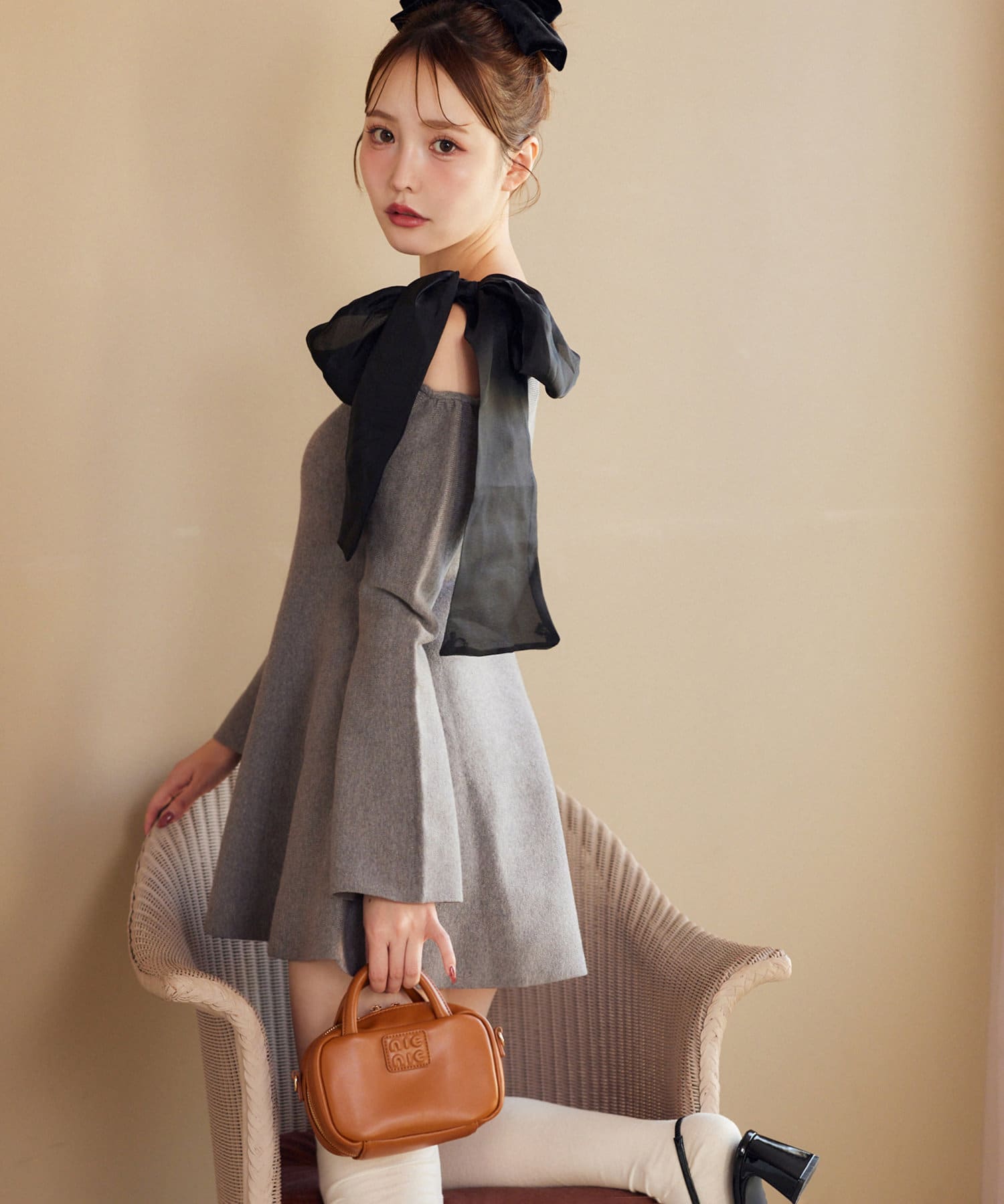 肩の大きなリボンが可愛さを引き立てるニットワンピース