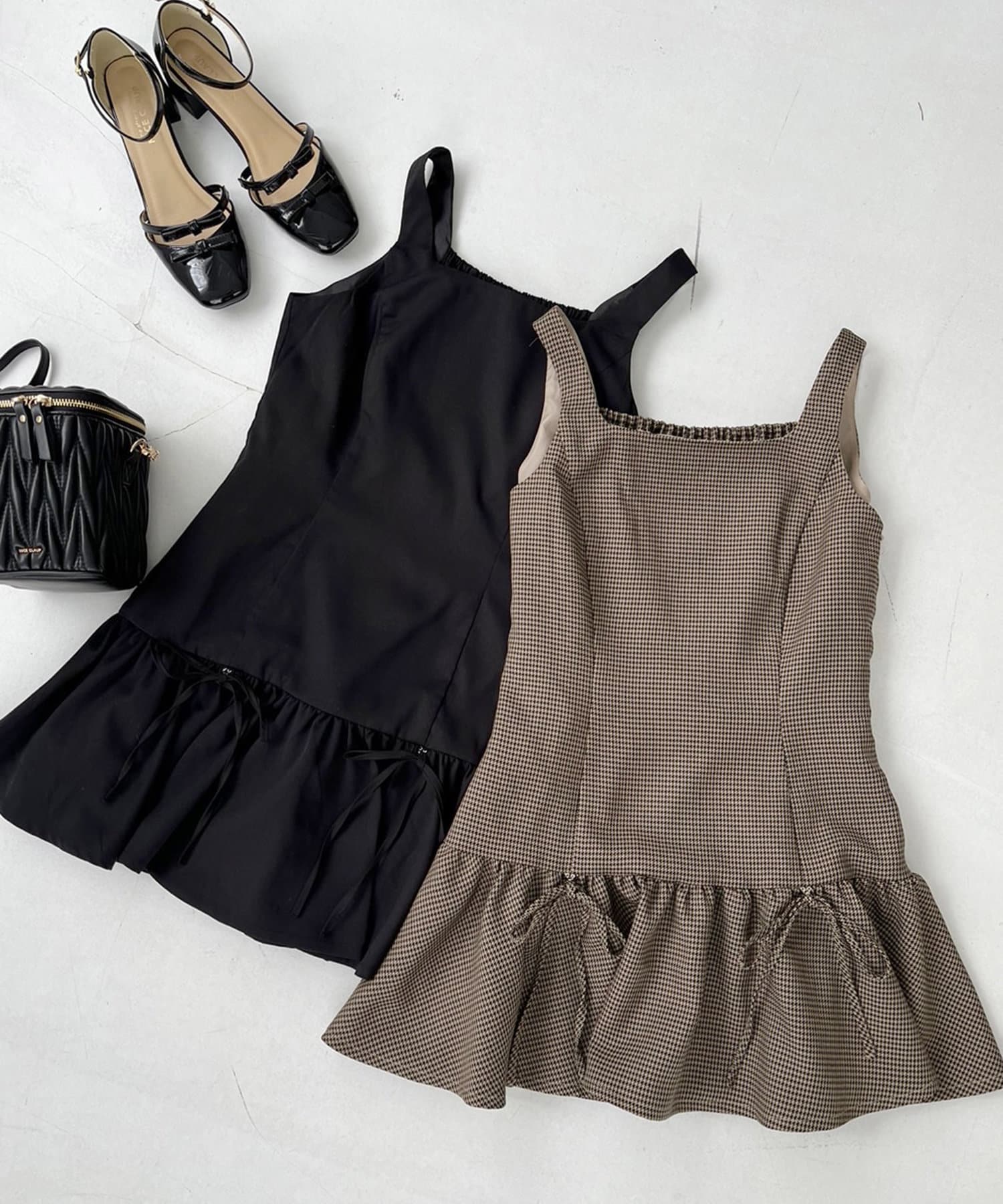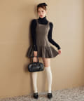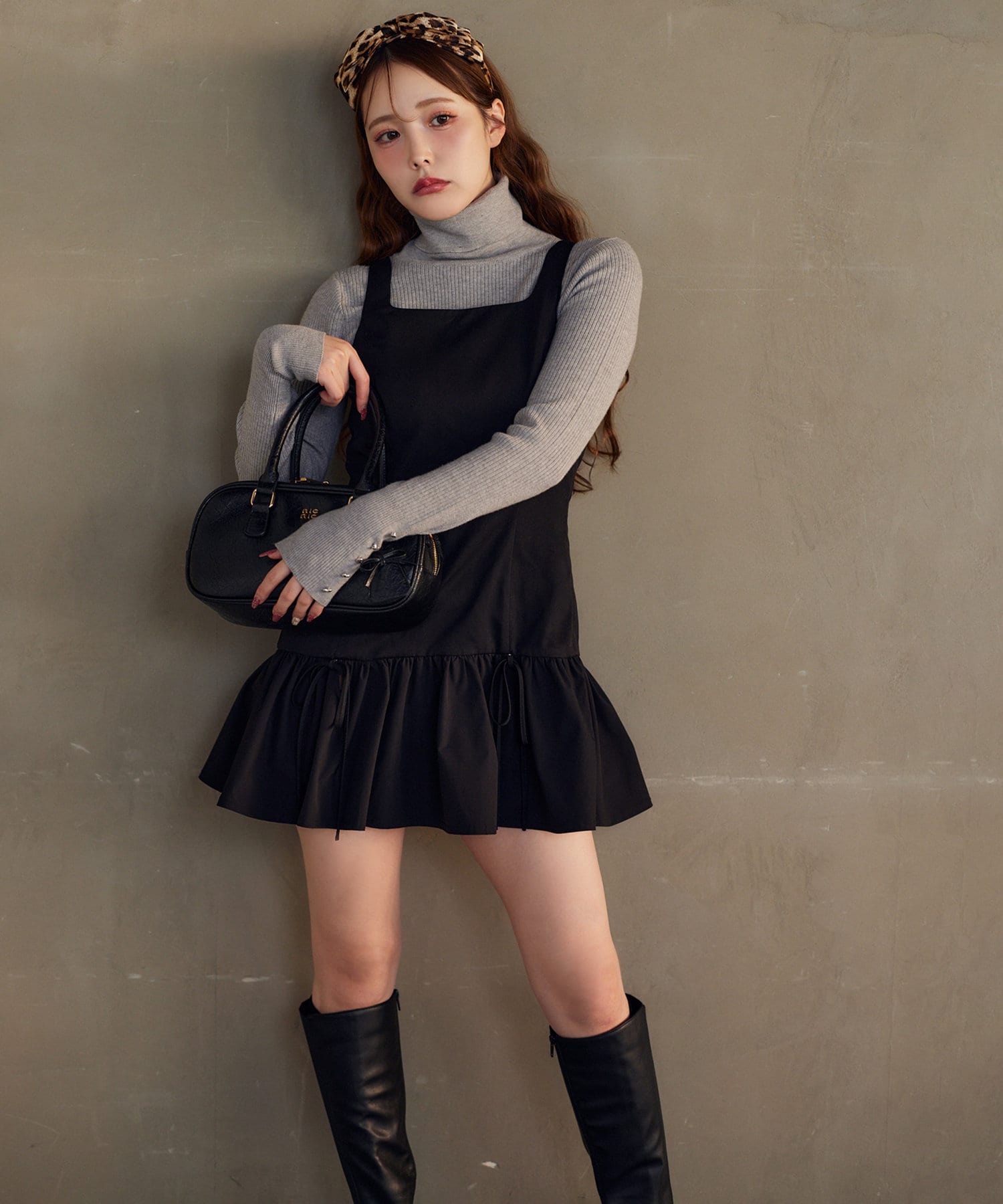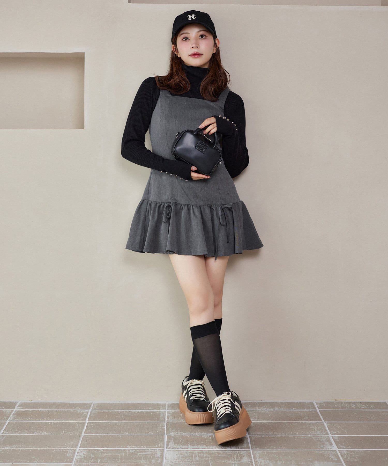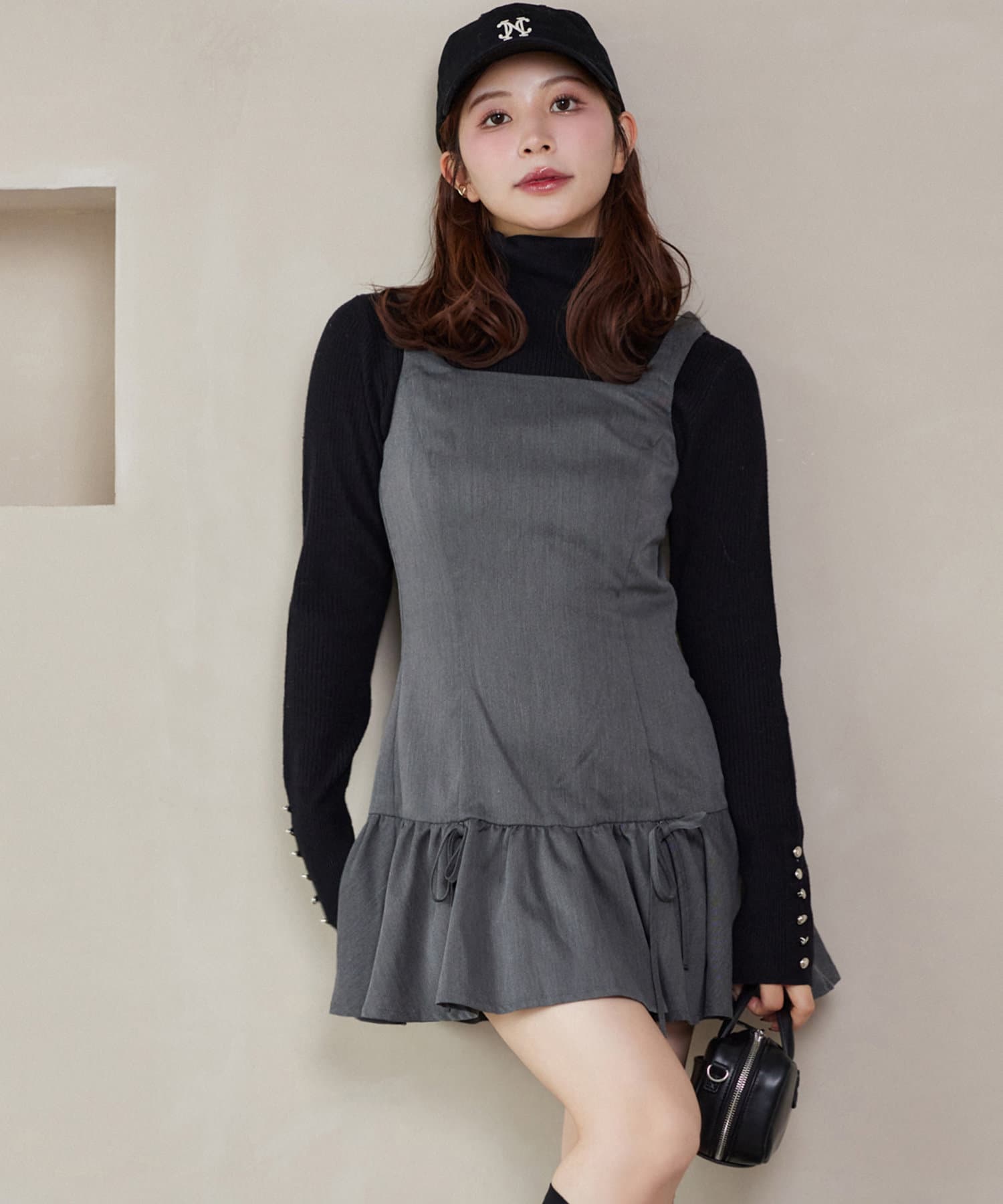 ふんわり広がるシルエットとさりげないリボンが可愛らしいミニジャンパースカート