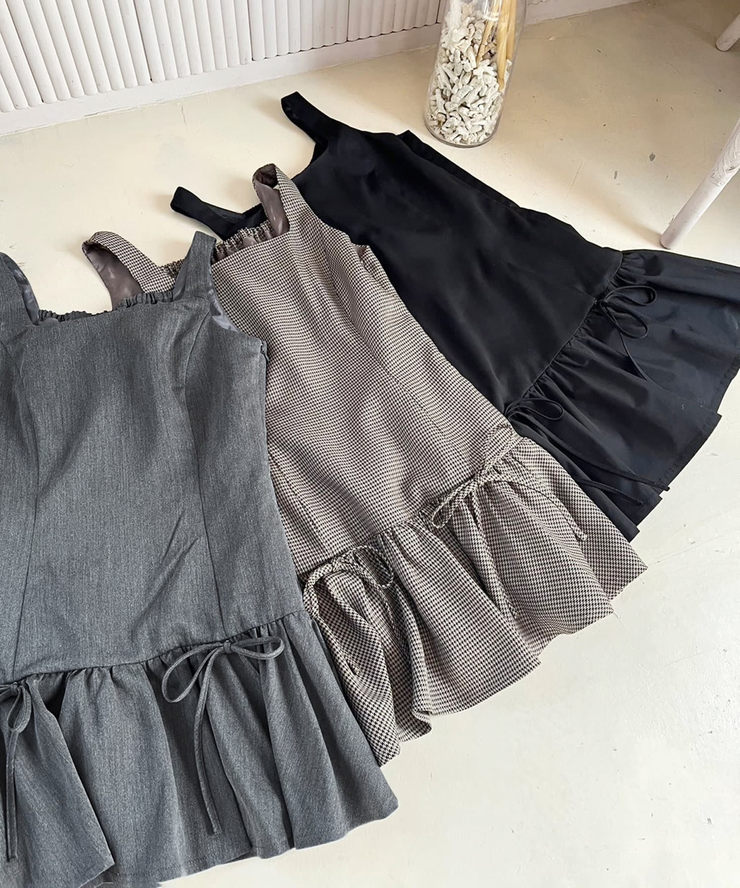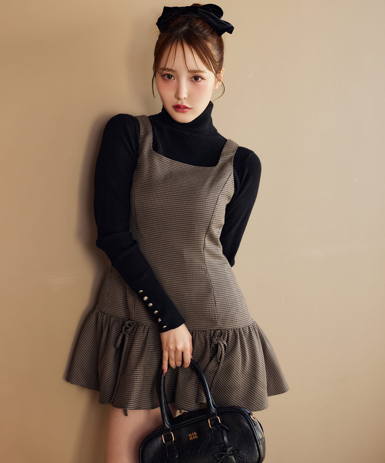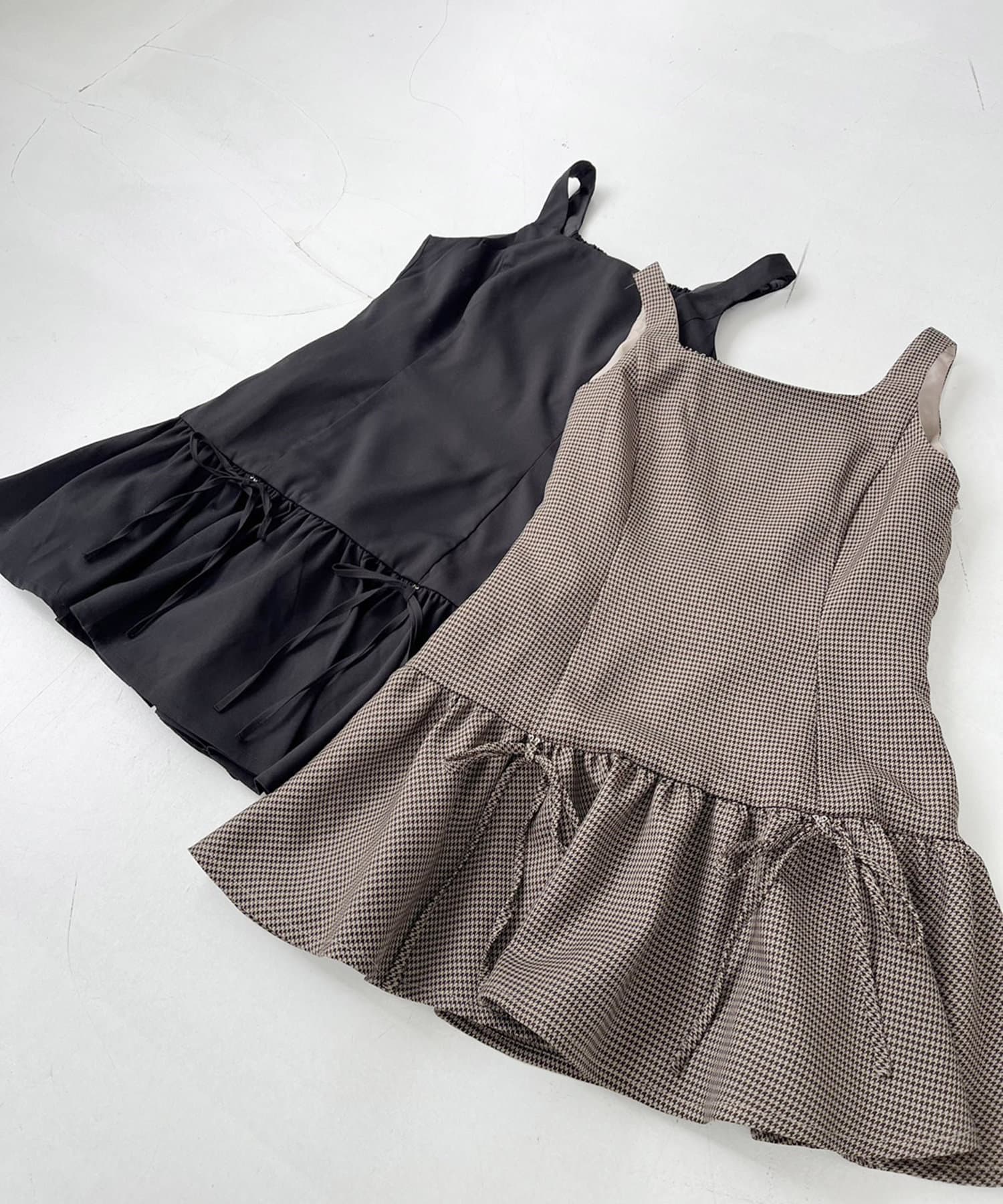 ふんわり広がるシルエットとさりげないリボンが可愛らしいミニジャンパースカート