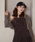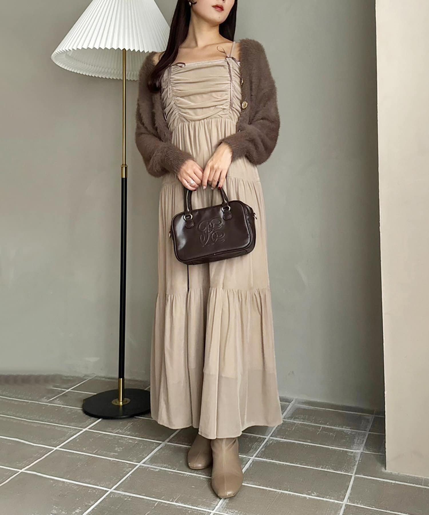 胸元のリボンとシャーリングがコーデのアクセントになるキャミワンピース