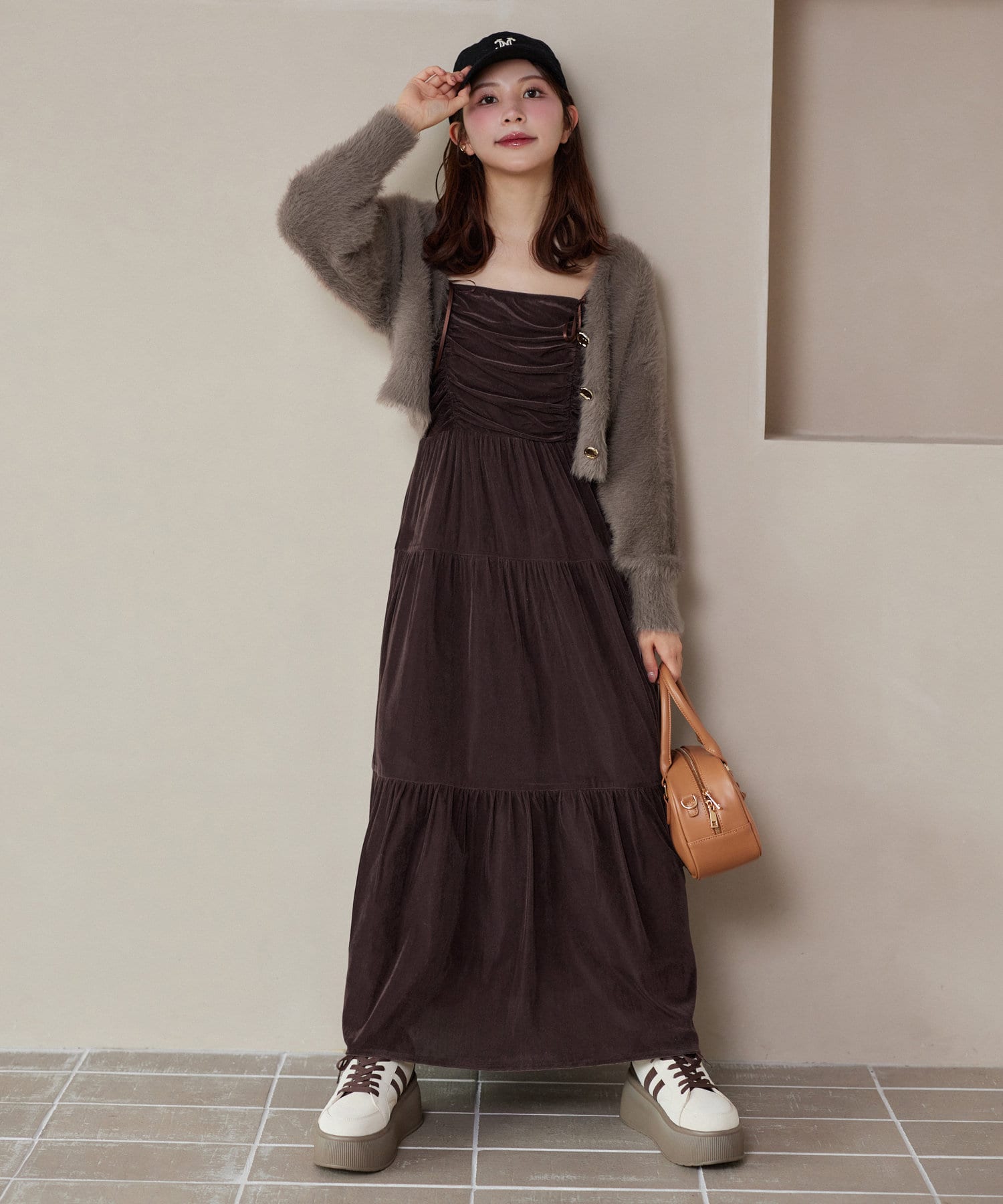 胸元のリボンとシャーリングがコーデのアクセントになるキャミワンピース