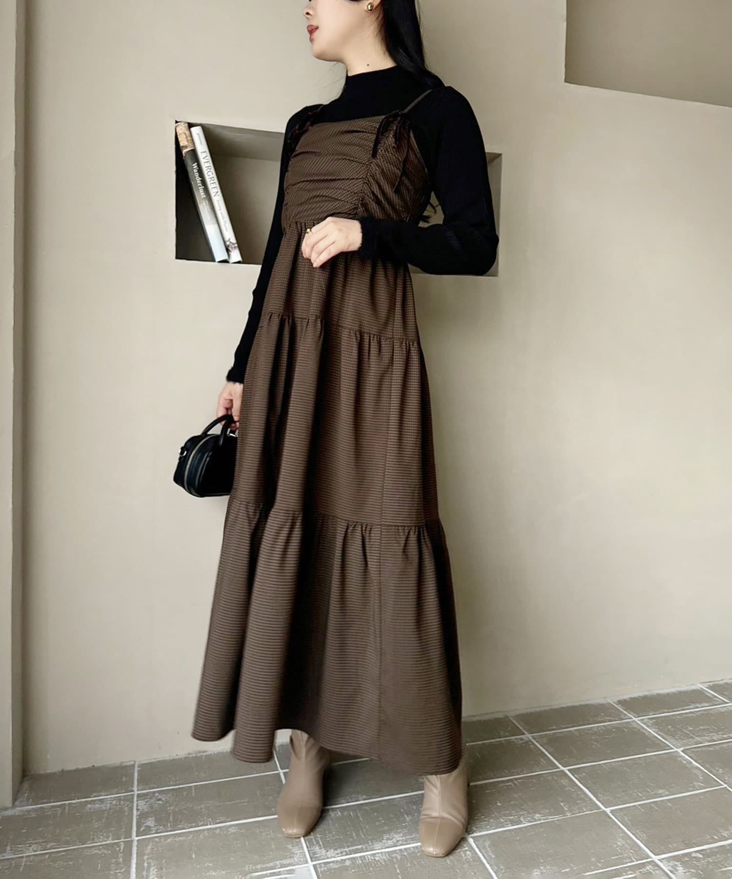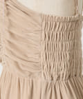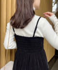 胸元のリボンとシャーリングがコーデのアクセントになるキャミワンピース
