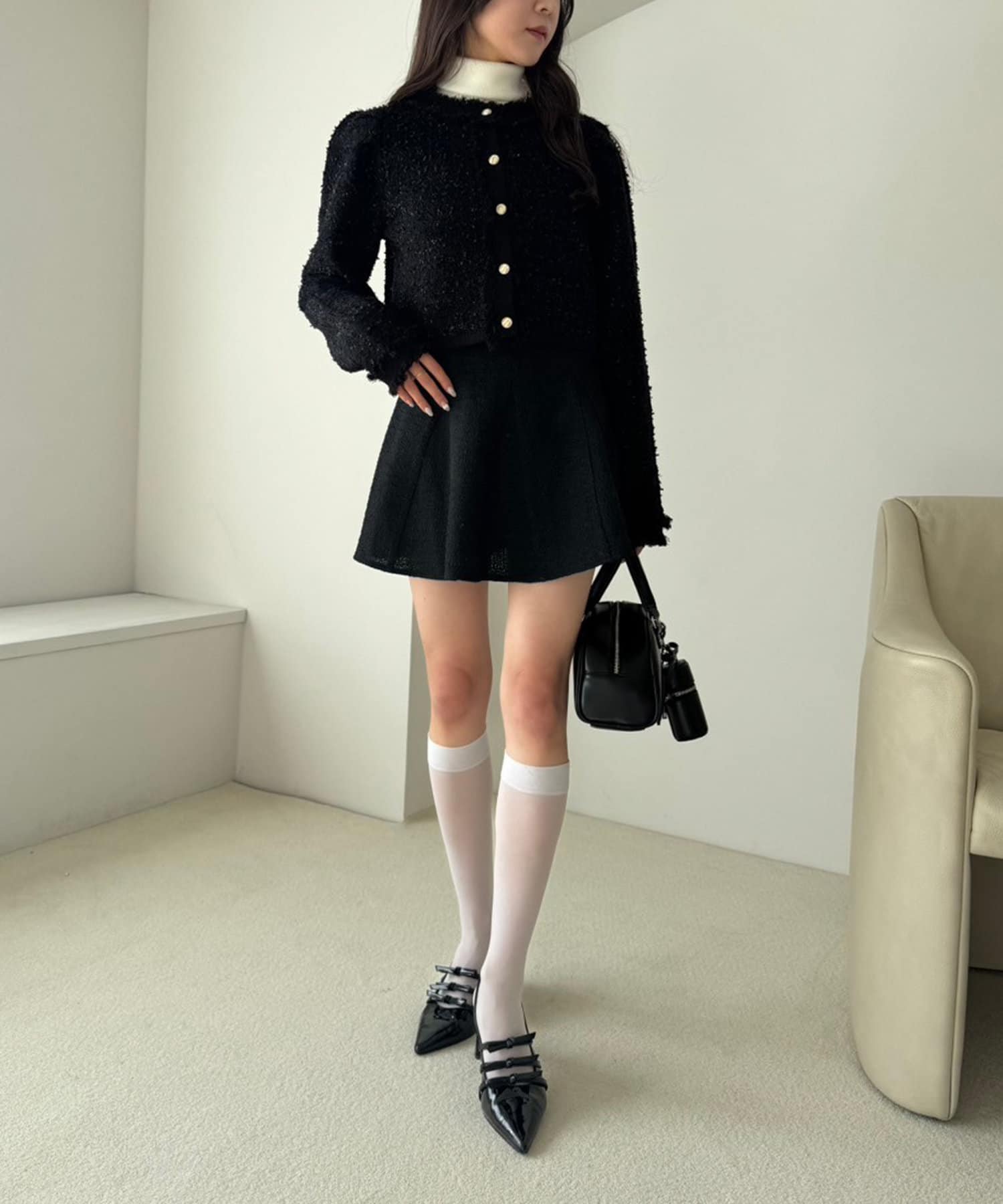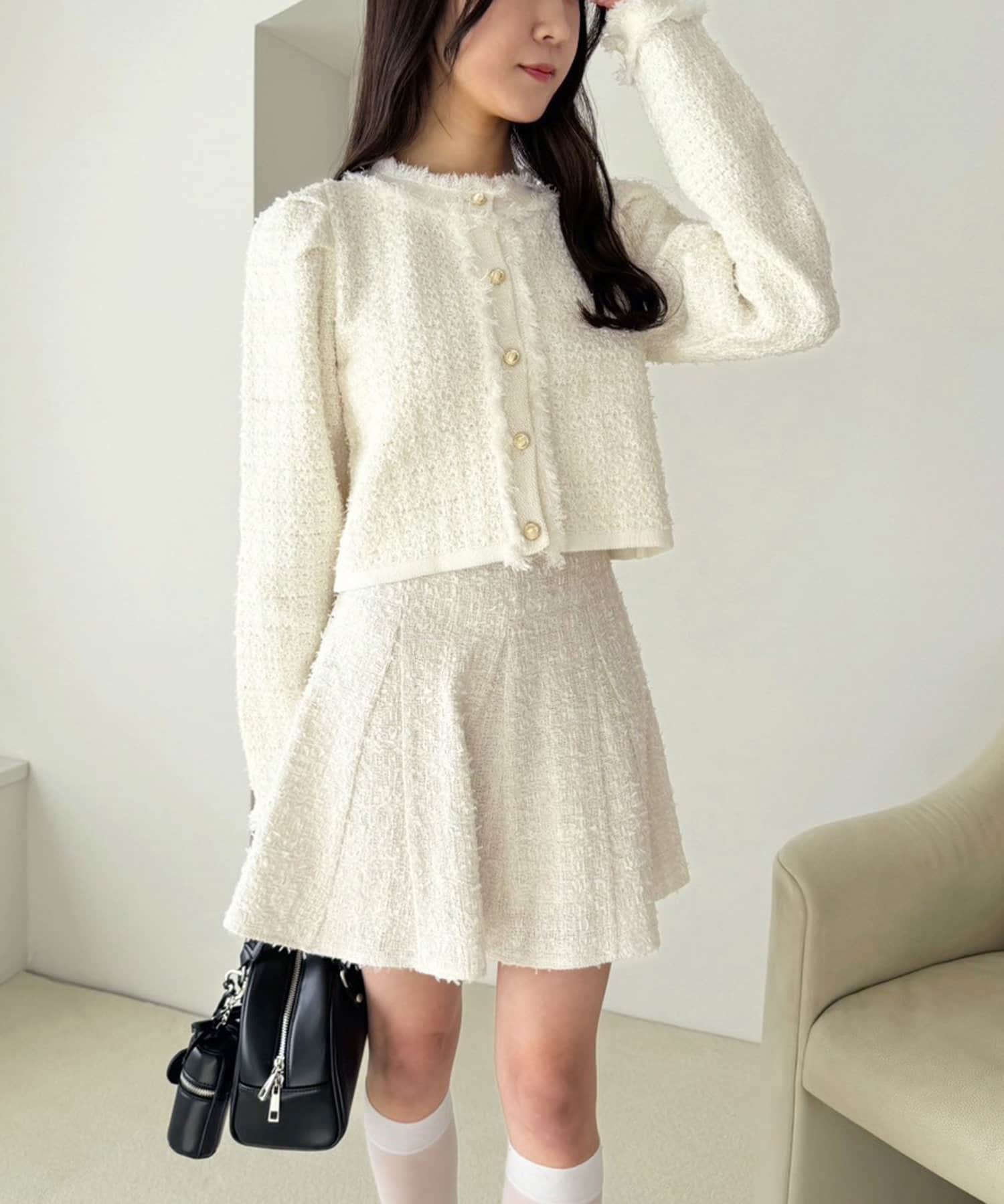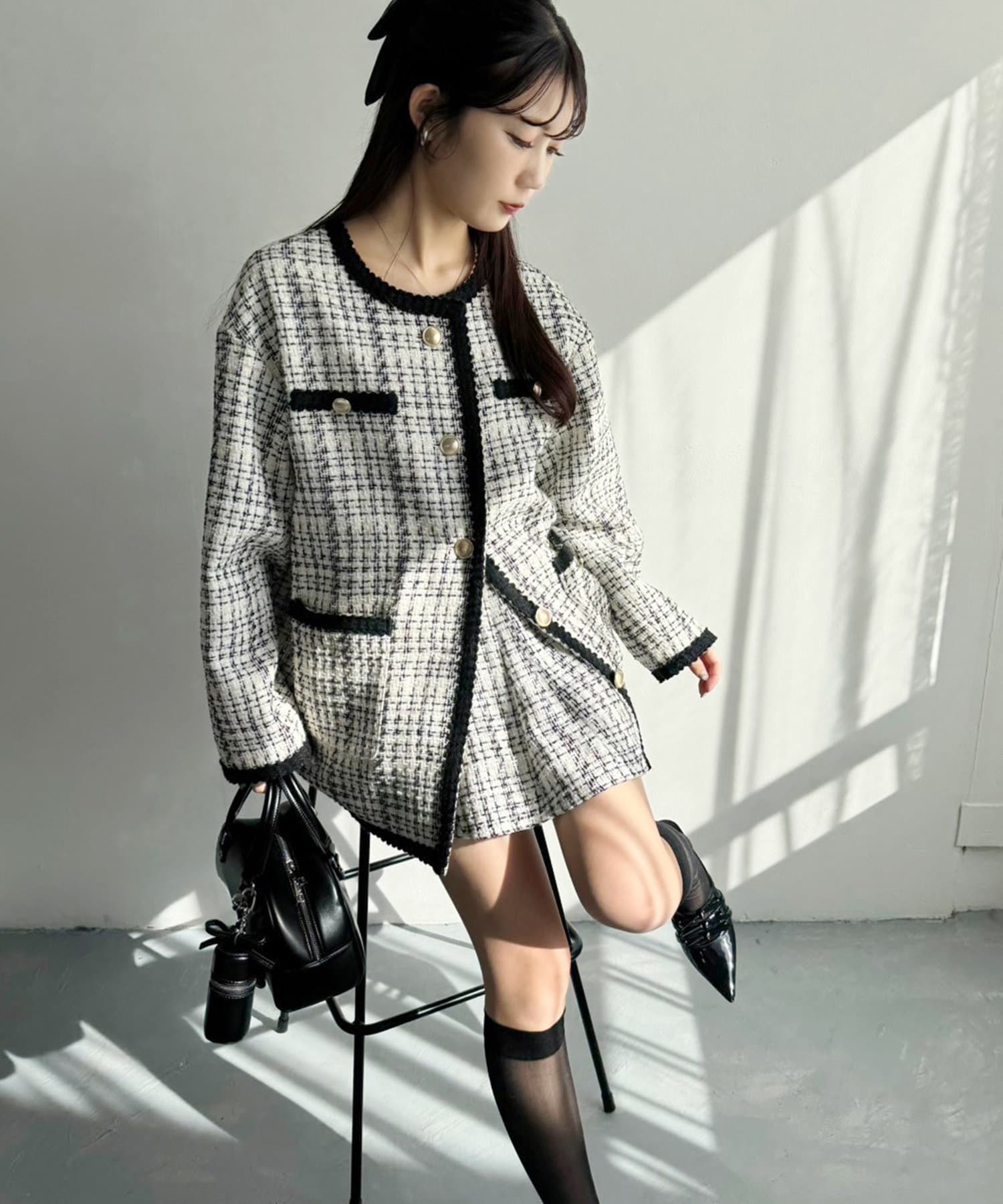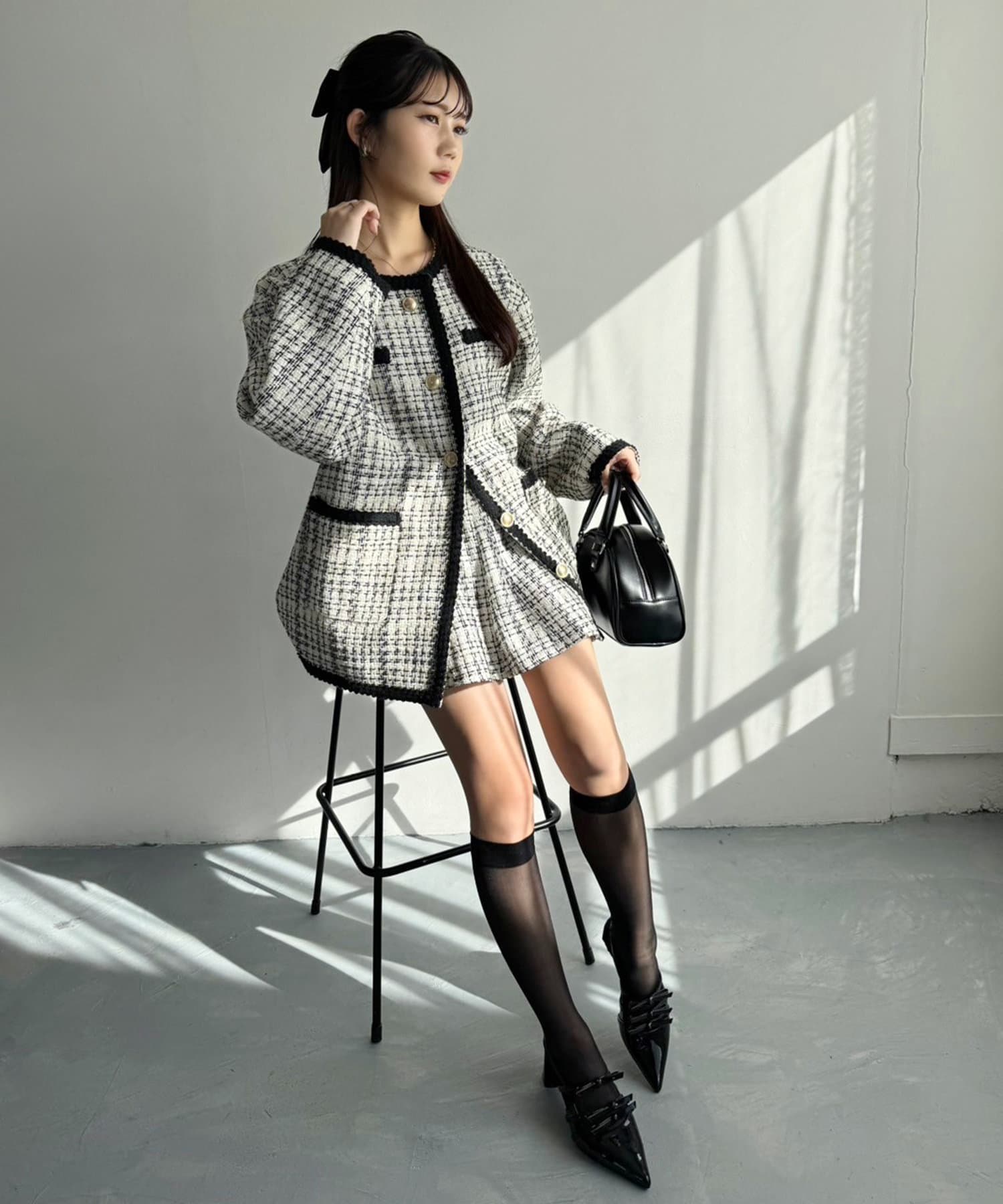 ツイードならではの高級感漂うアイテムは、シンプルコーデにも映えます。