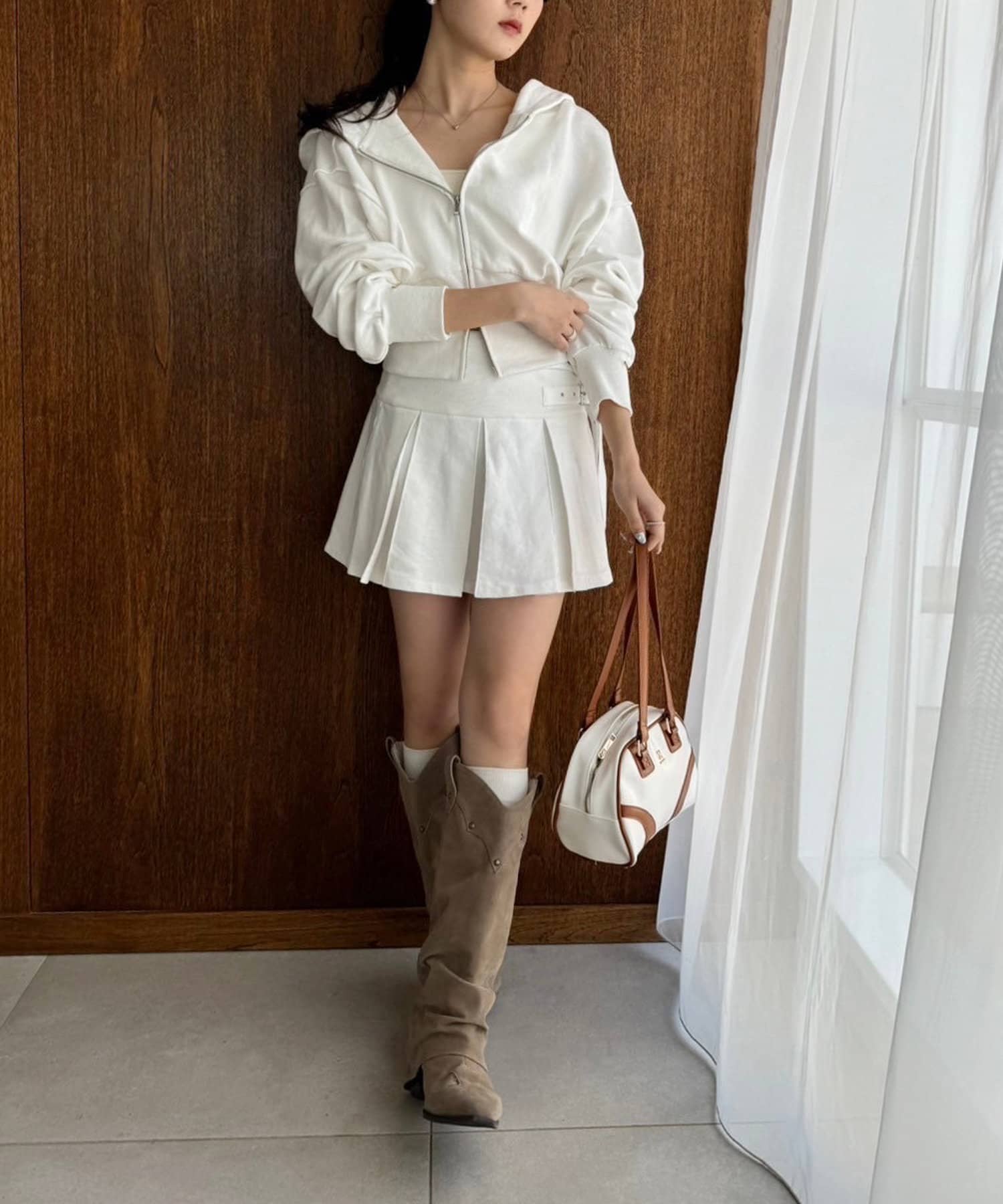 足元はハイソックス×スニーカーで、トレンド感溢れるスタイルに。