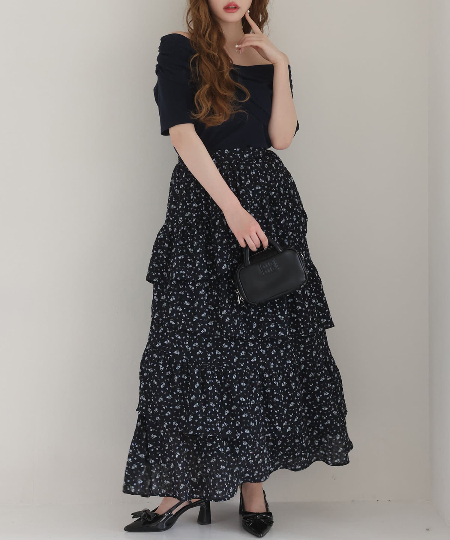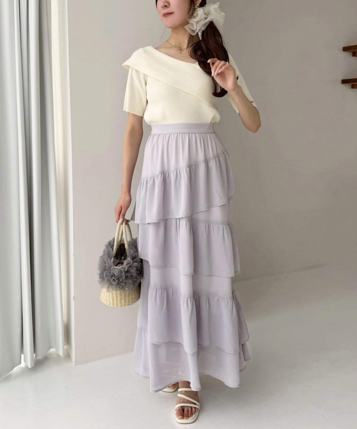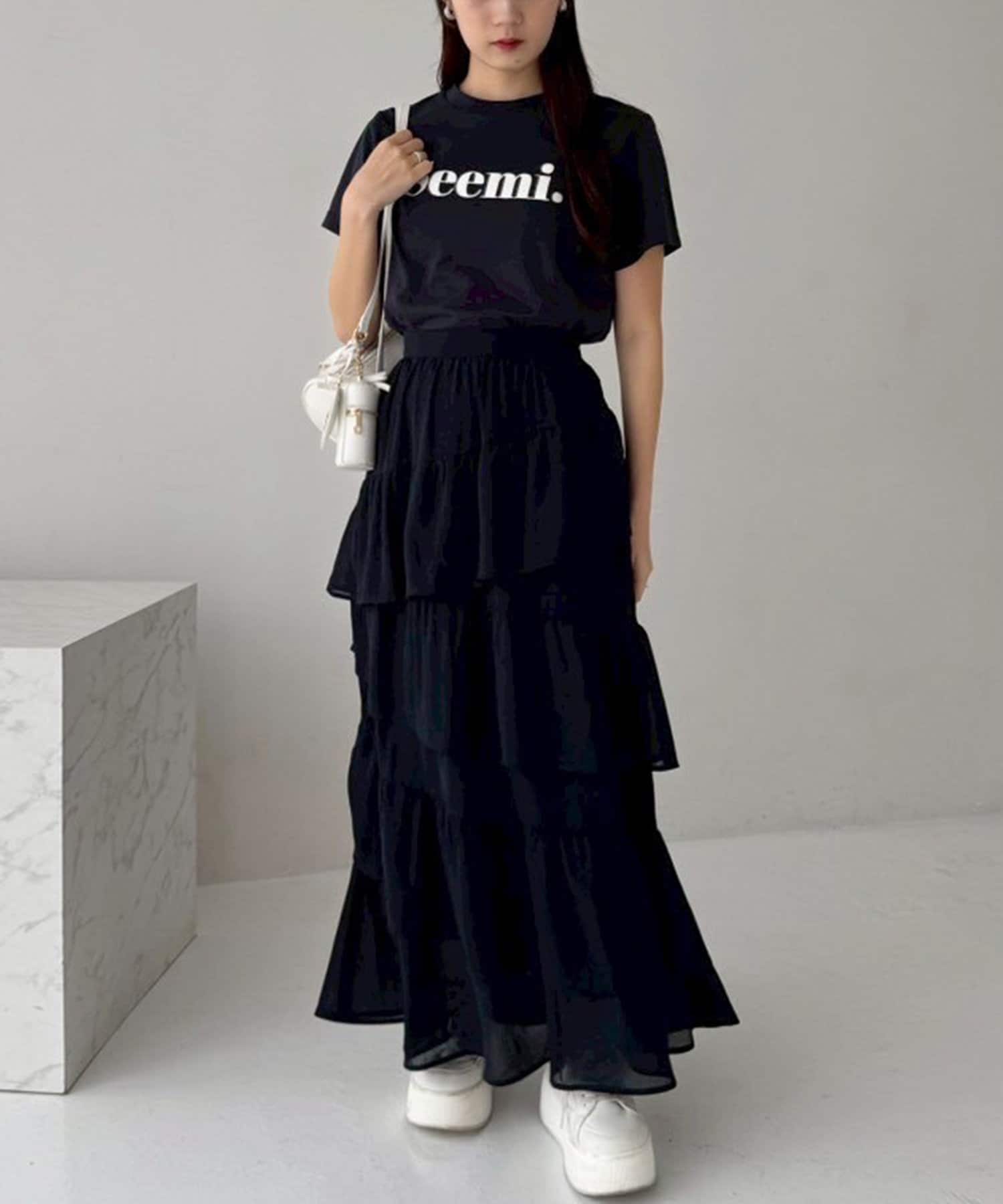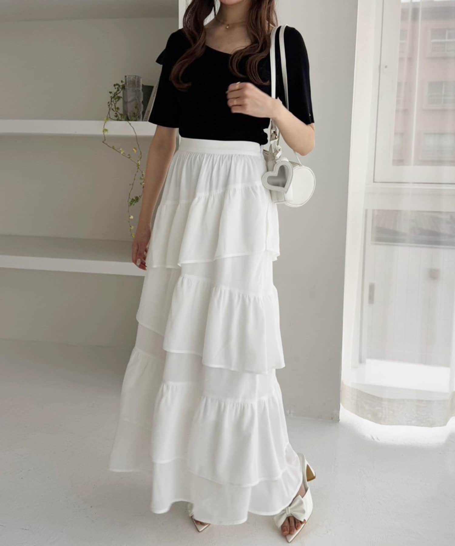 ティアードが目を惹くデザインなので、シンプルめのトップスでも