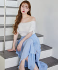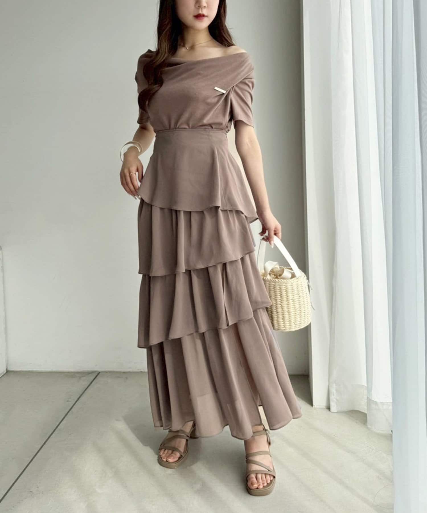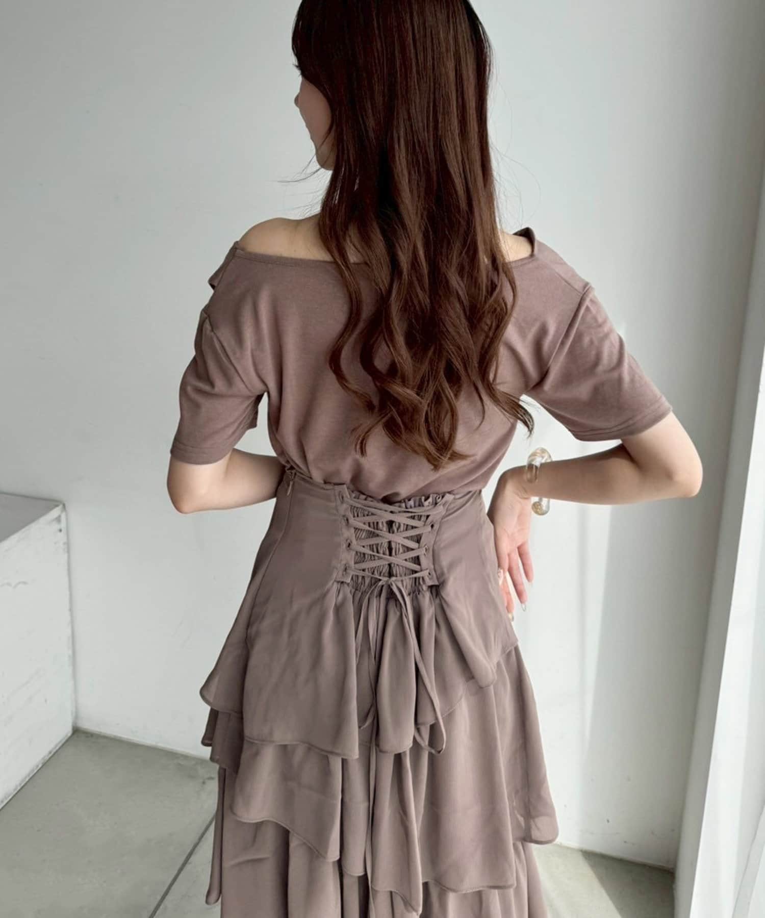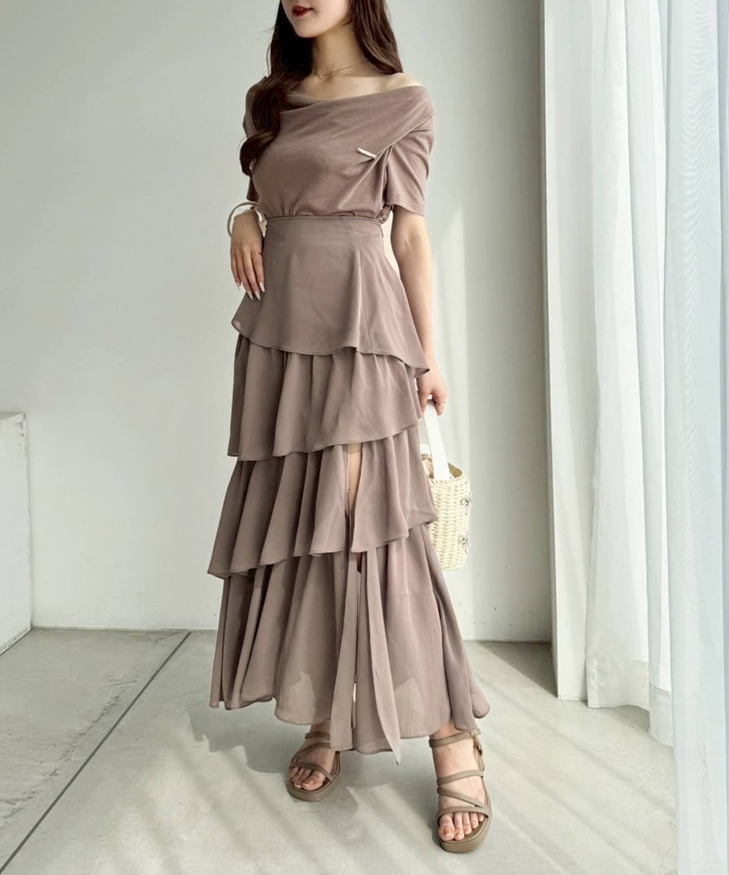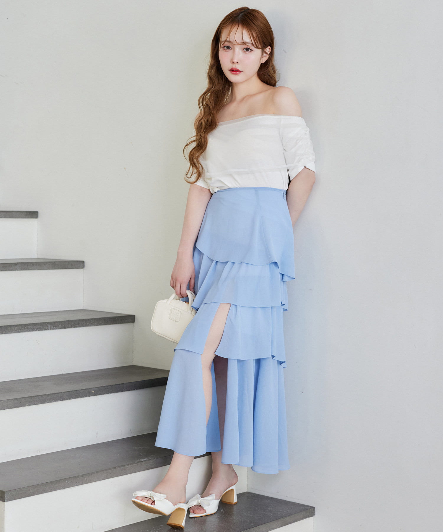 ティアードが目を惹くデザインなので、シンプルめのトップスでも