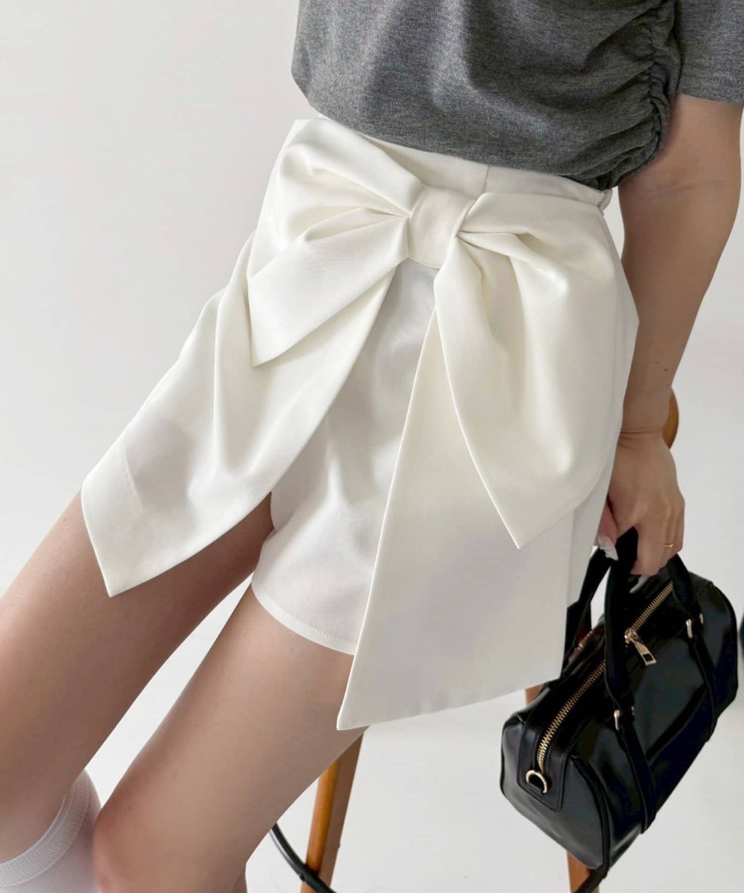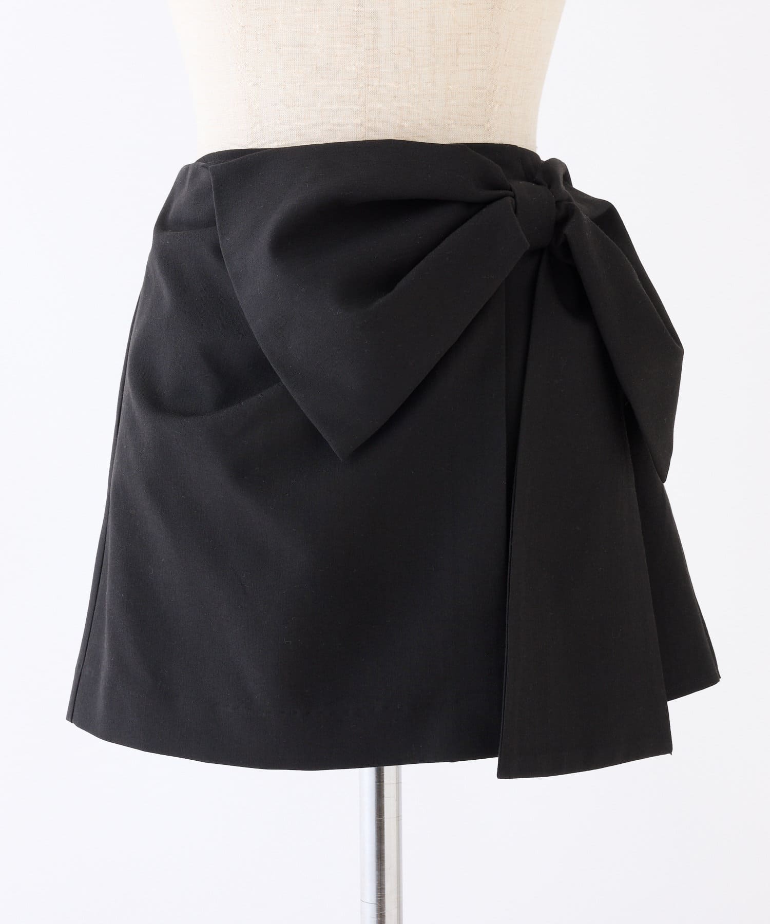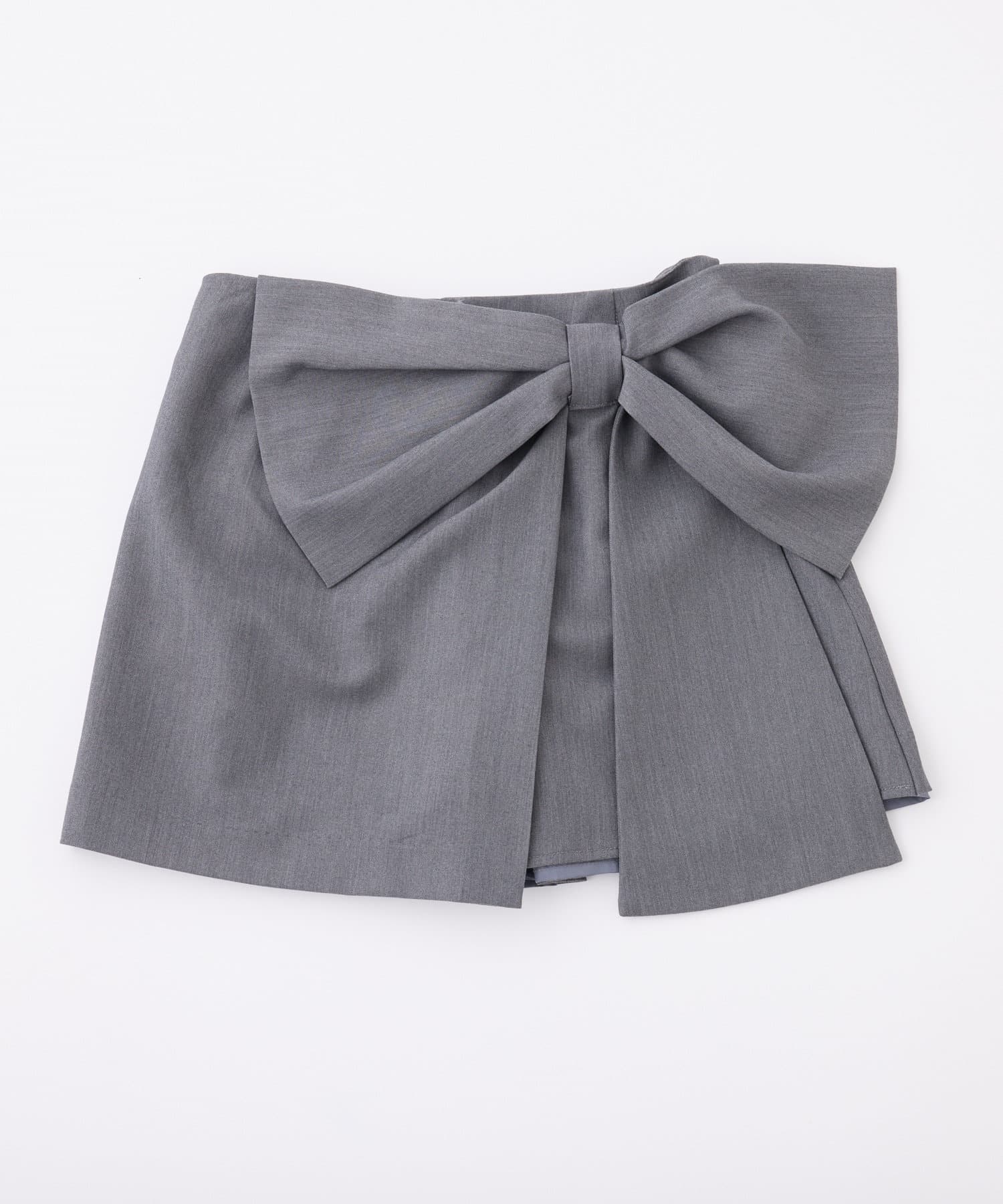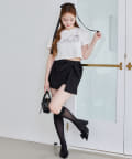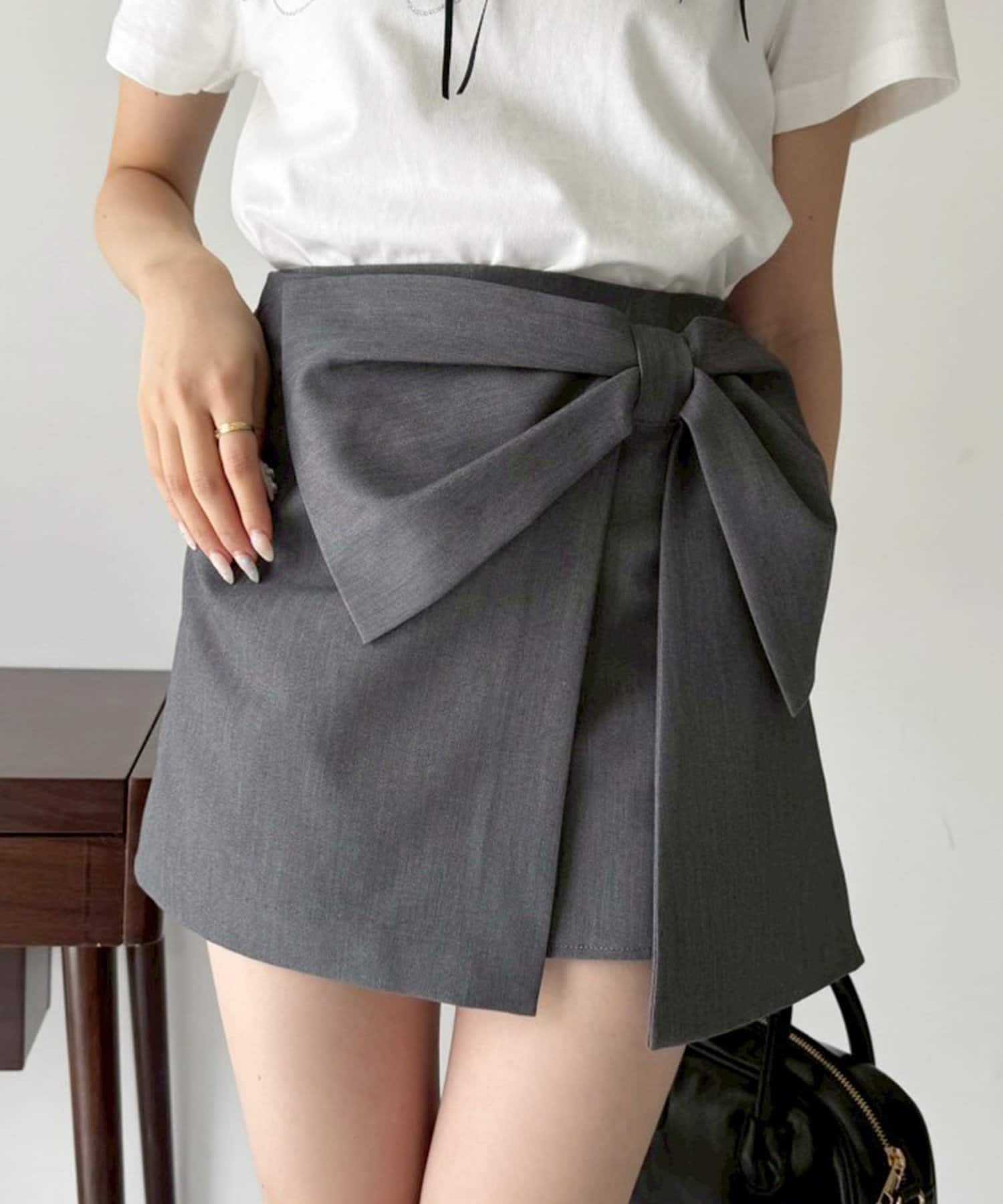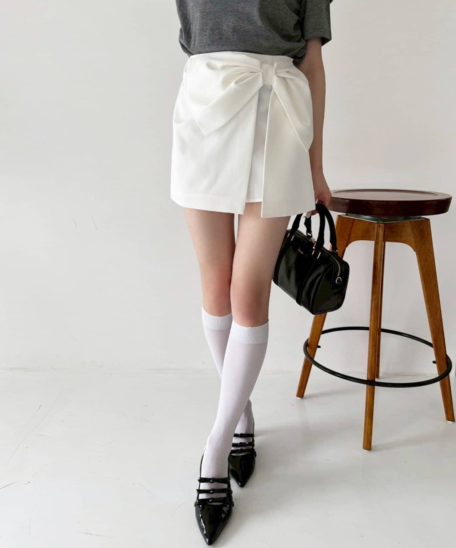 フロントに施した大きめリボンが目を惹く、フェミニンムードたっぷりのミニスカート。