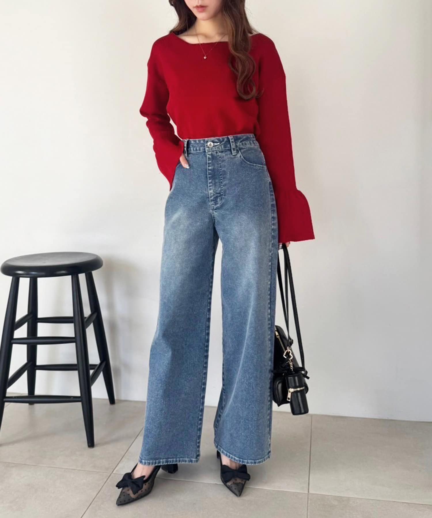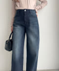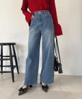 全体的にゆったりとしたシルエットのストレートデニムは、華奢見せ効果も。