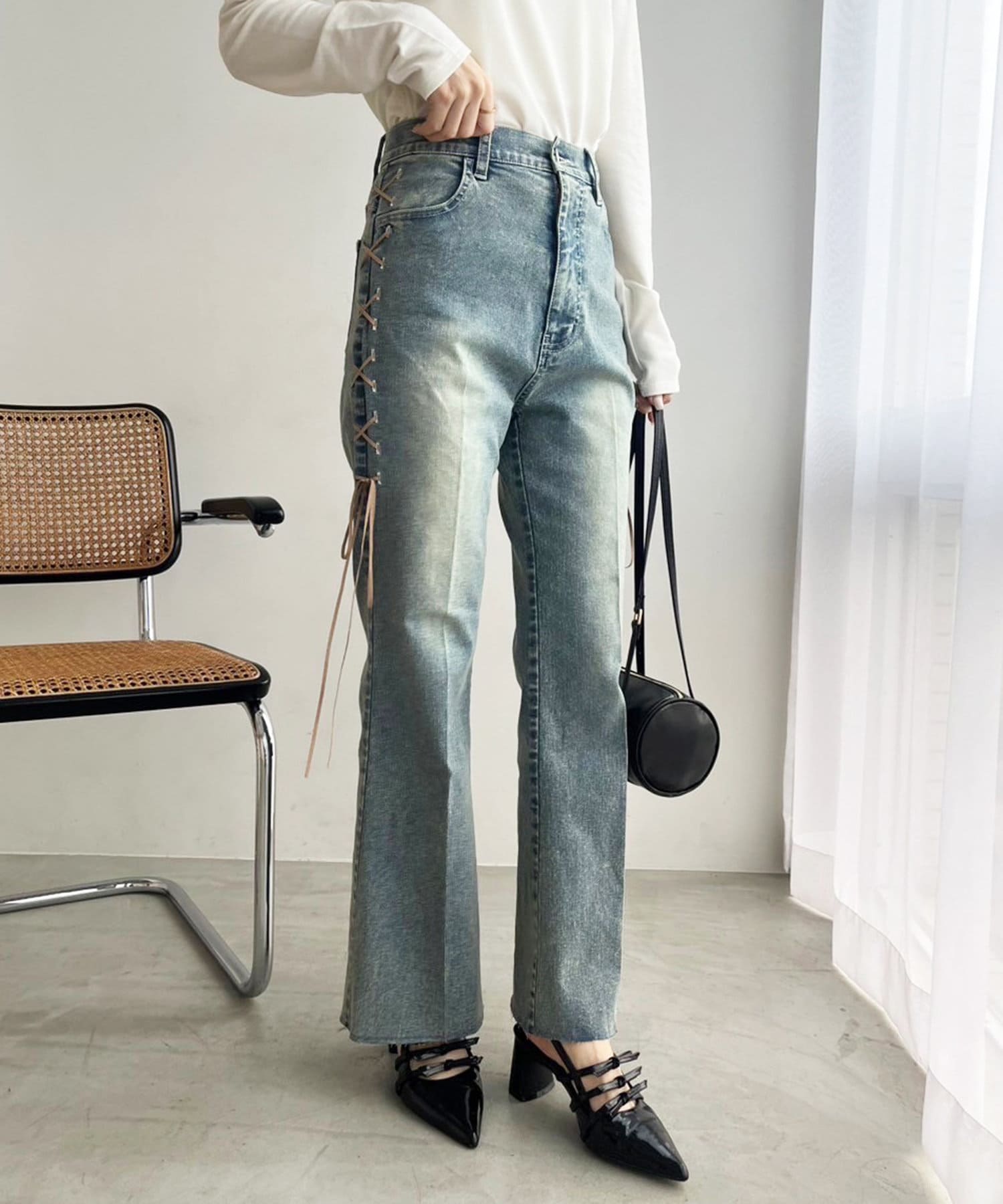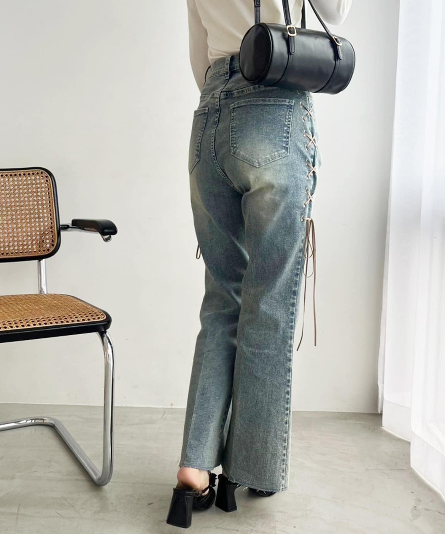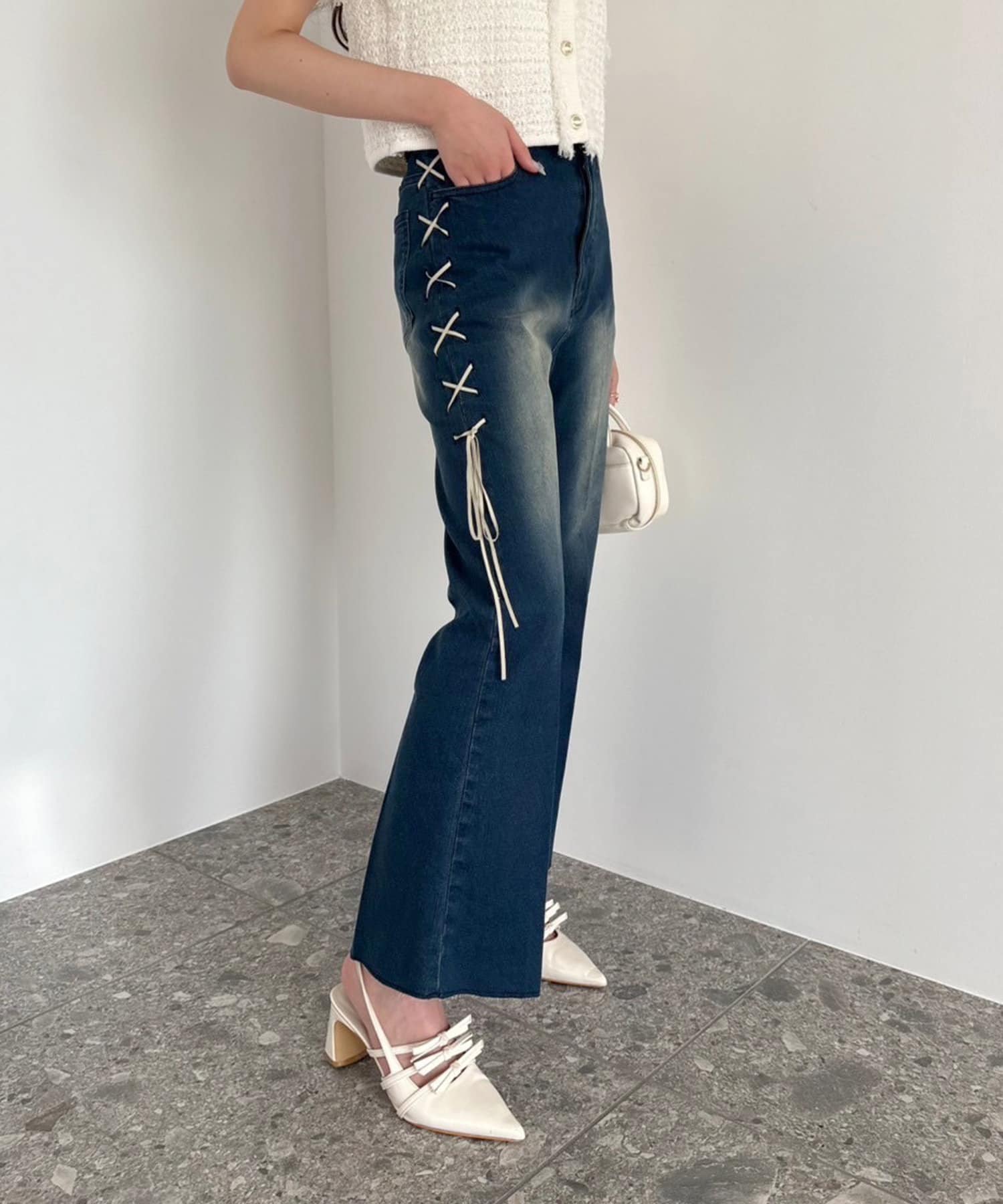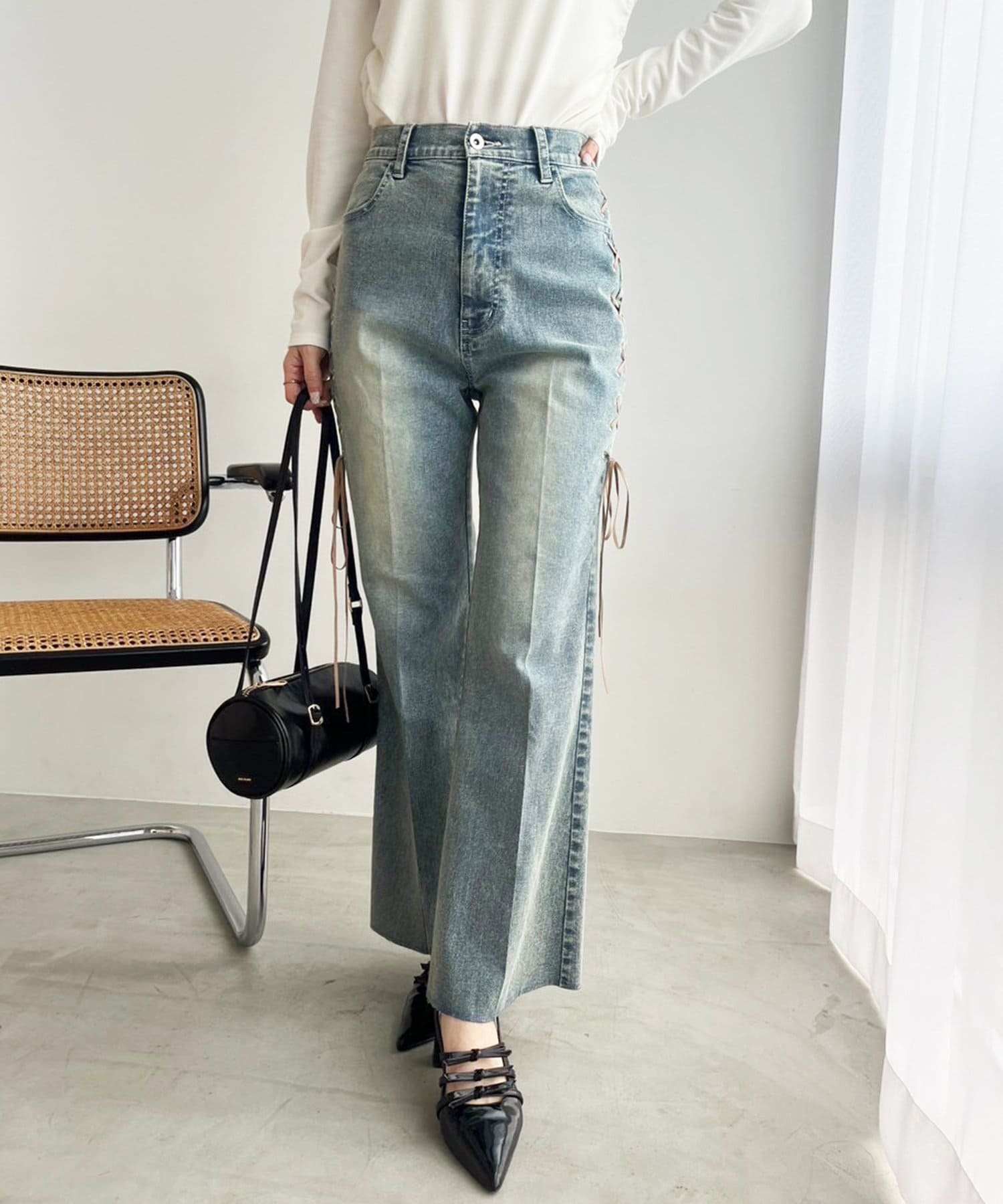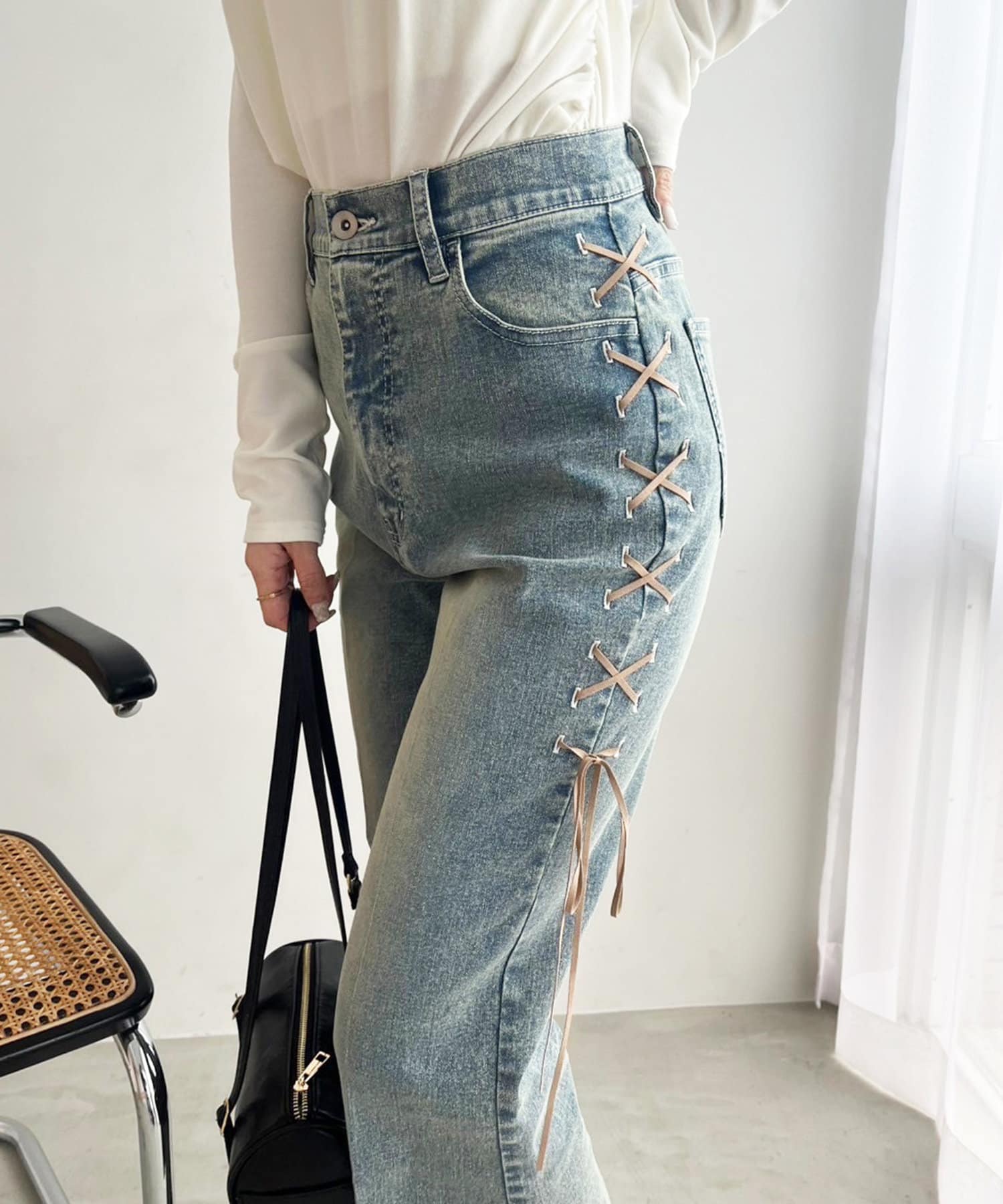 サイドのレースアップがおしゃれ見えするデニムパンツ