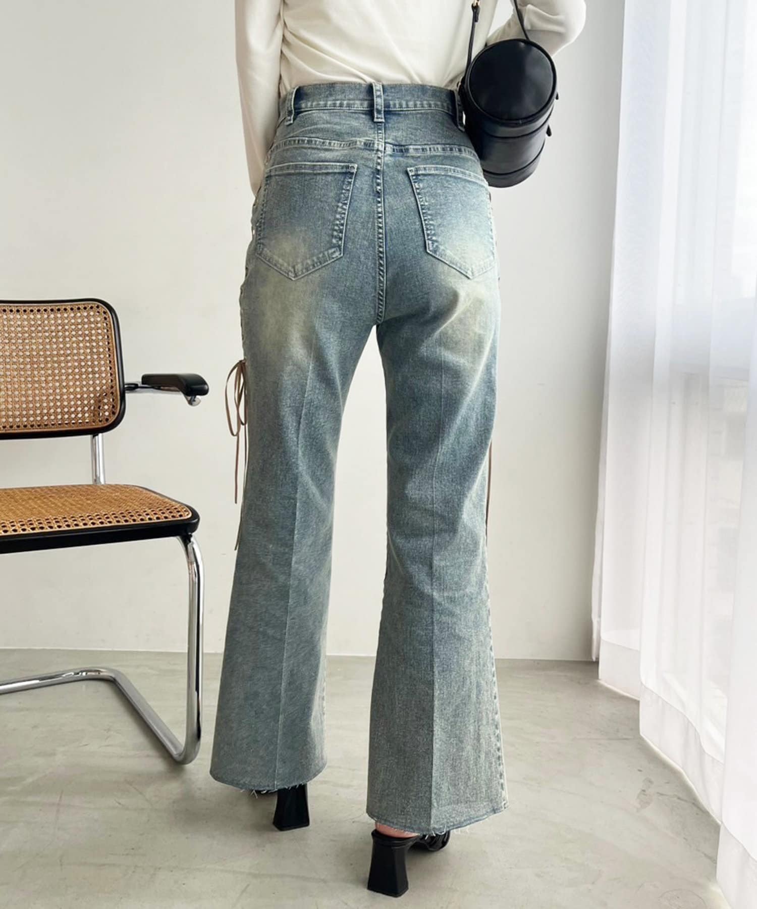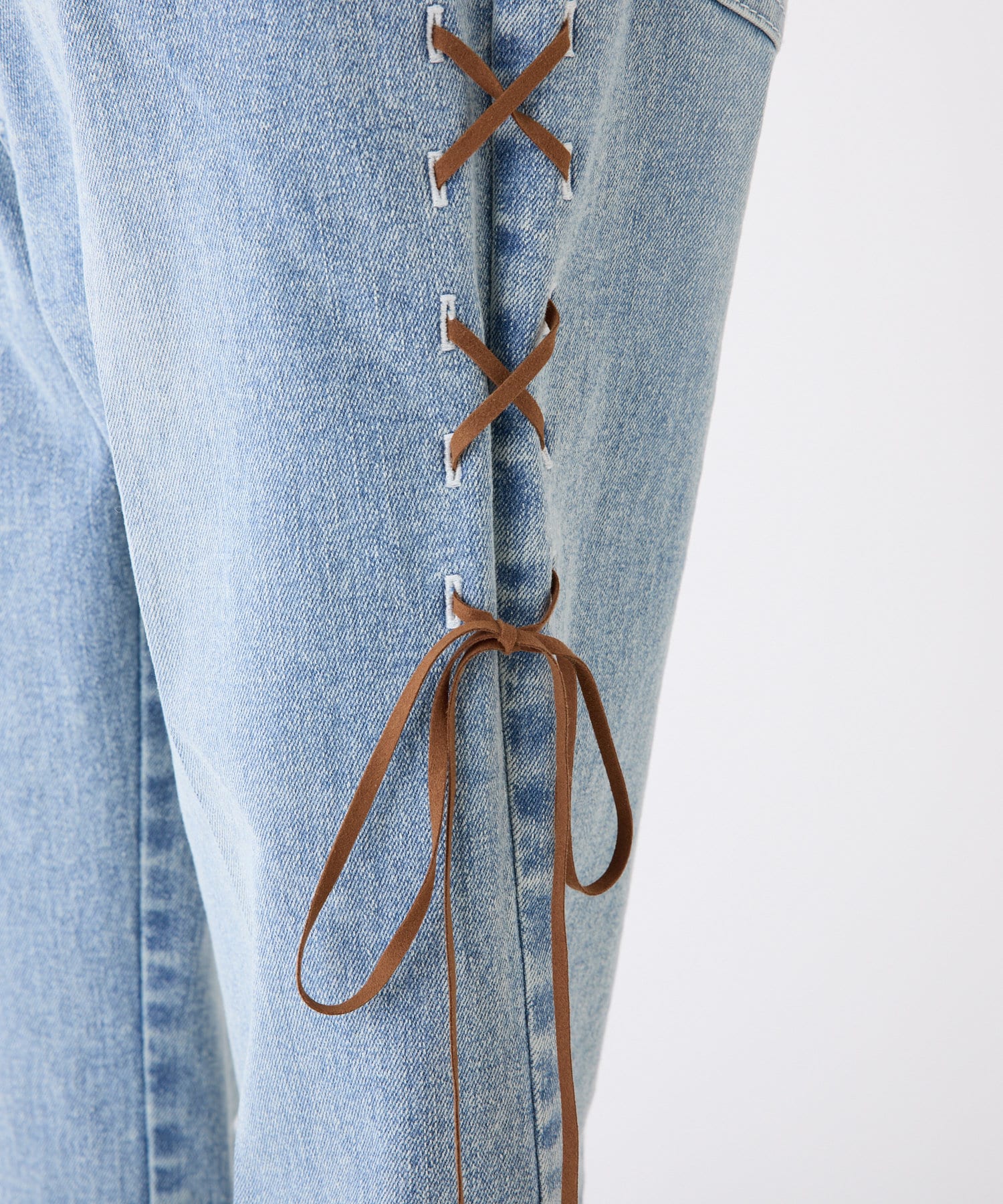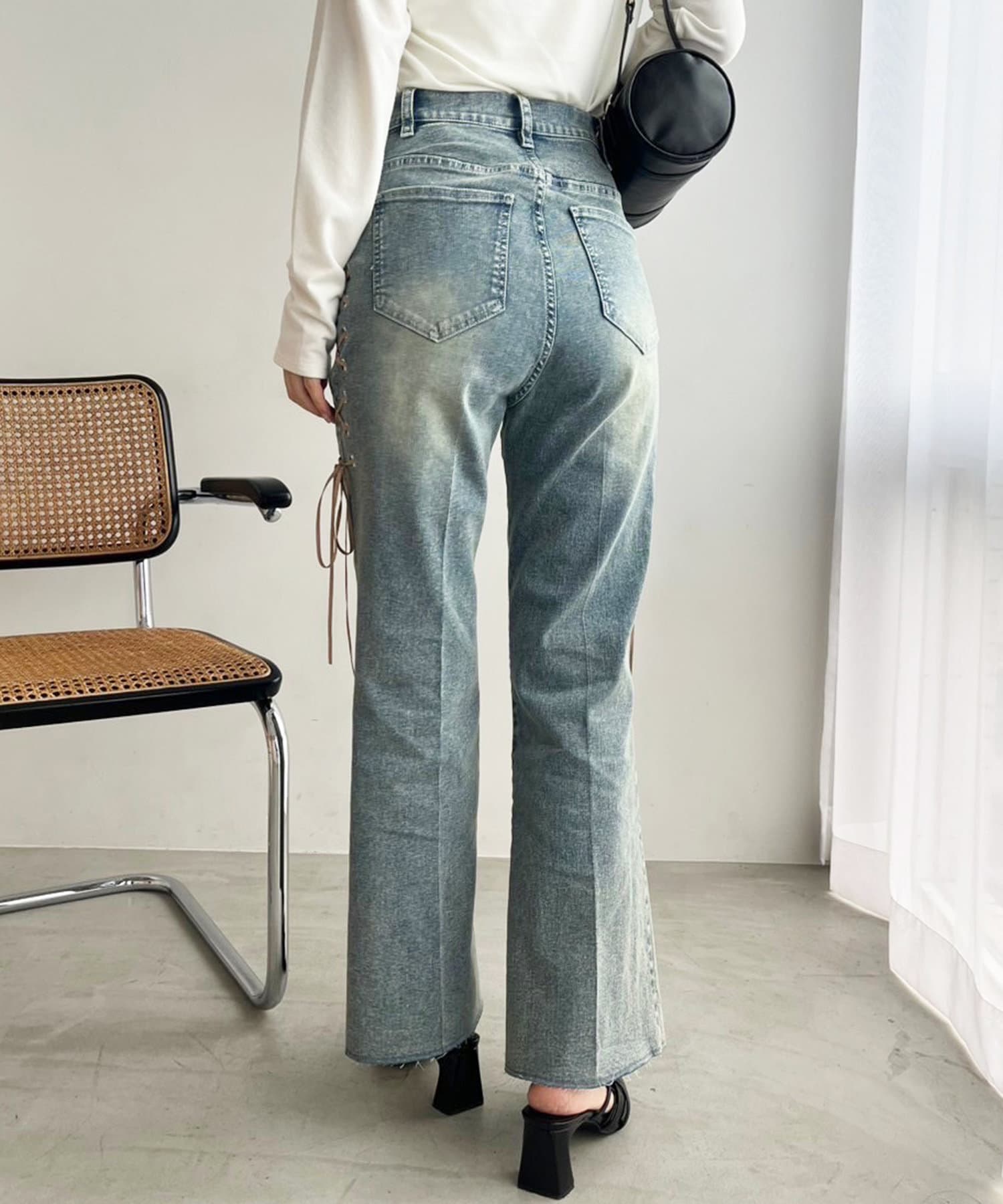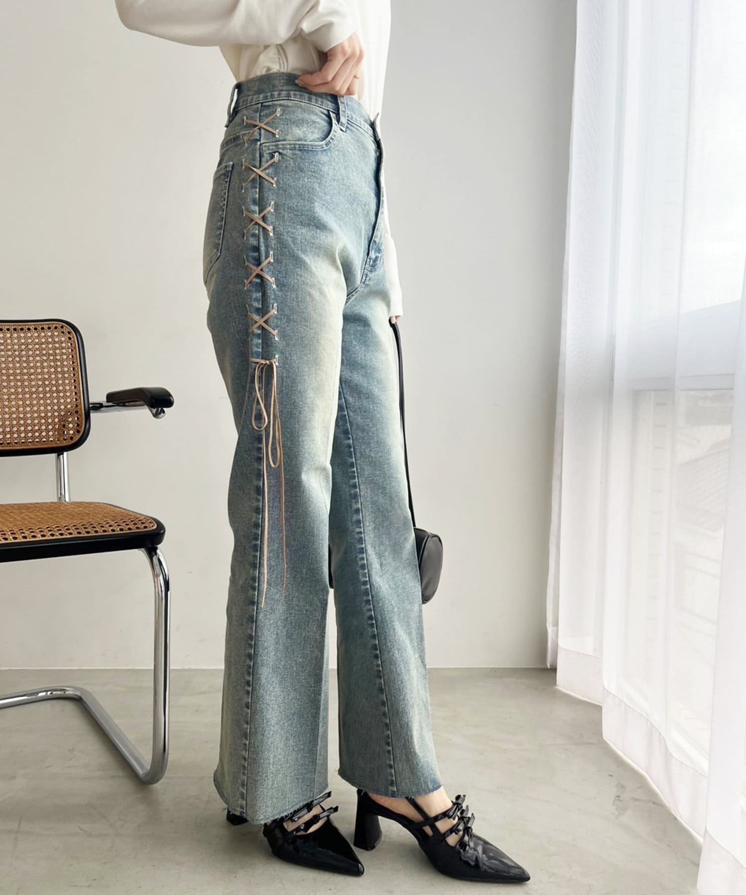 サイドのレースアップがおしゃれ見えするデニムパンツ