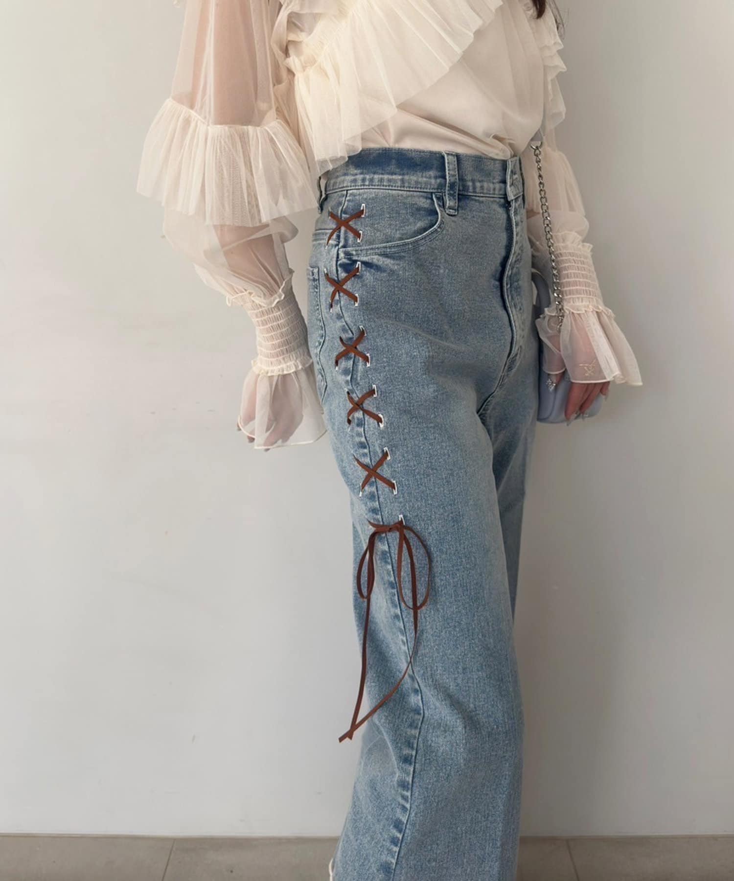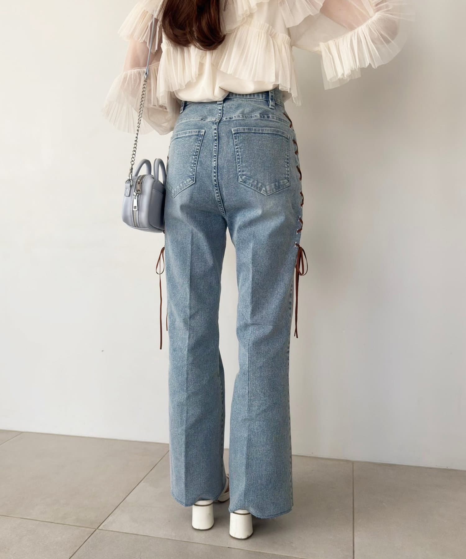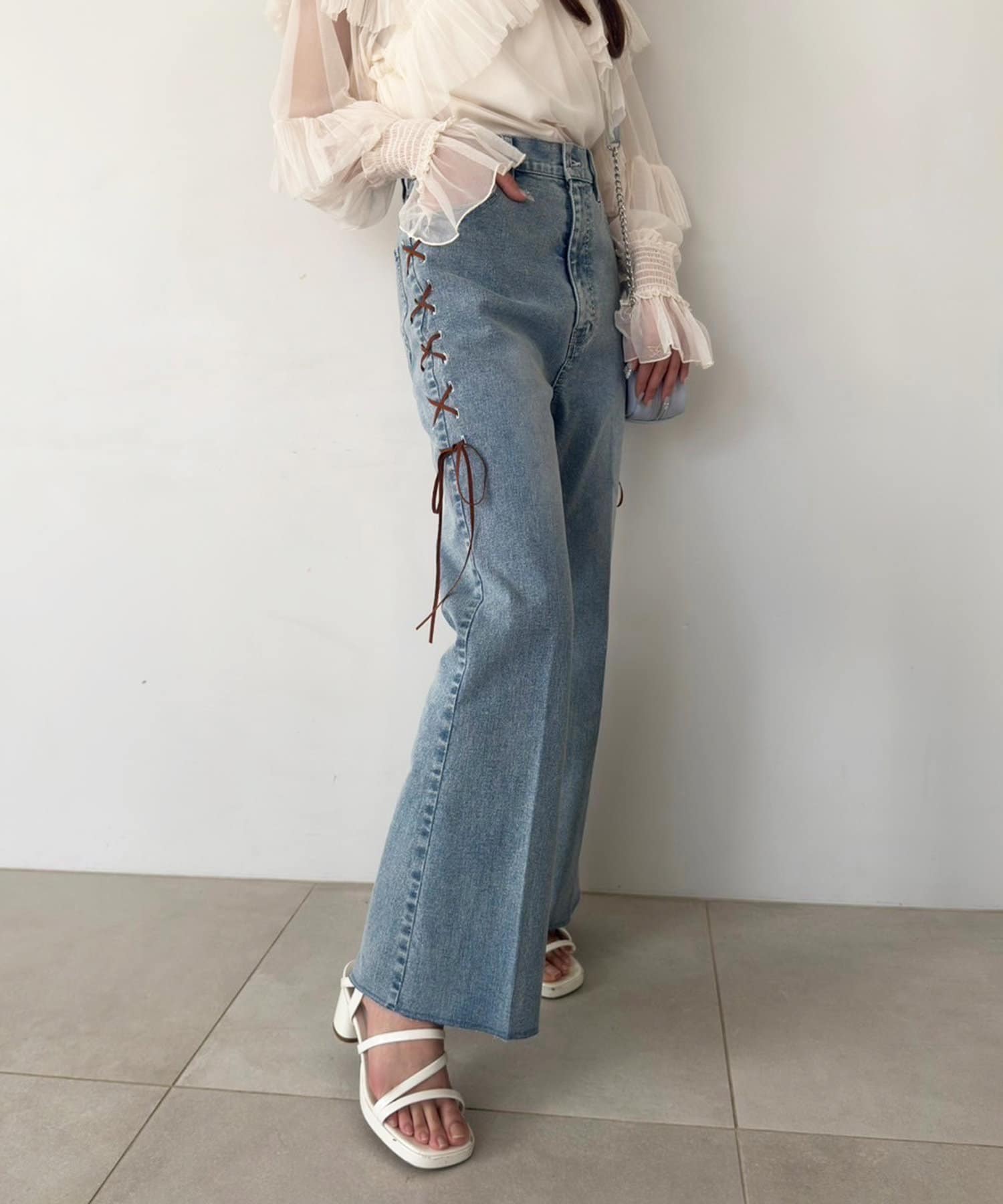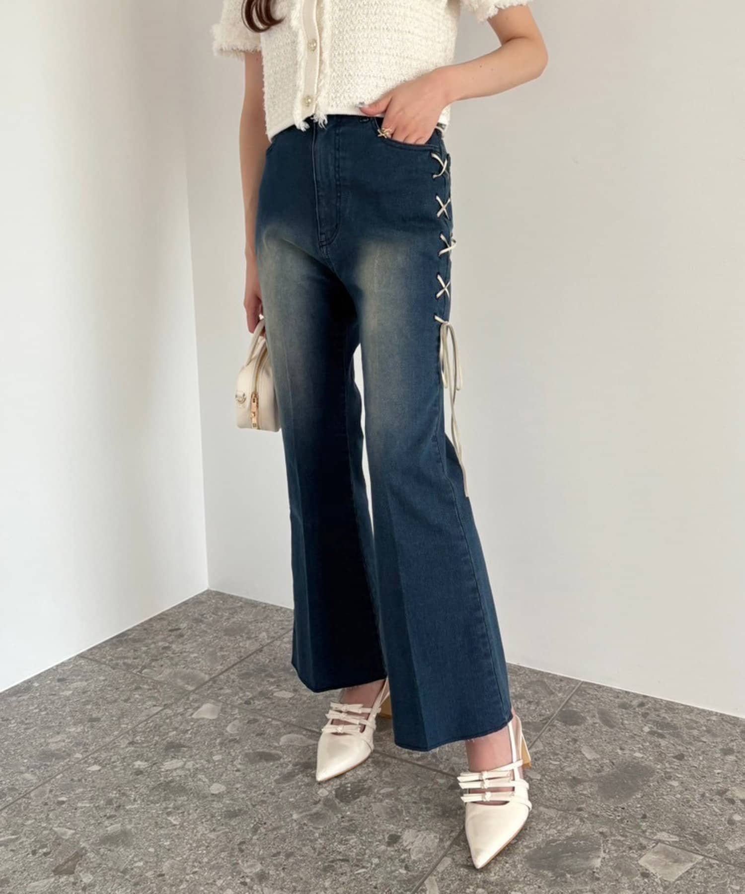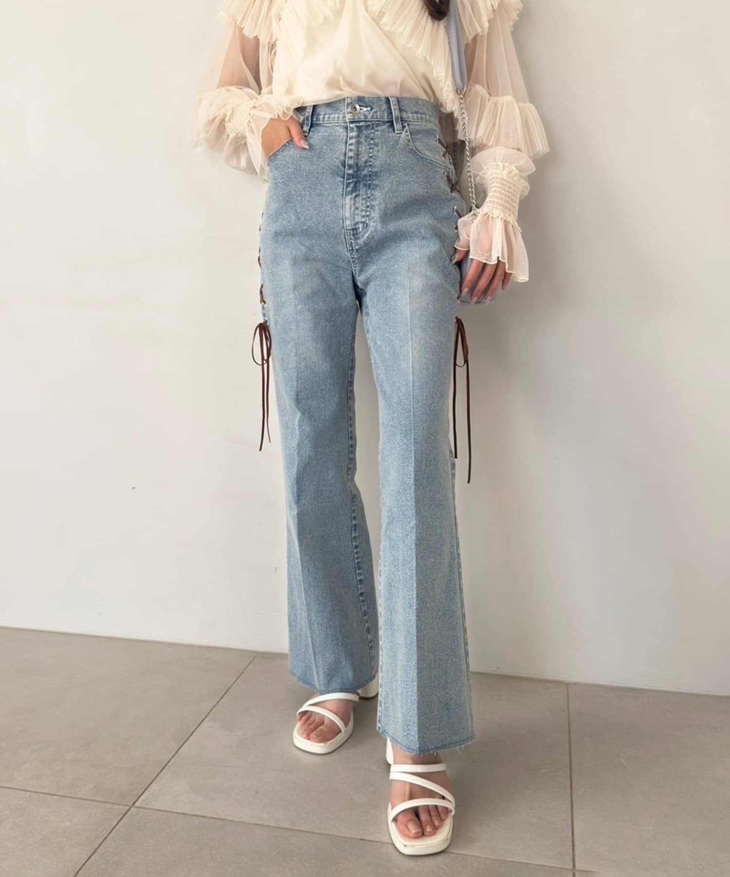 サイドのレースアップがおしゃれ見えするデニムパンツ
