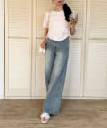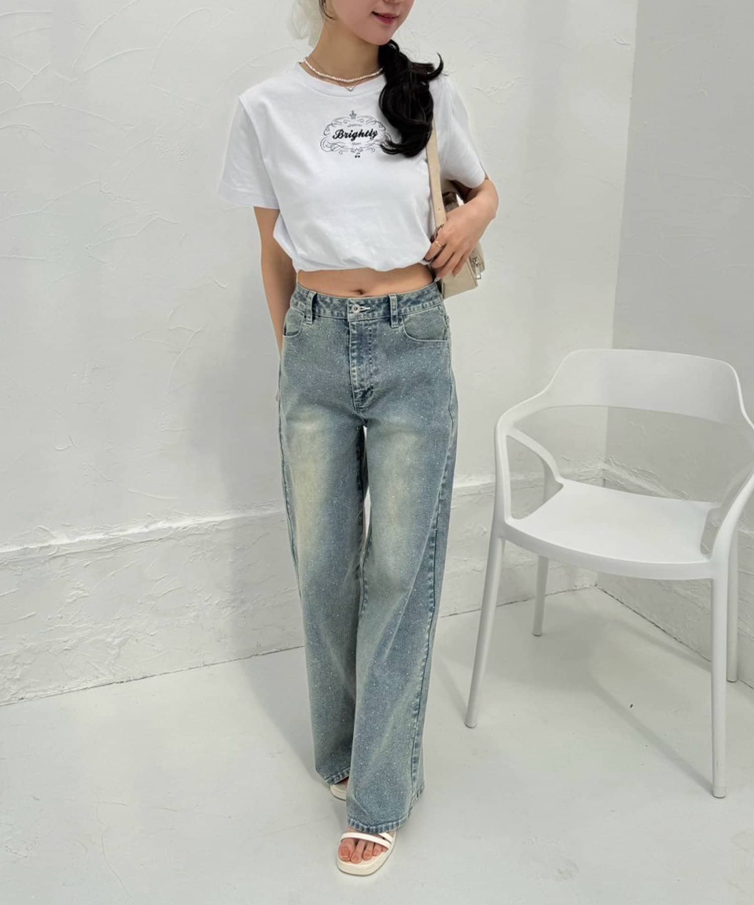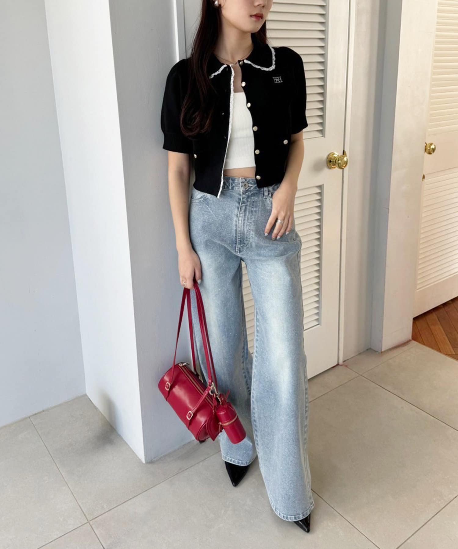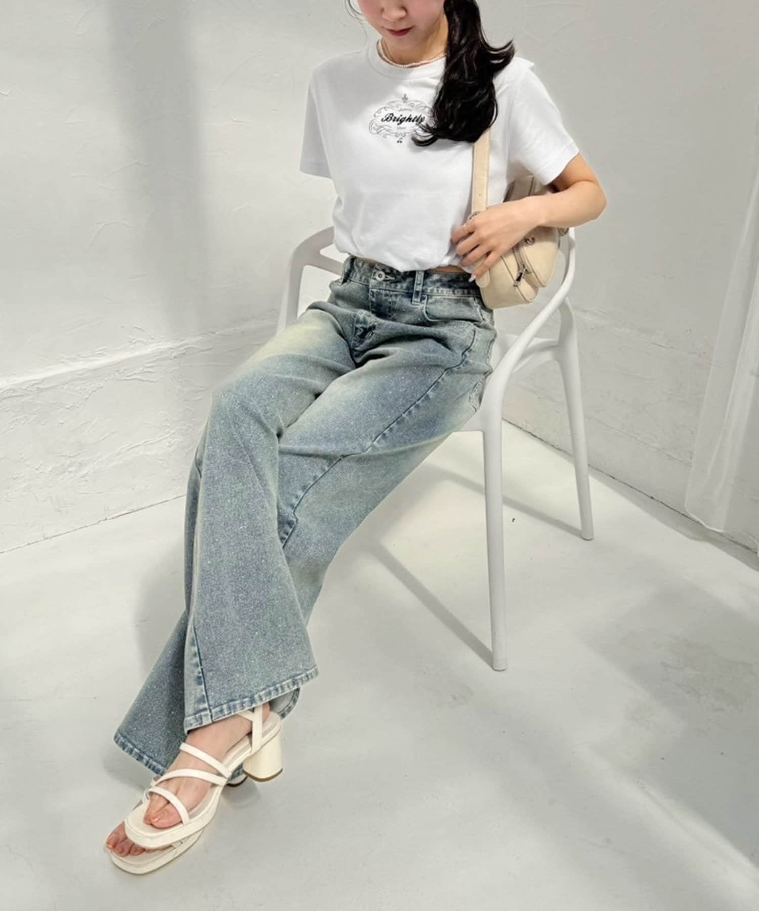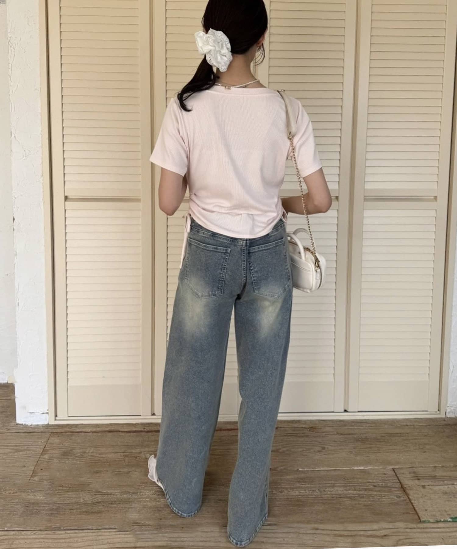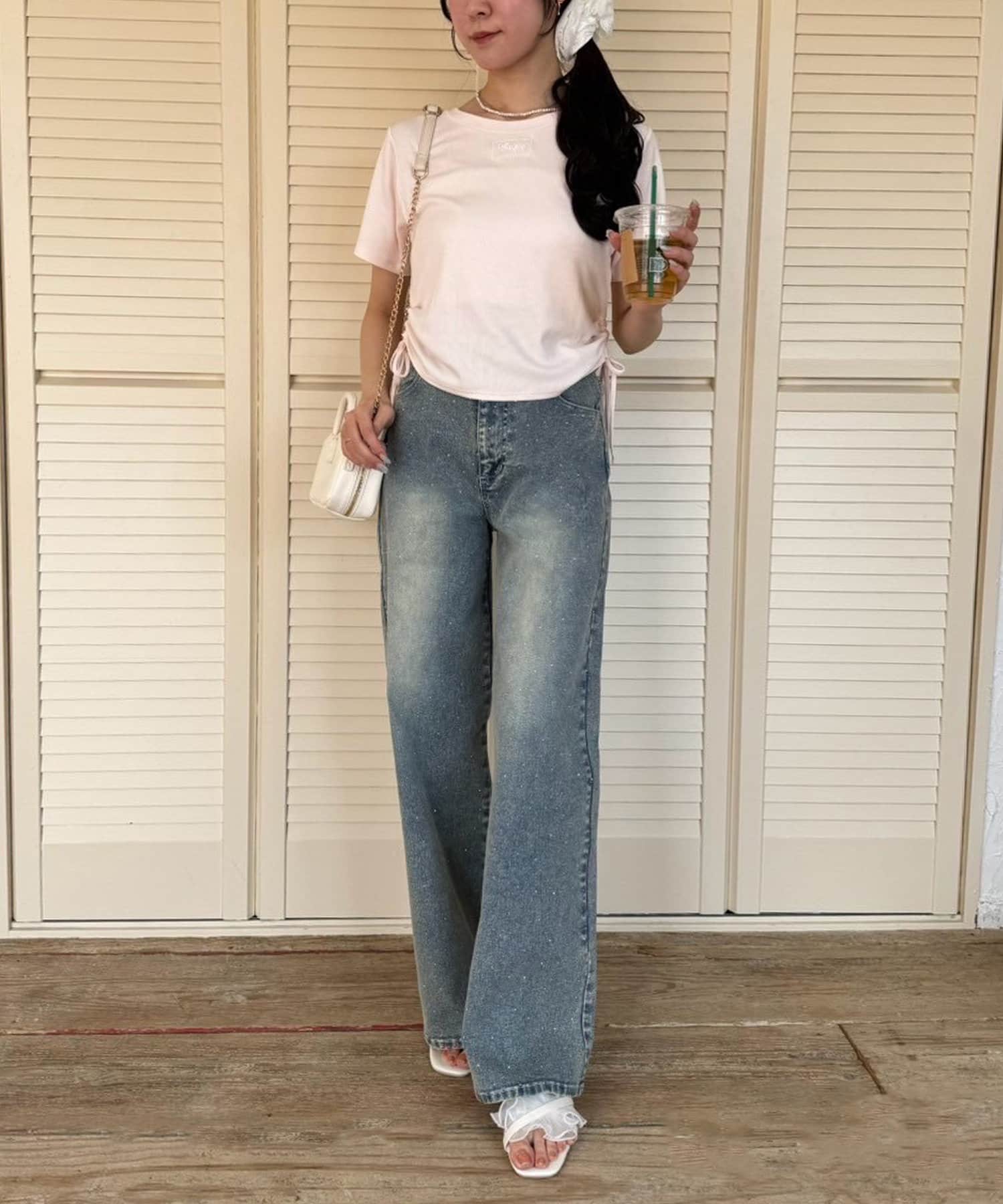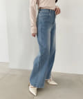 全体的にゆったりとしたシルエットのストレートデニムは、華奢見せ効果も。