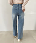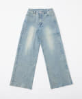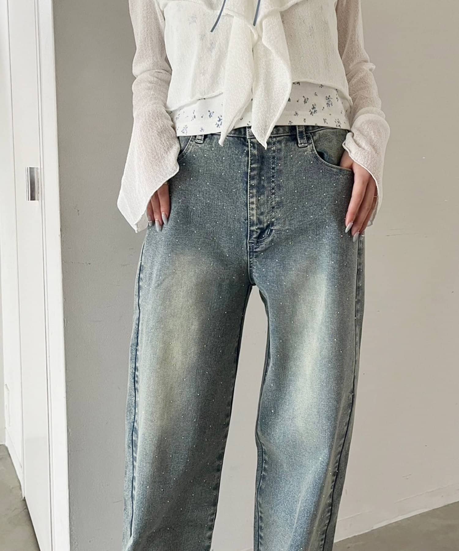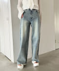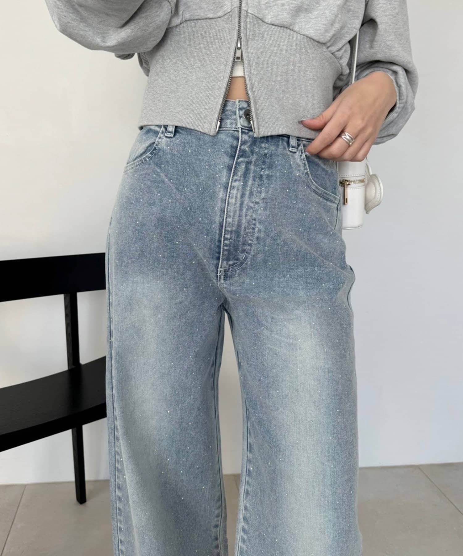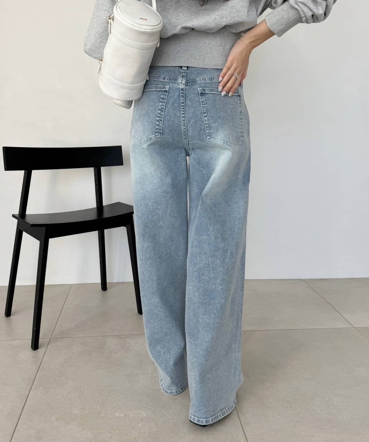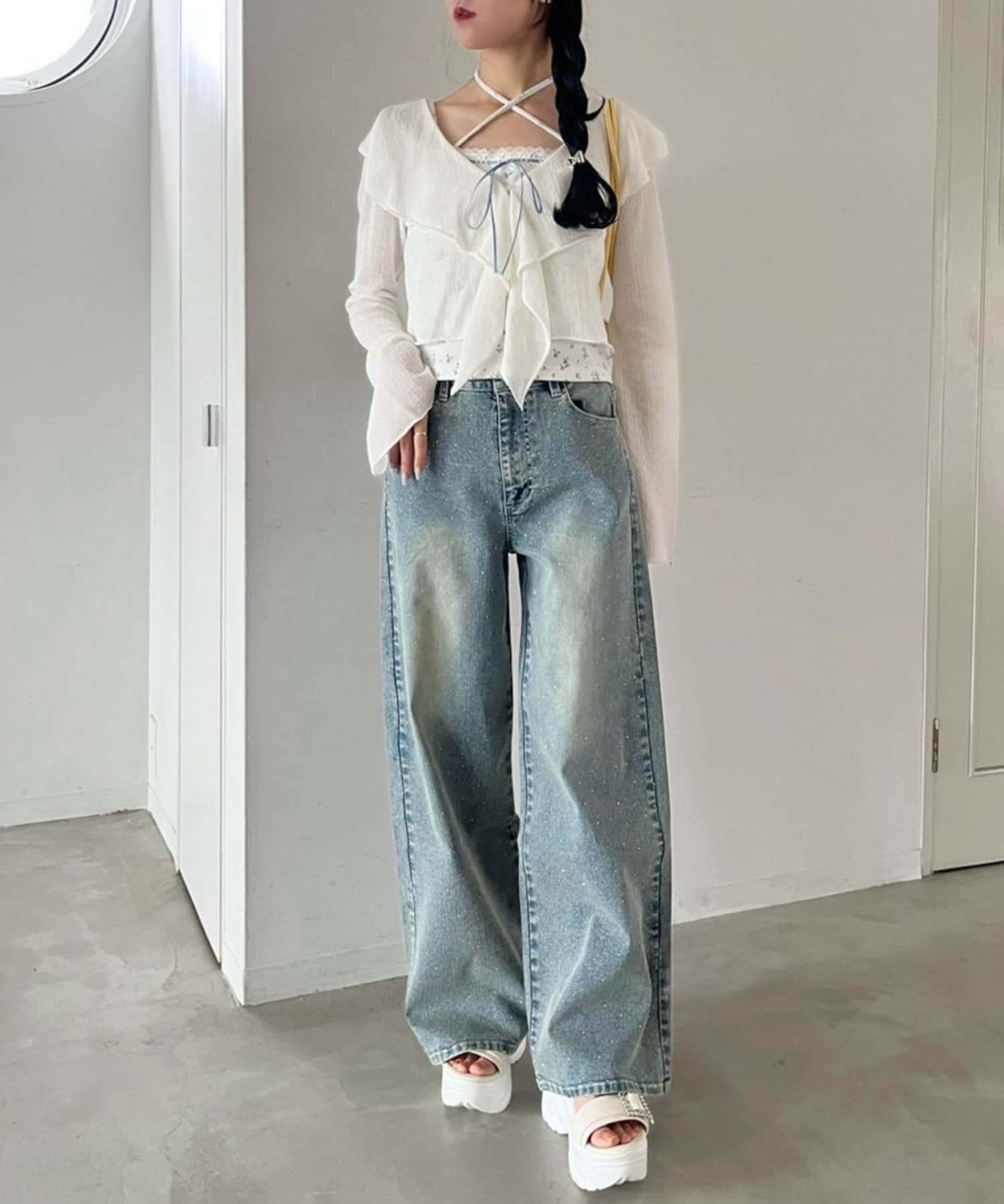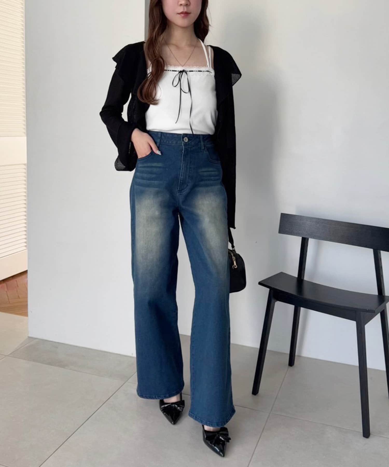 全体的にゆったりとしたシルエットのストレートデニムは、華奢見せ効果も。