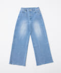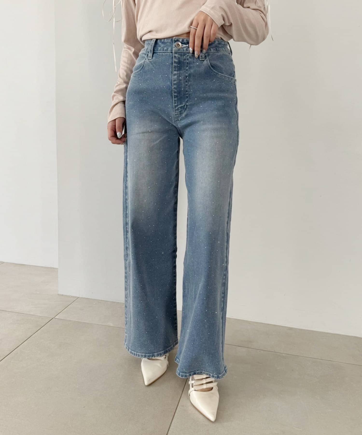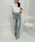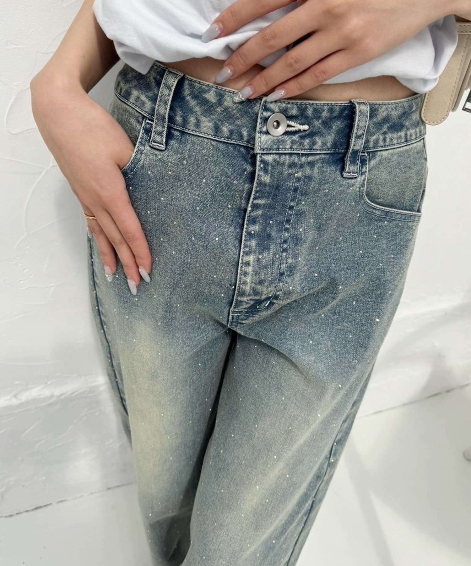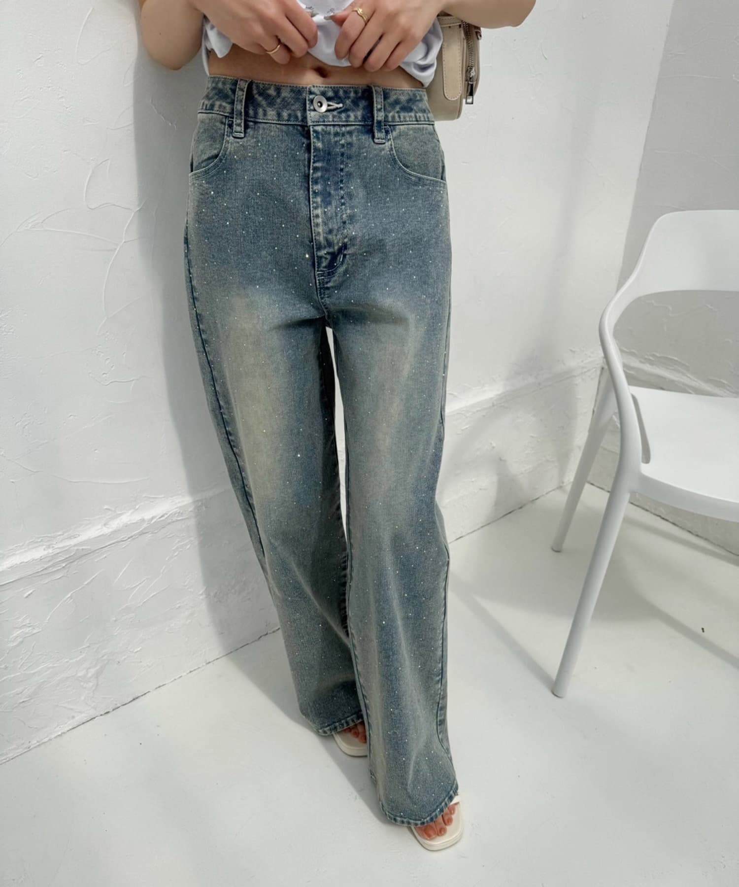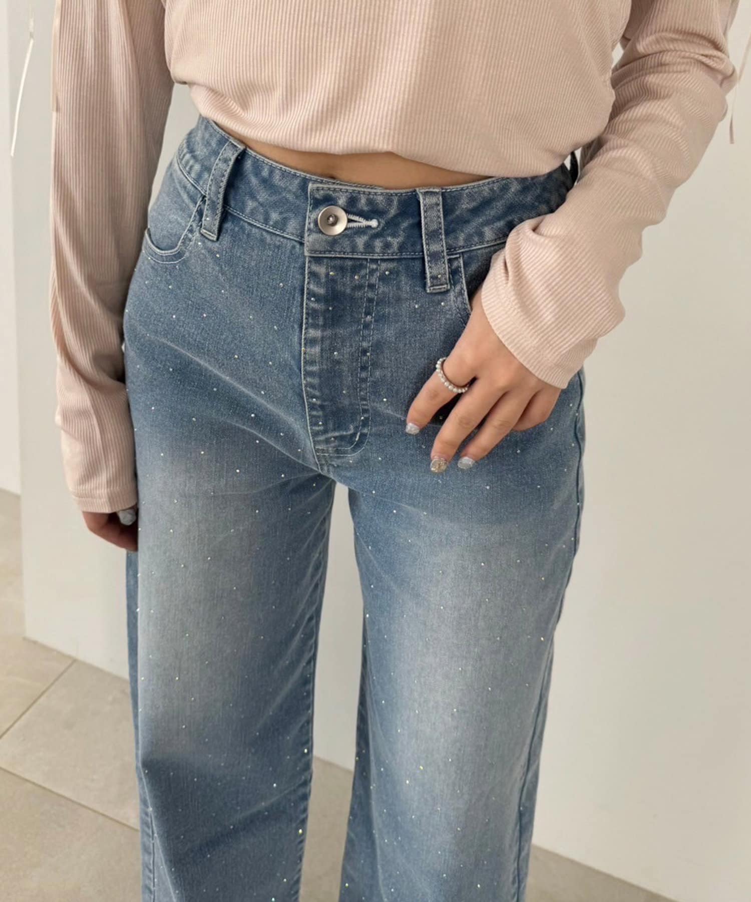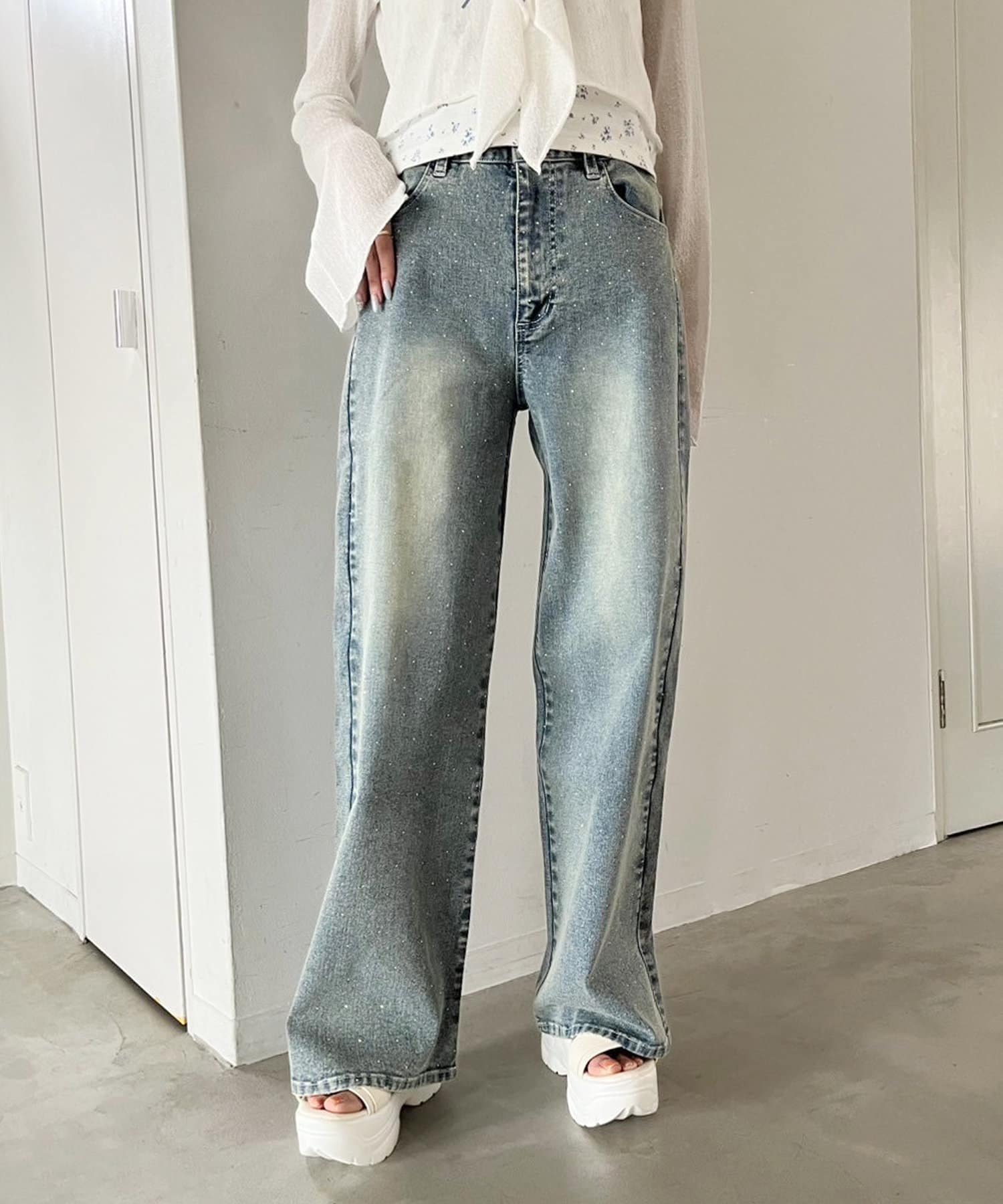 全体的にゆったりとしたシルエットのストレートデニムは、華奢見せ効果も。