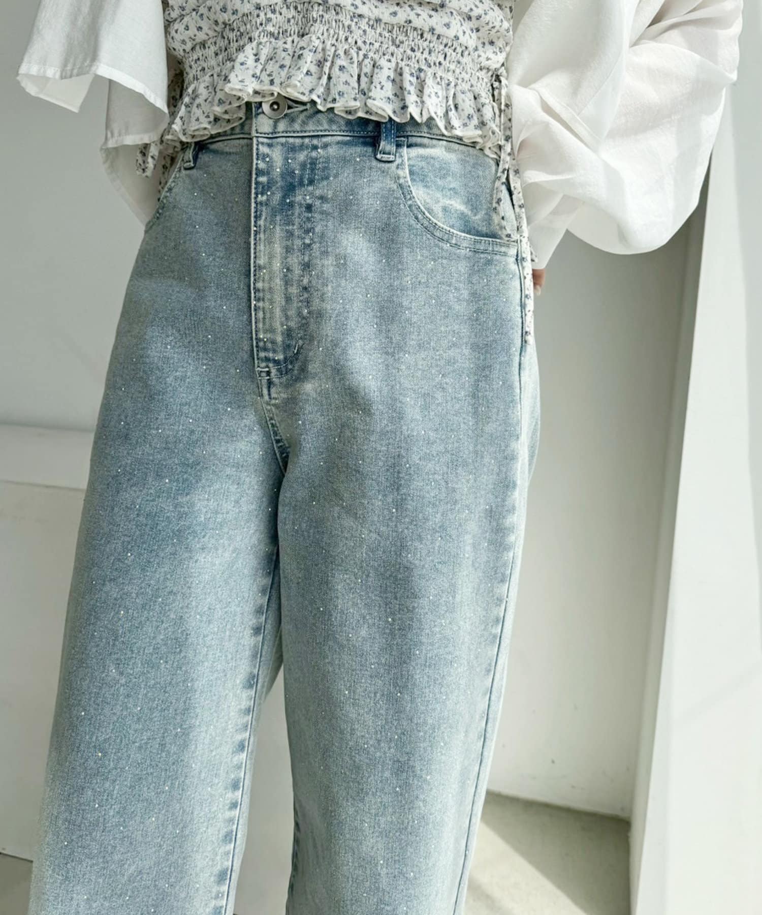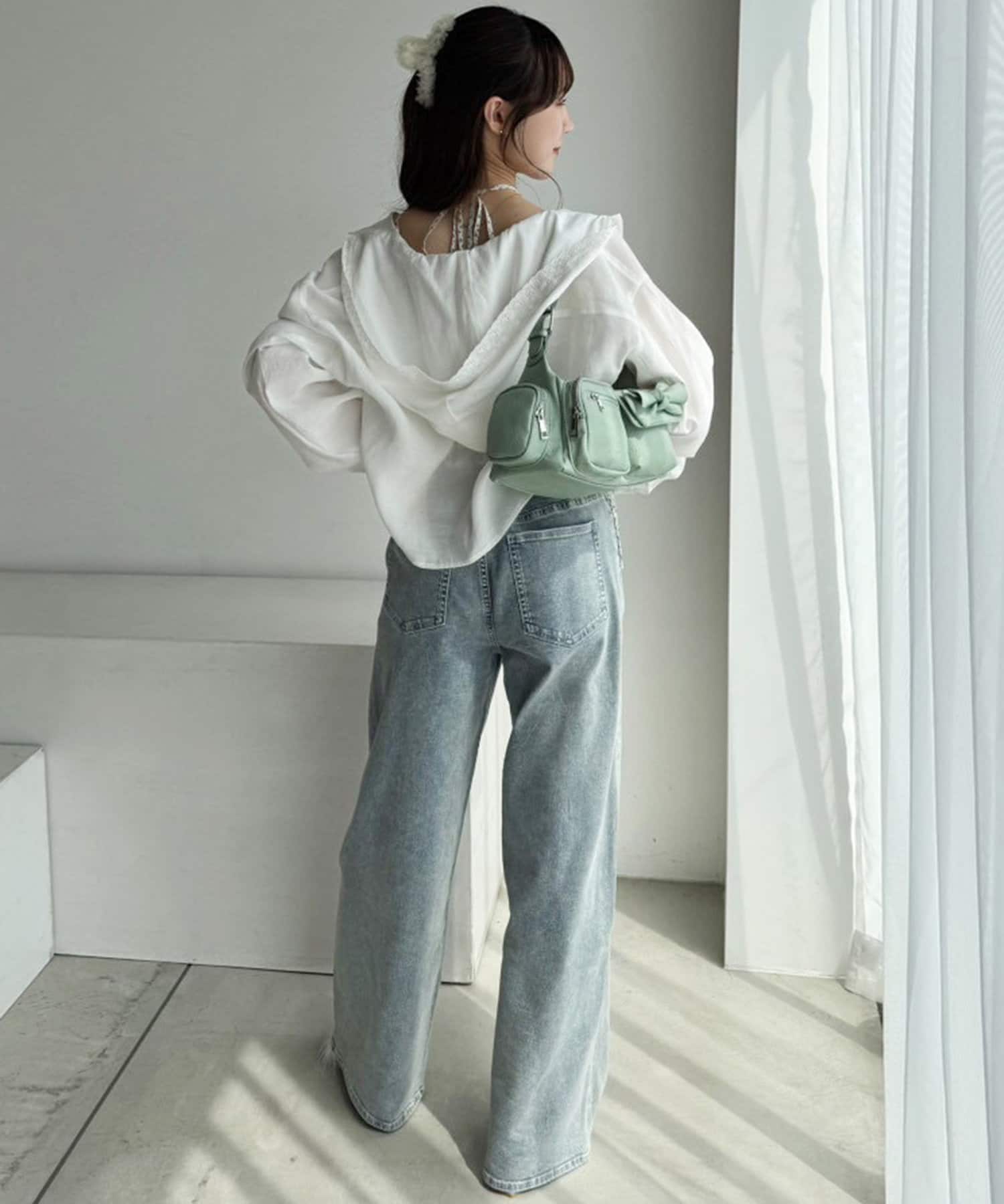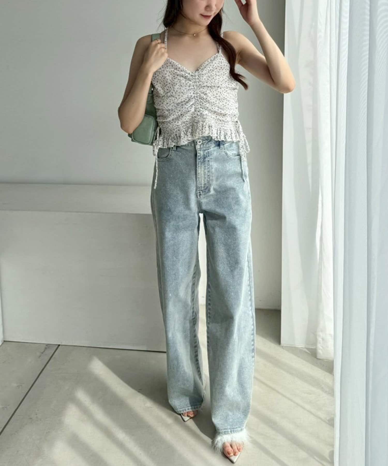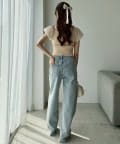 全体的にゆったりとしたシルエットのストレートデニムは、華奢見せ効果も。