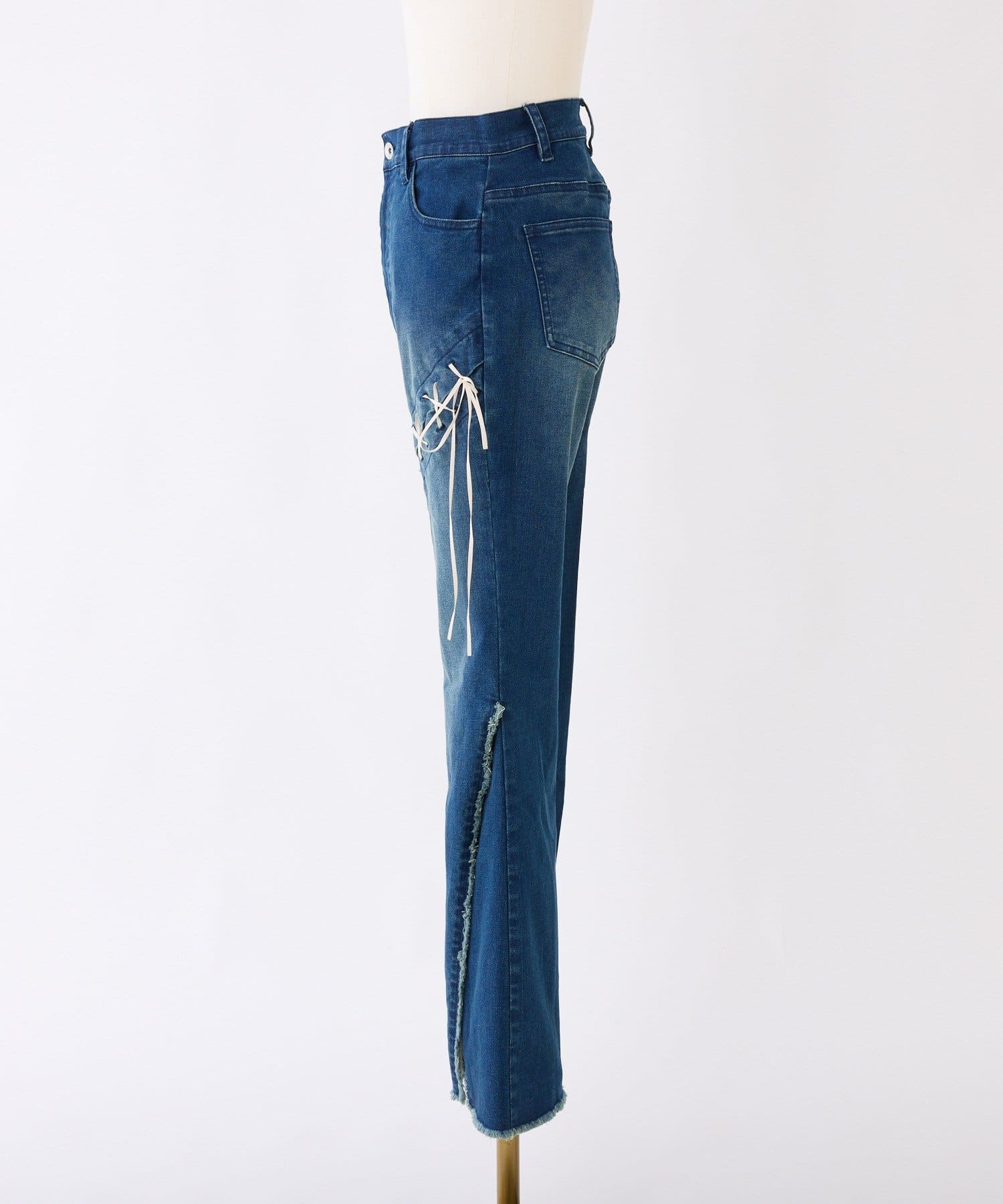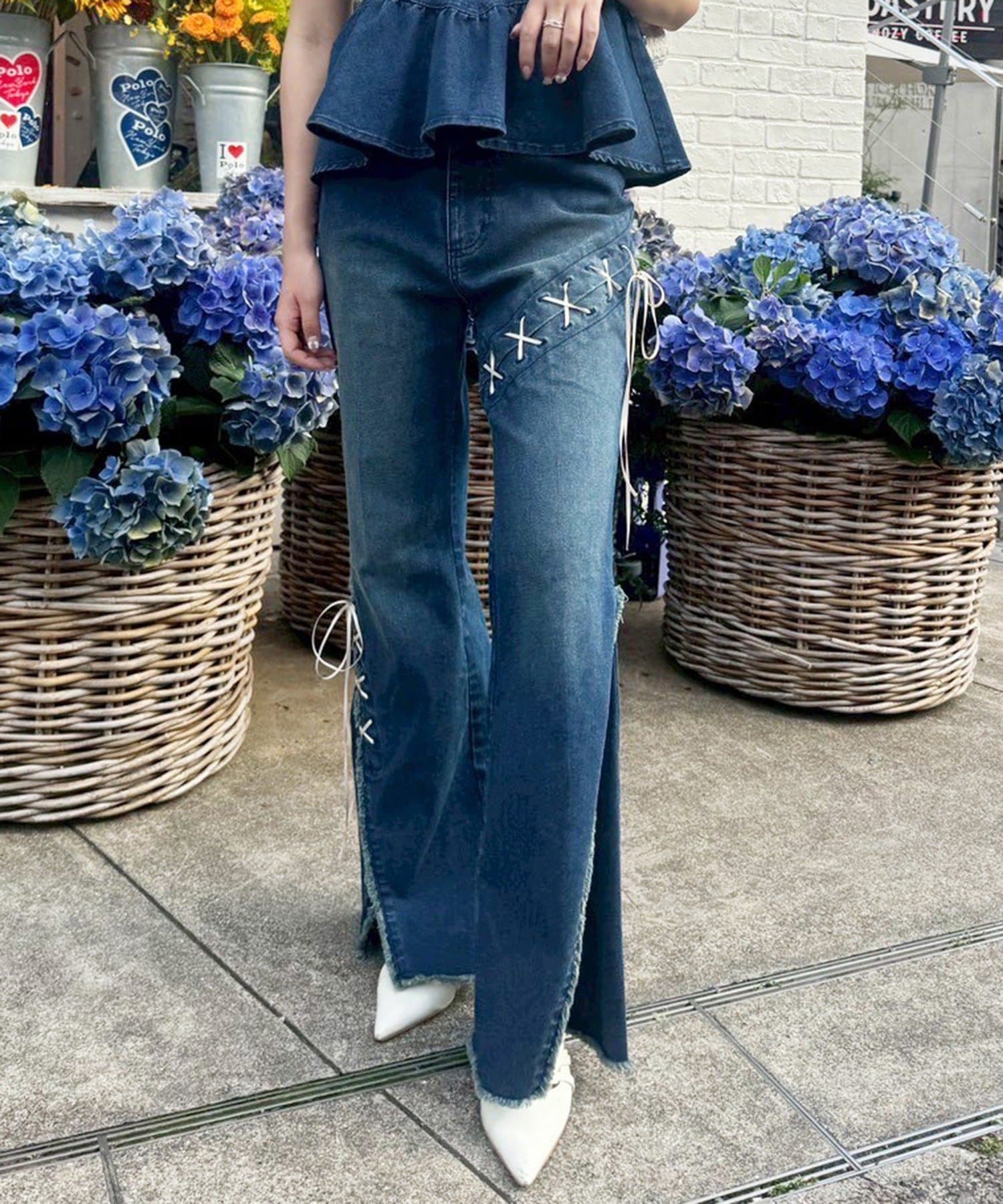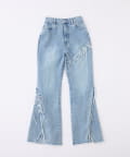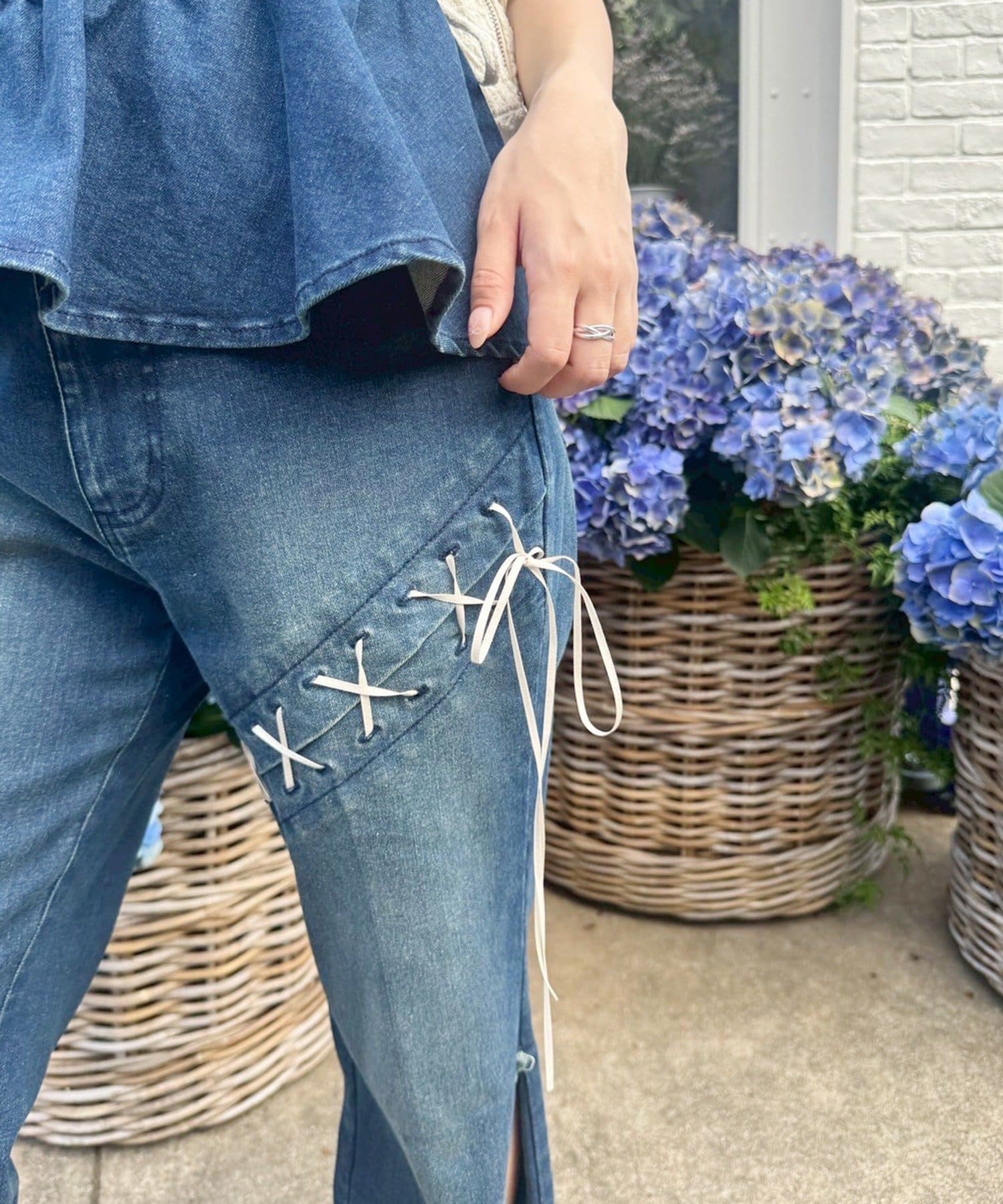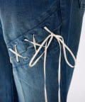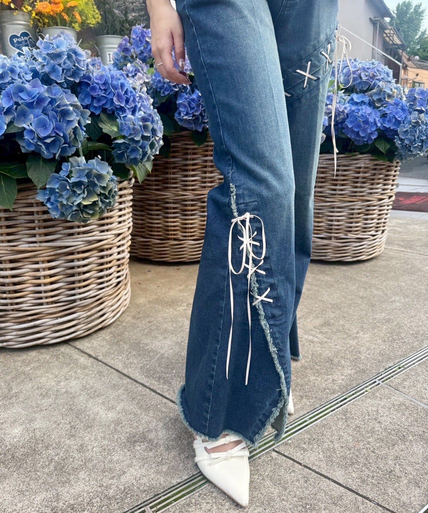 レースアップデザインががおしゃれ見えするデニムパンツ