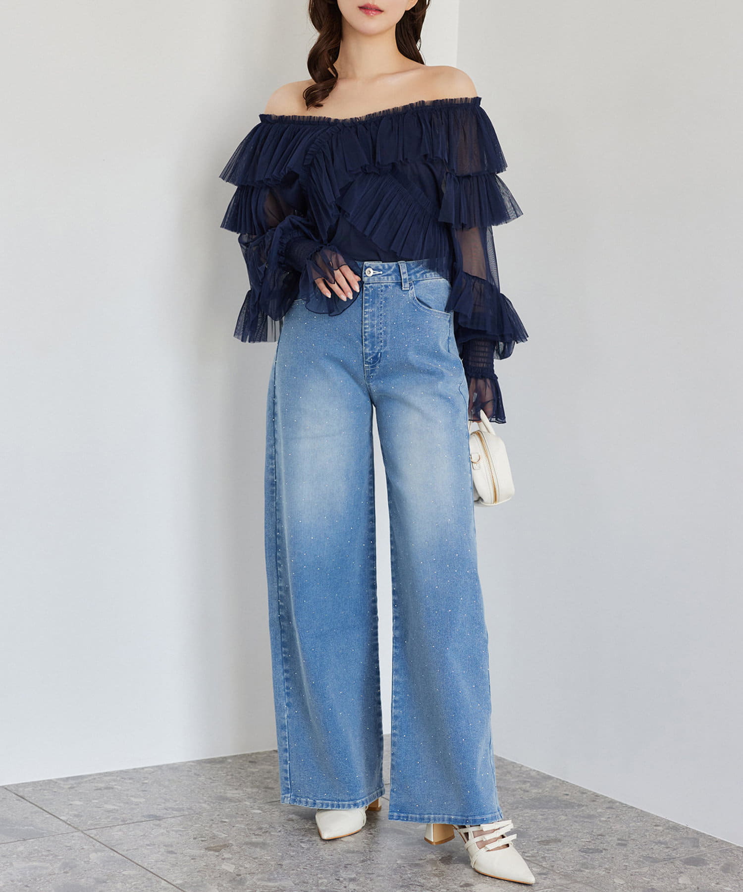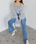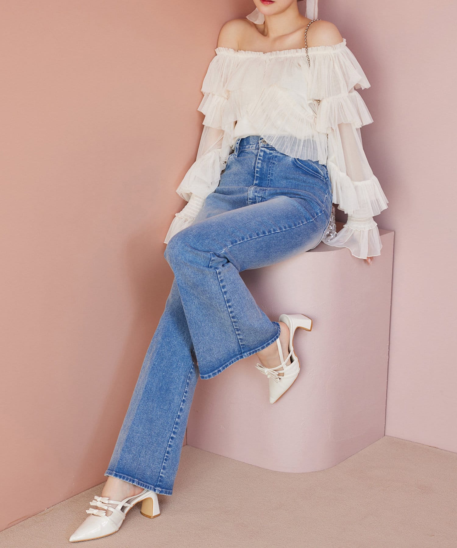 オフショルにしてマーメイドスカートやミニボトムで合わせれば、女性らしい着こなしに。