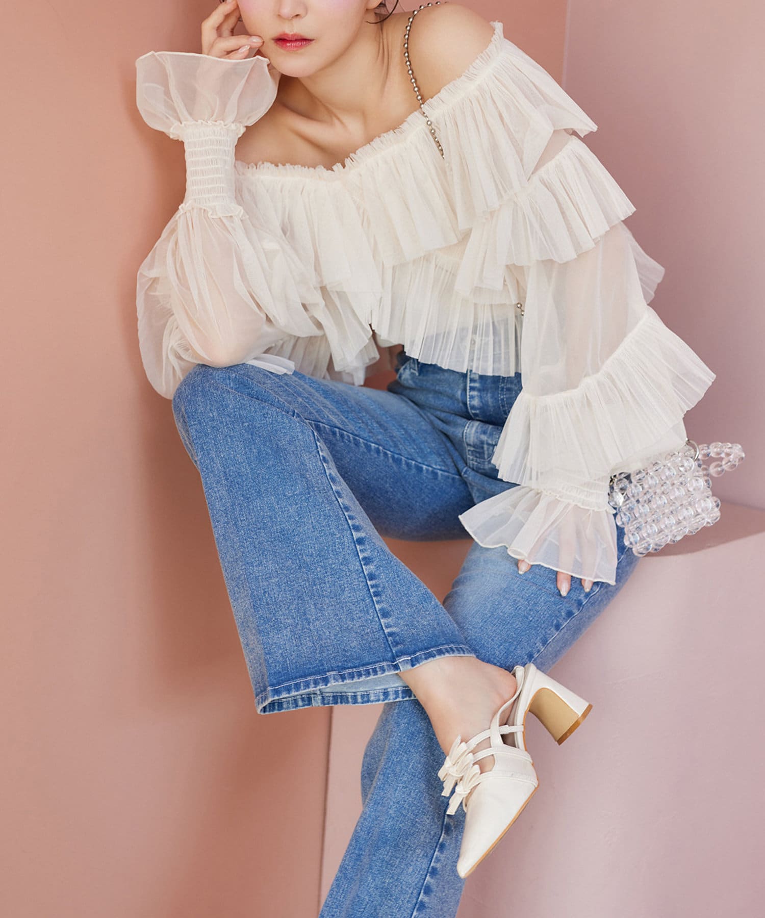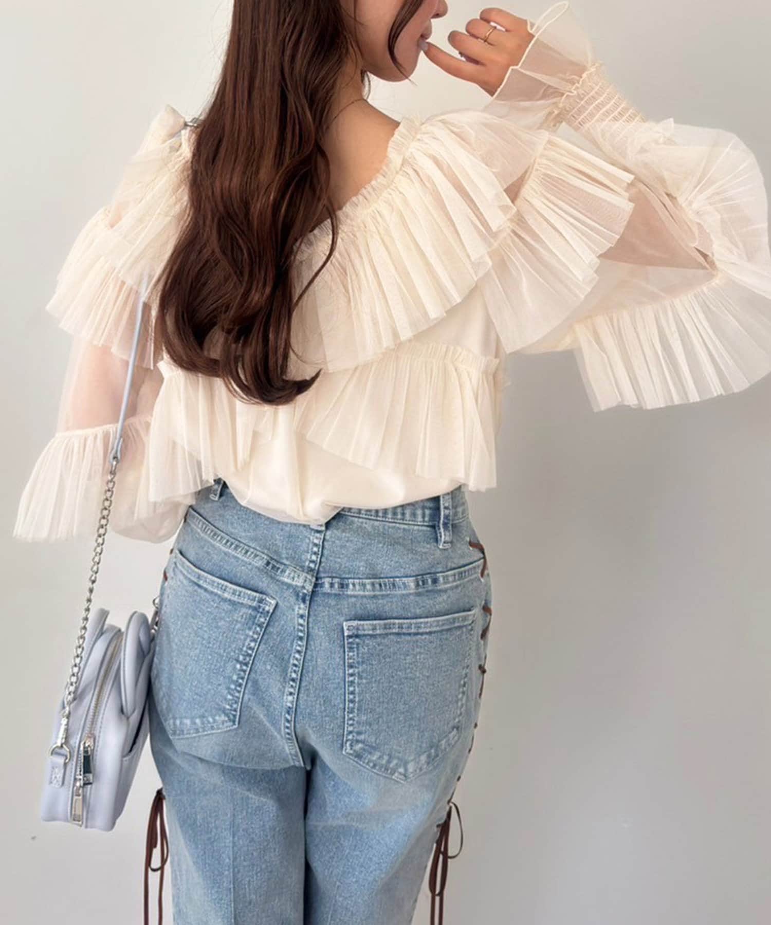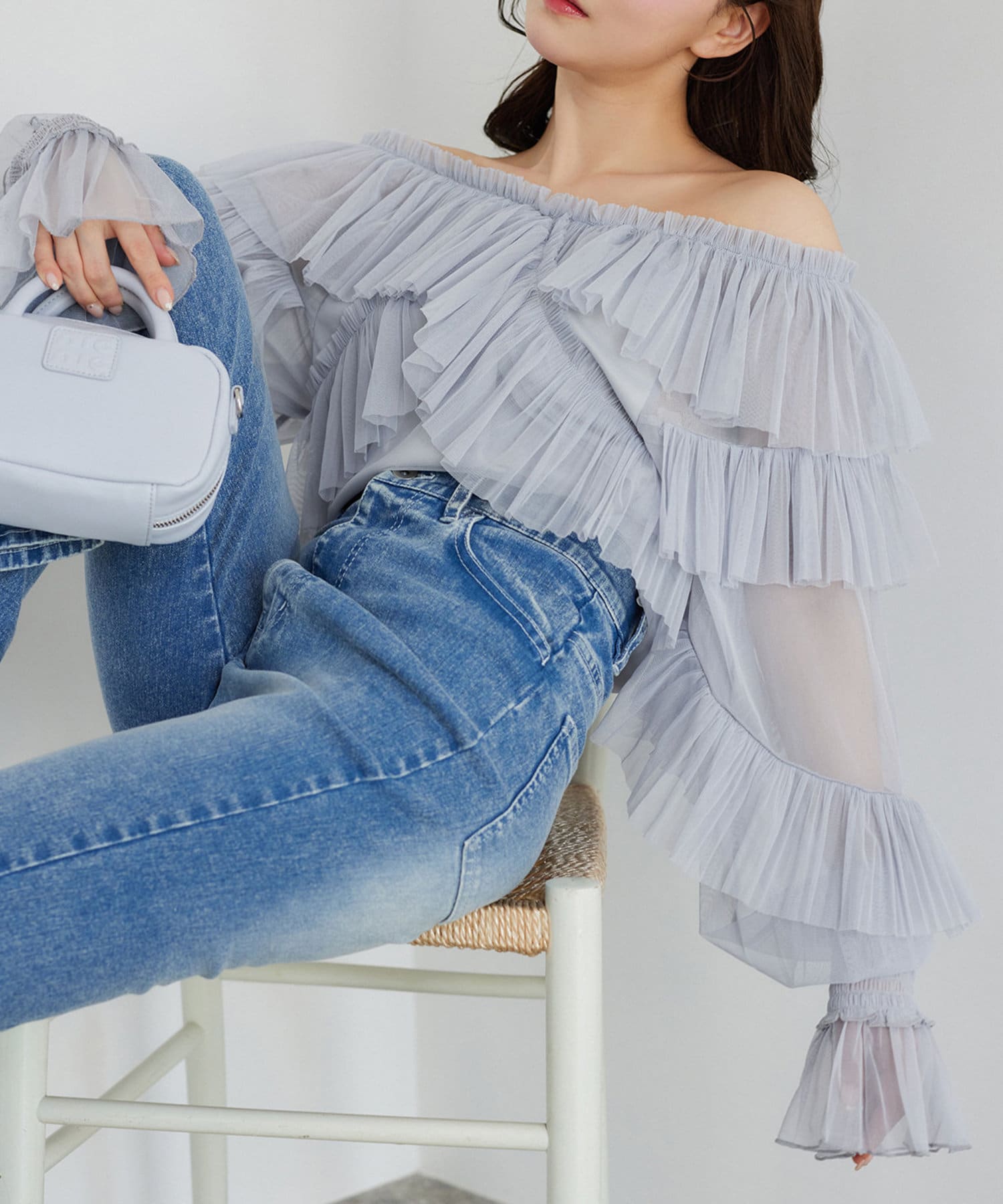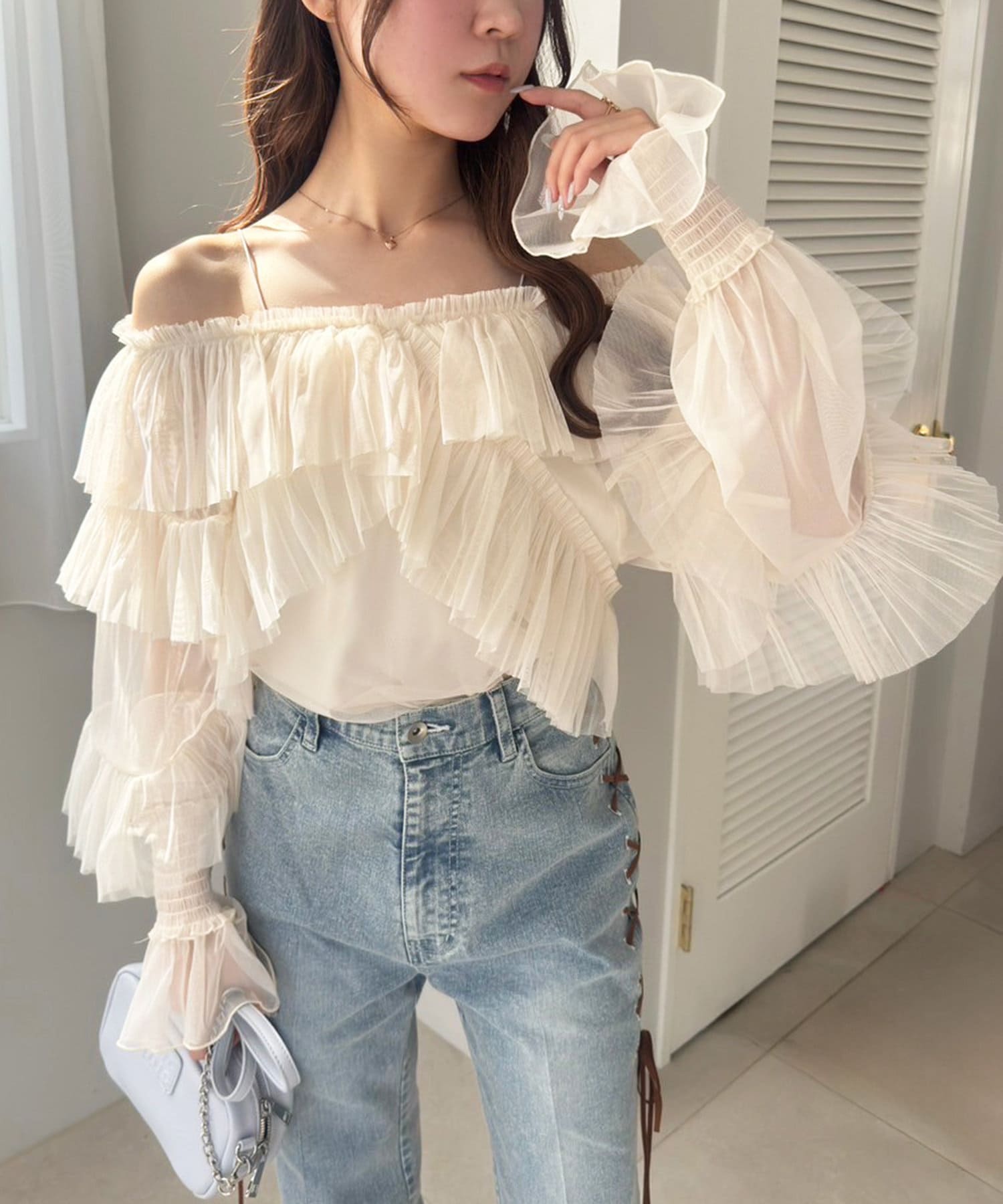 Vネックとオフショルの2WAYで着られるフリルブラウス。