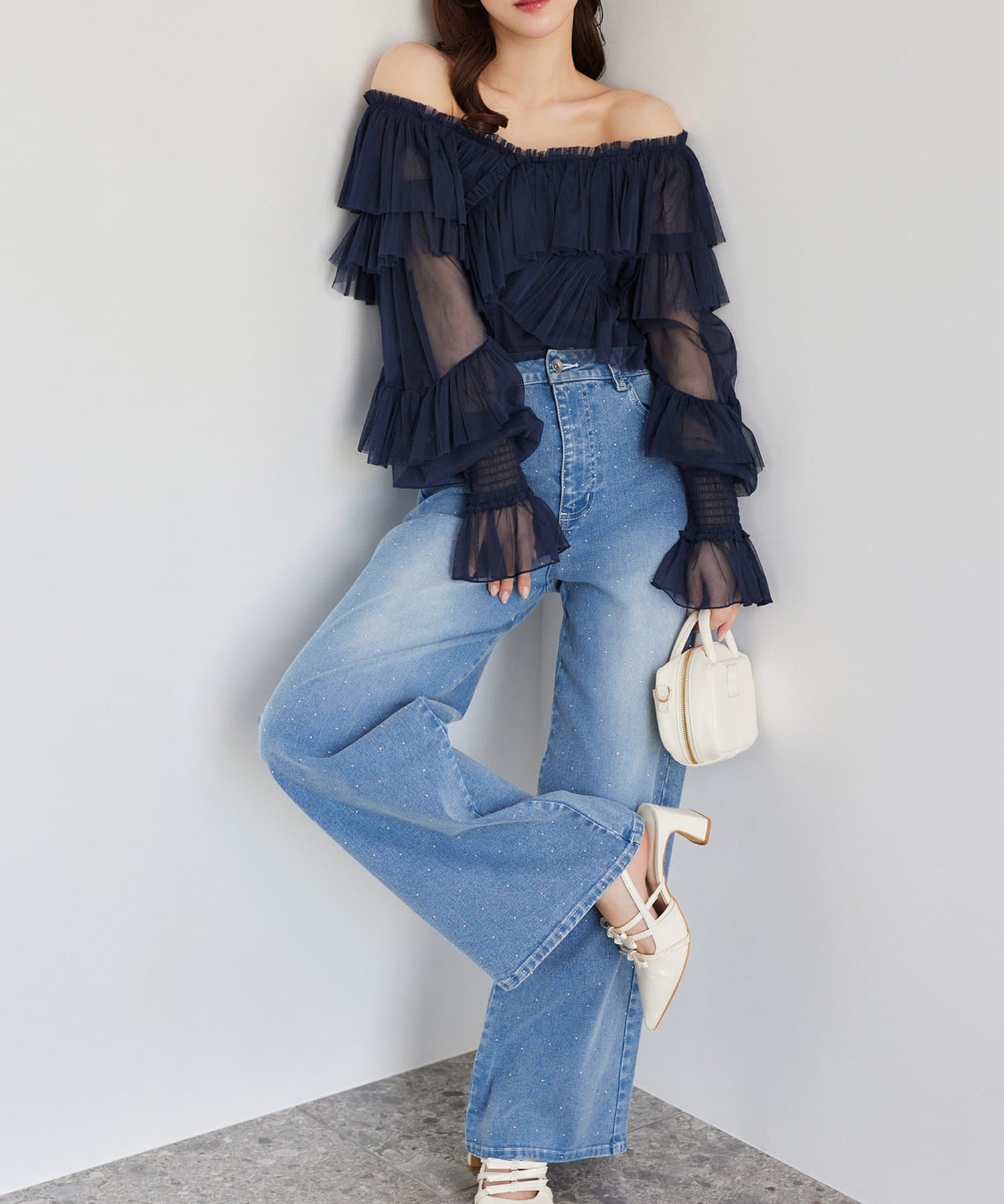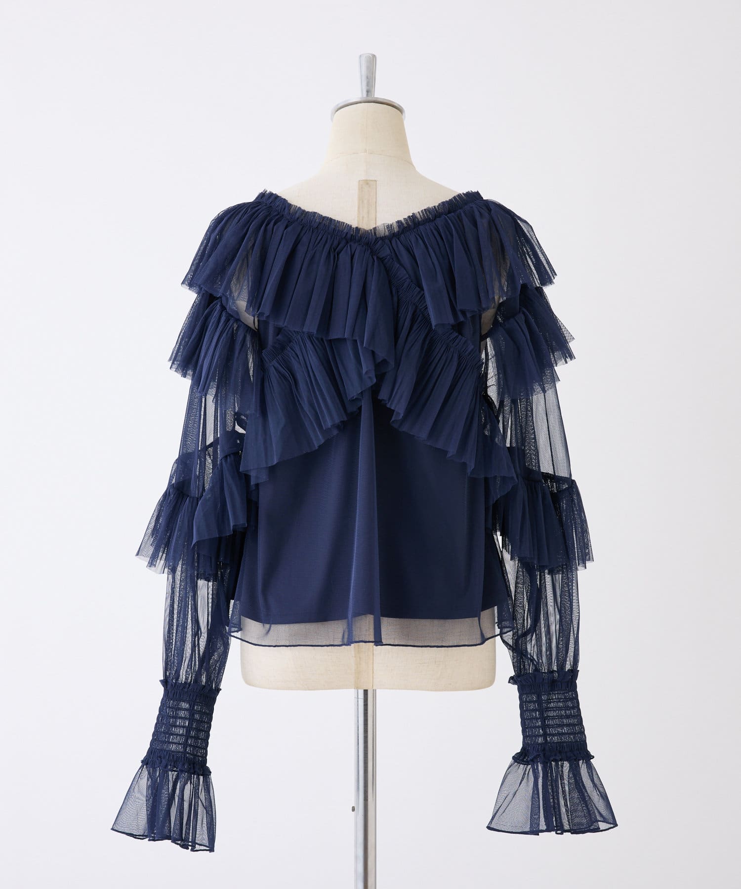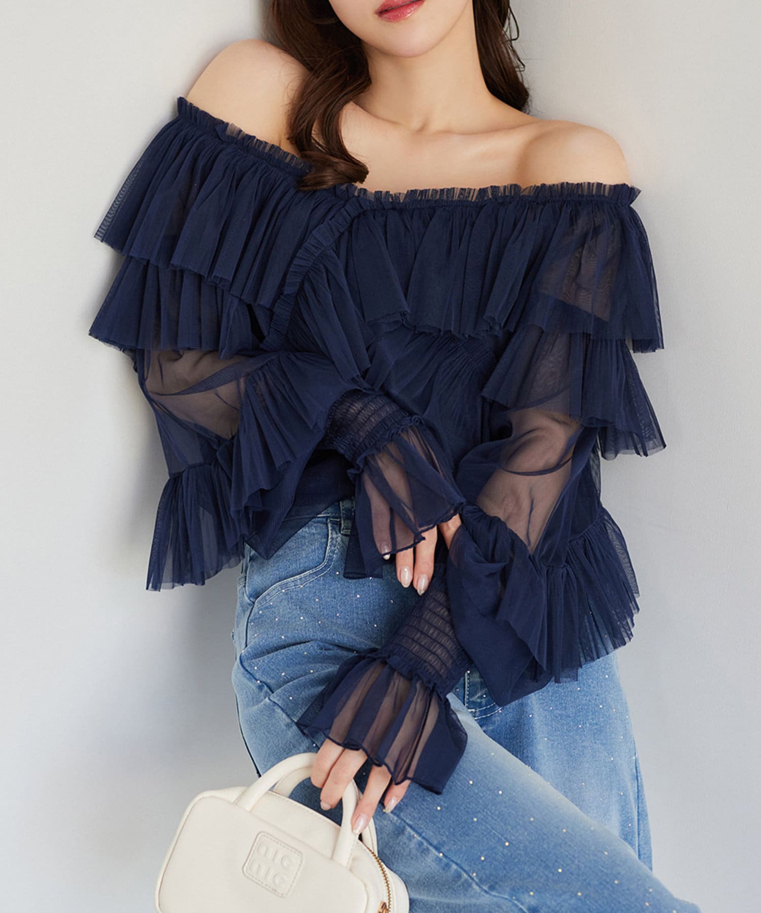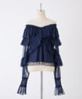 Vネックとオフショルの2WAYで着られるフリルブラウス。