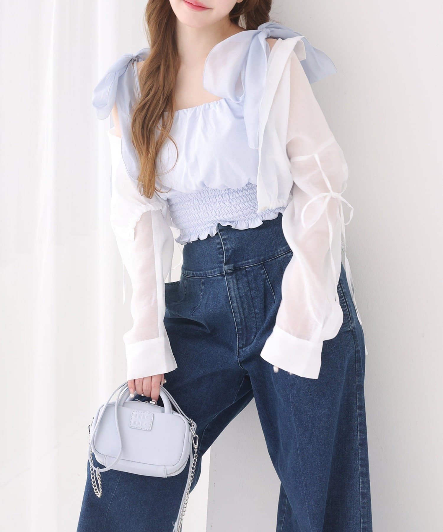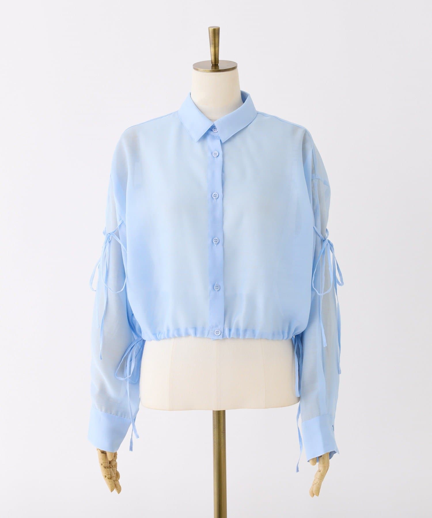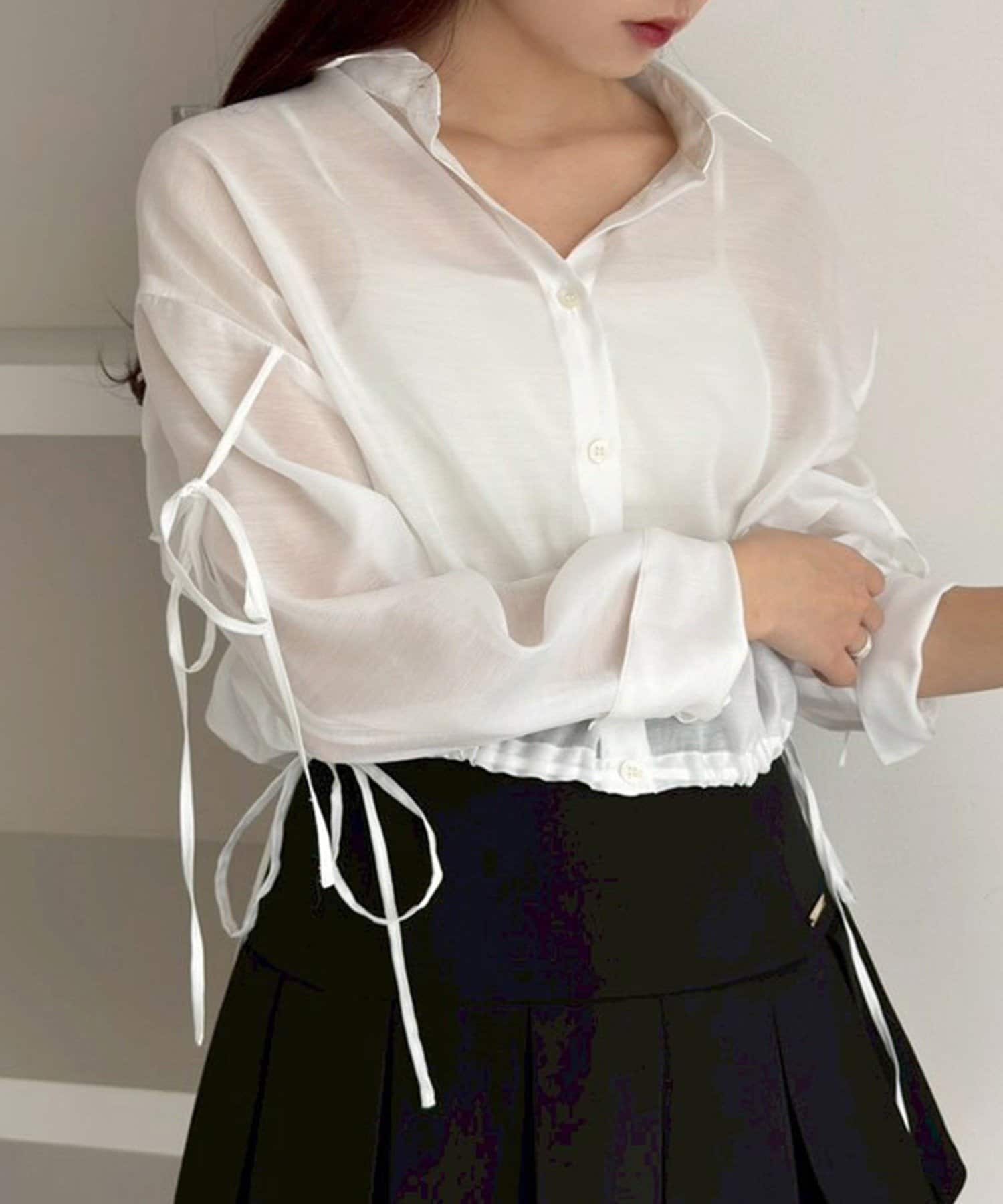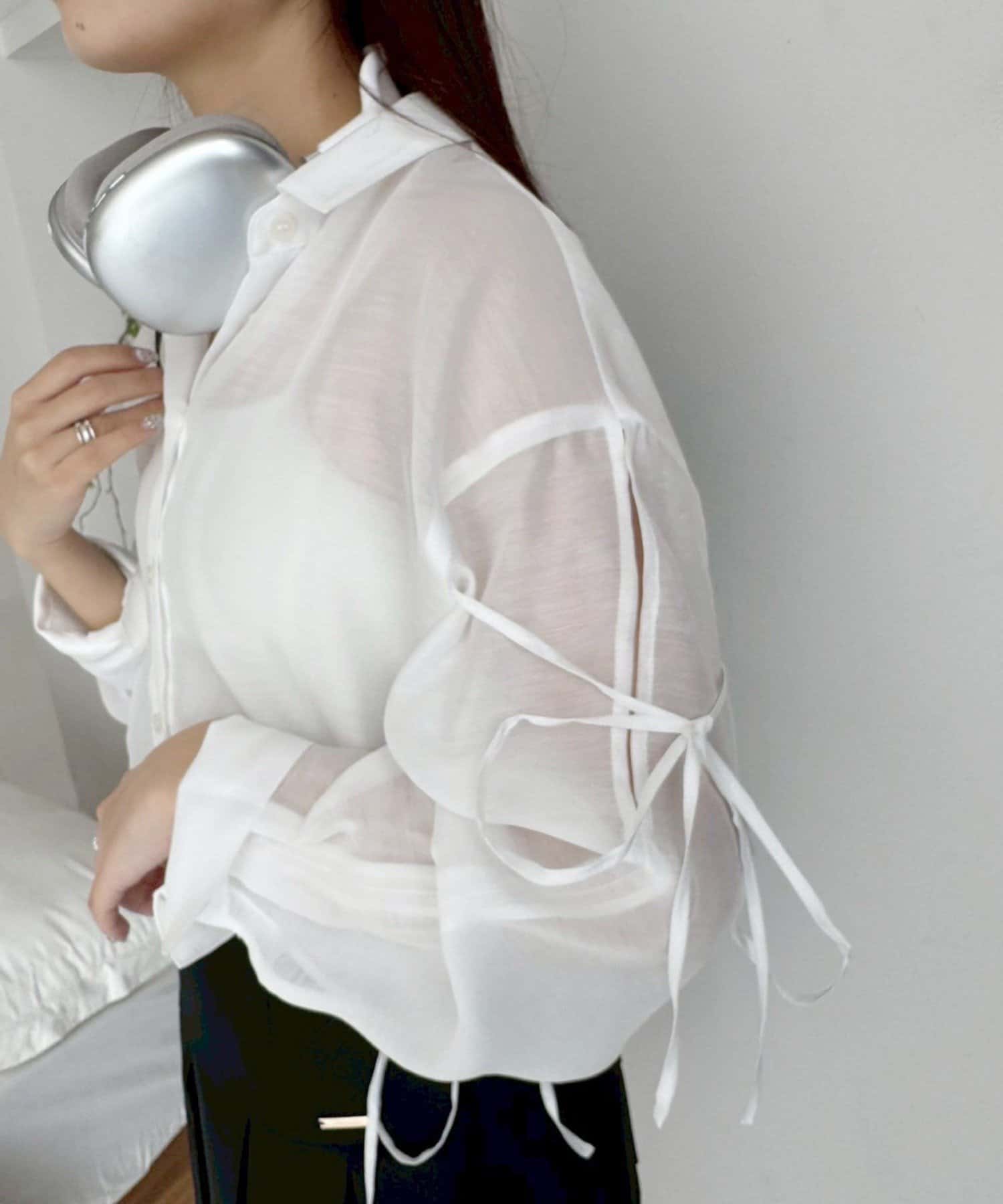 袖と裾のリボンが、カジュアルになりやすいシャツを華やかでフェミニンな印象にしてくれます。