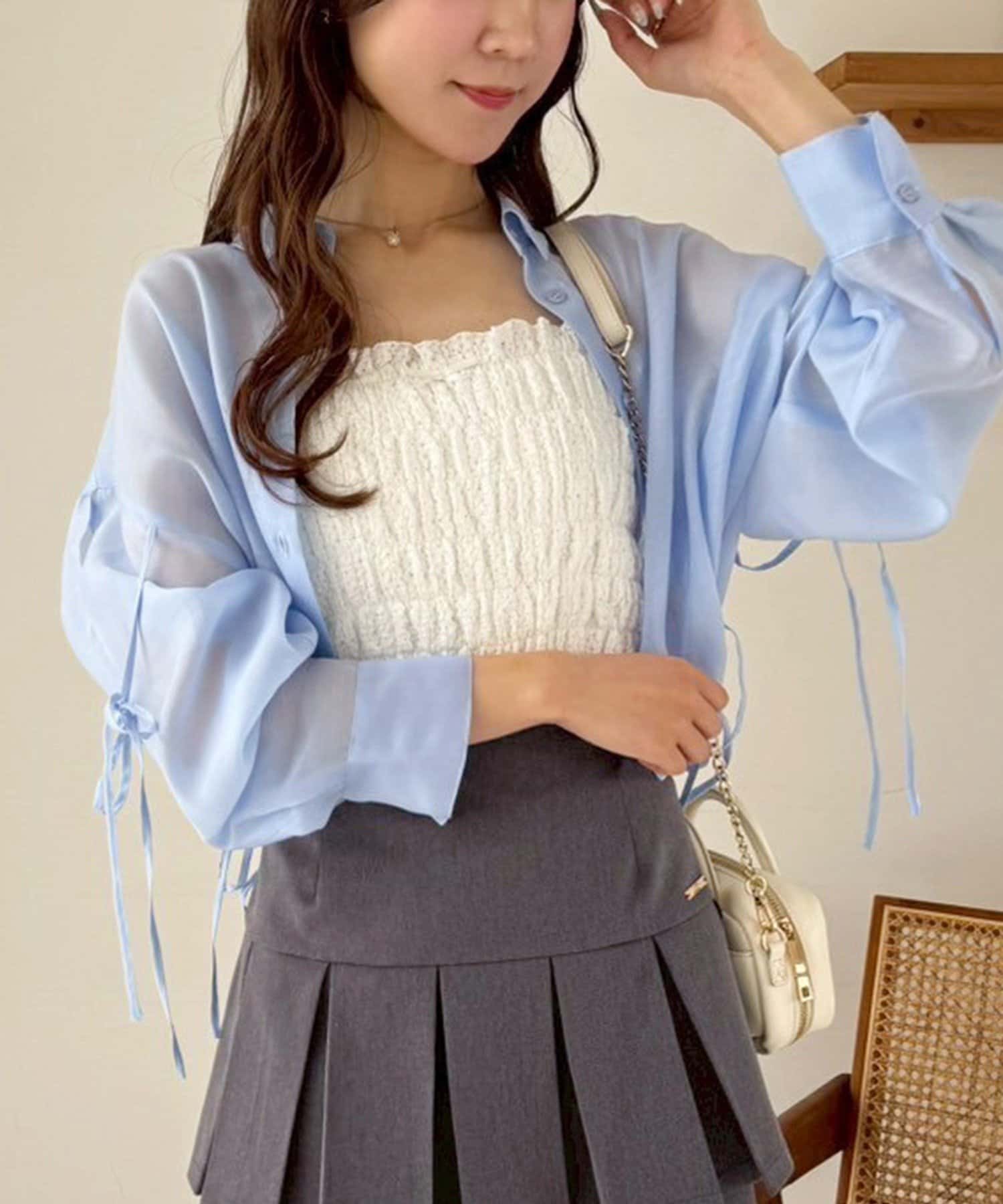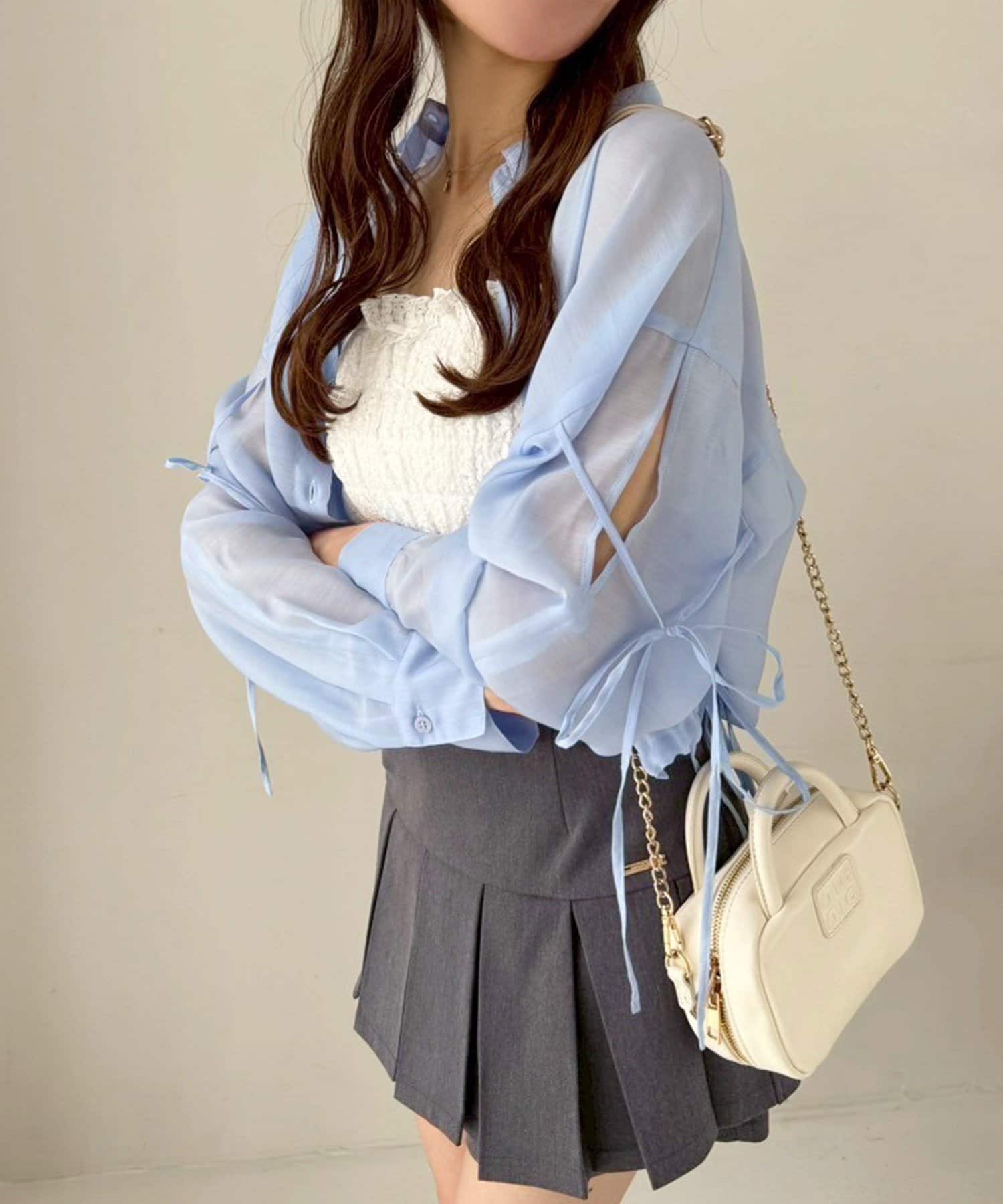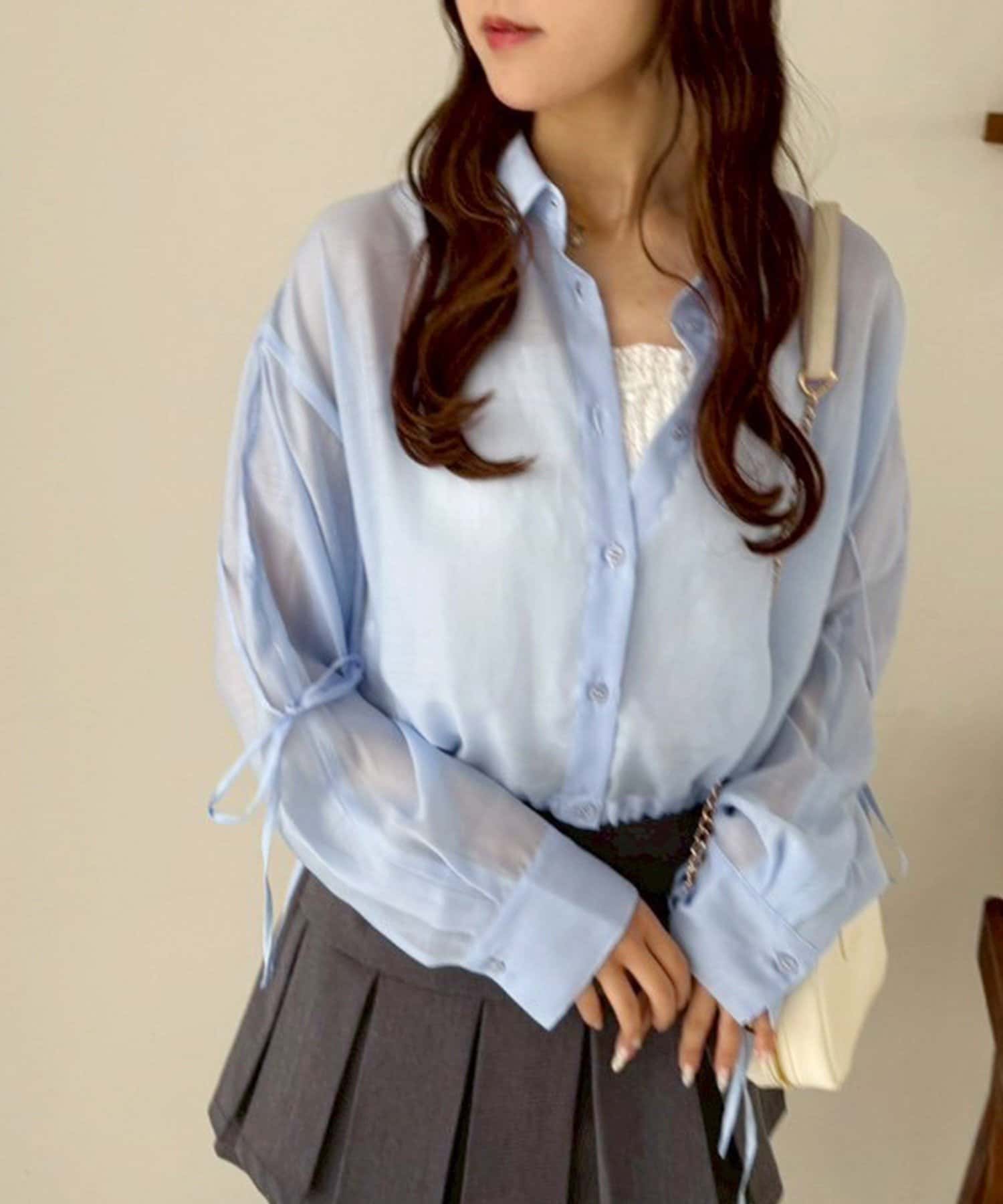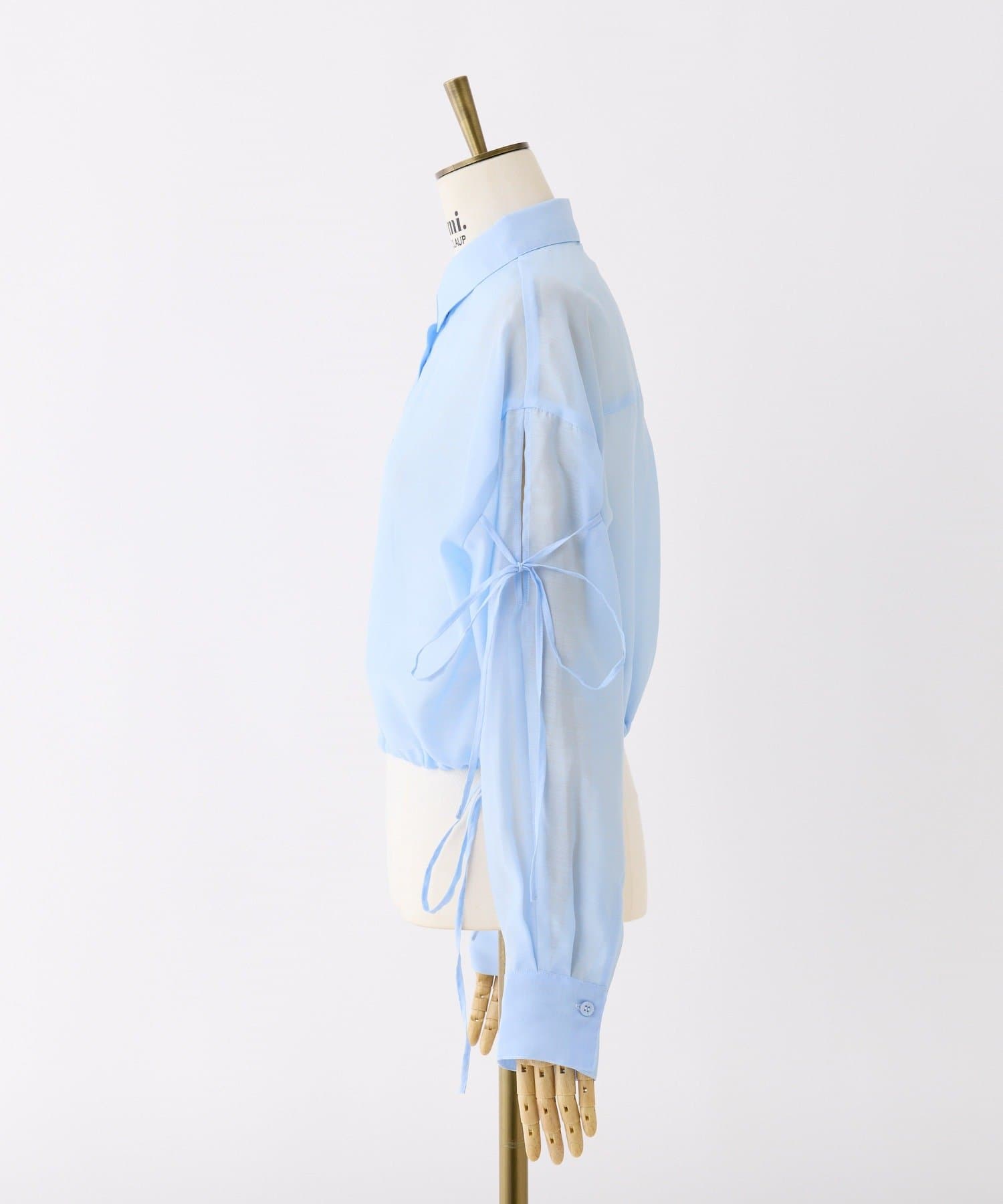 袖と裾のリボンが、カジュアルになりやすいシャツを華やかでフェミニンな印象にしてくれます。