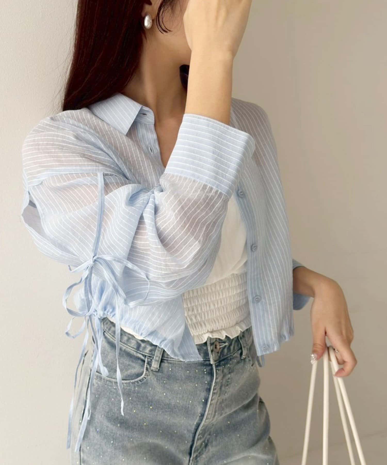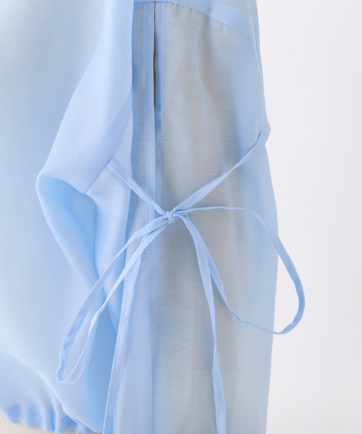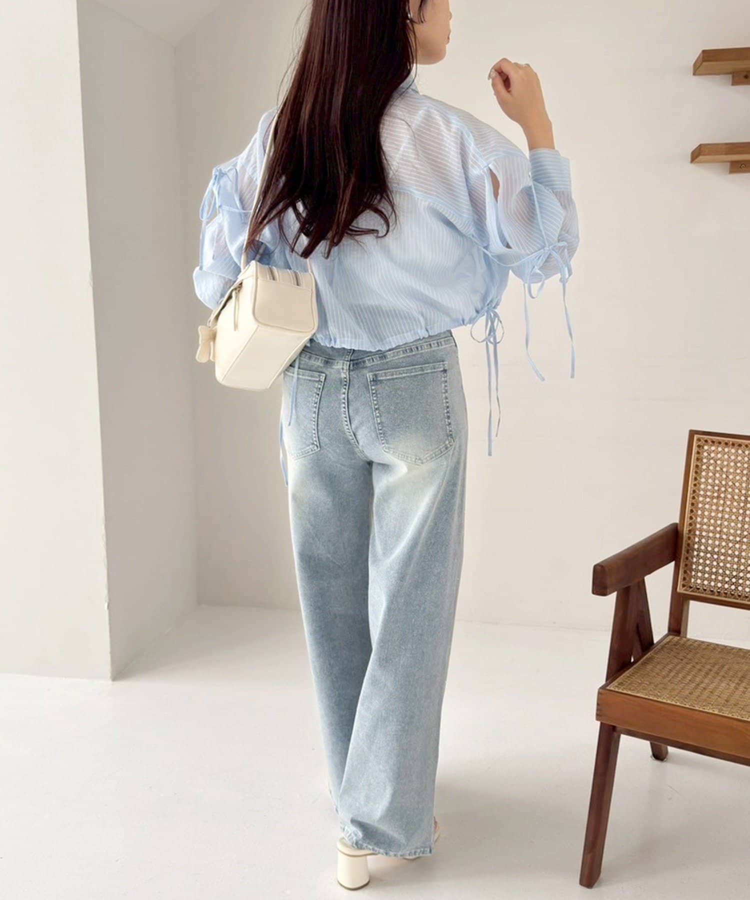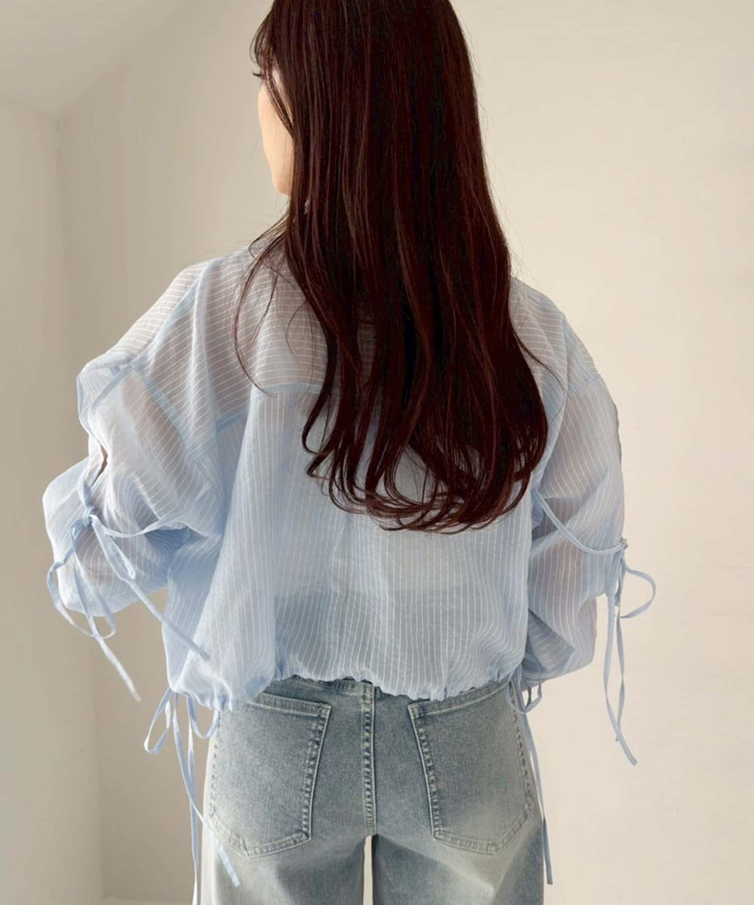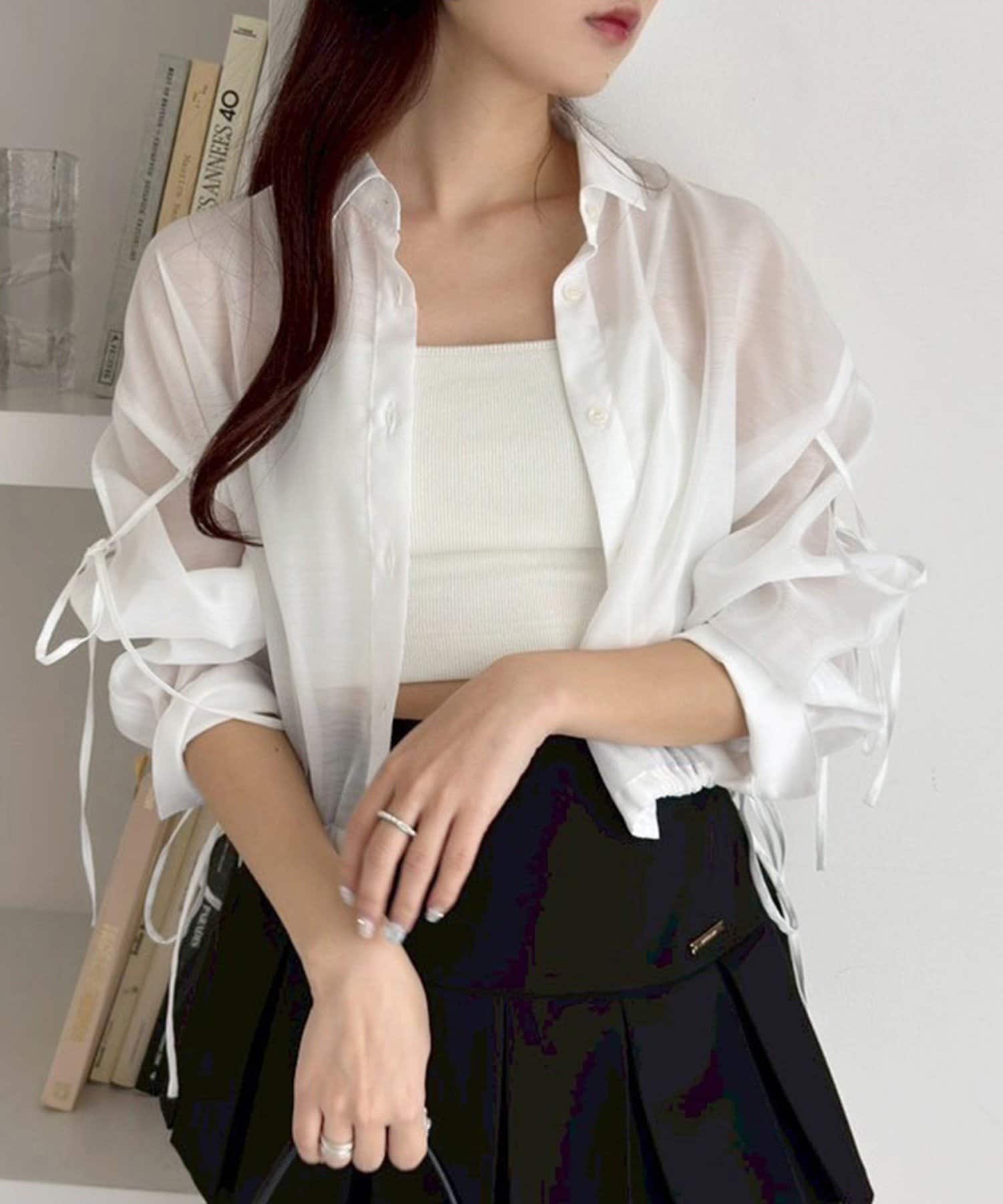 袖と裾のリボンが、カジュアルになりやすいシャツを華やかでフェミニンな印象にしてくれます。