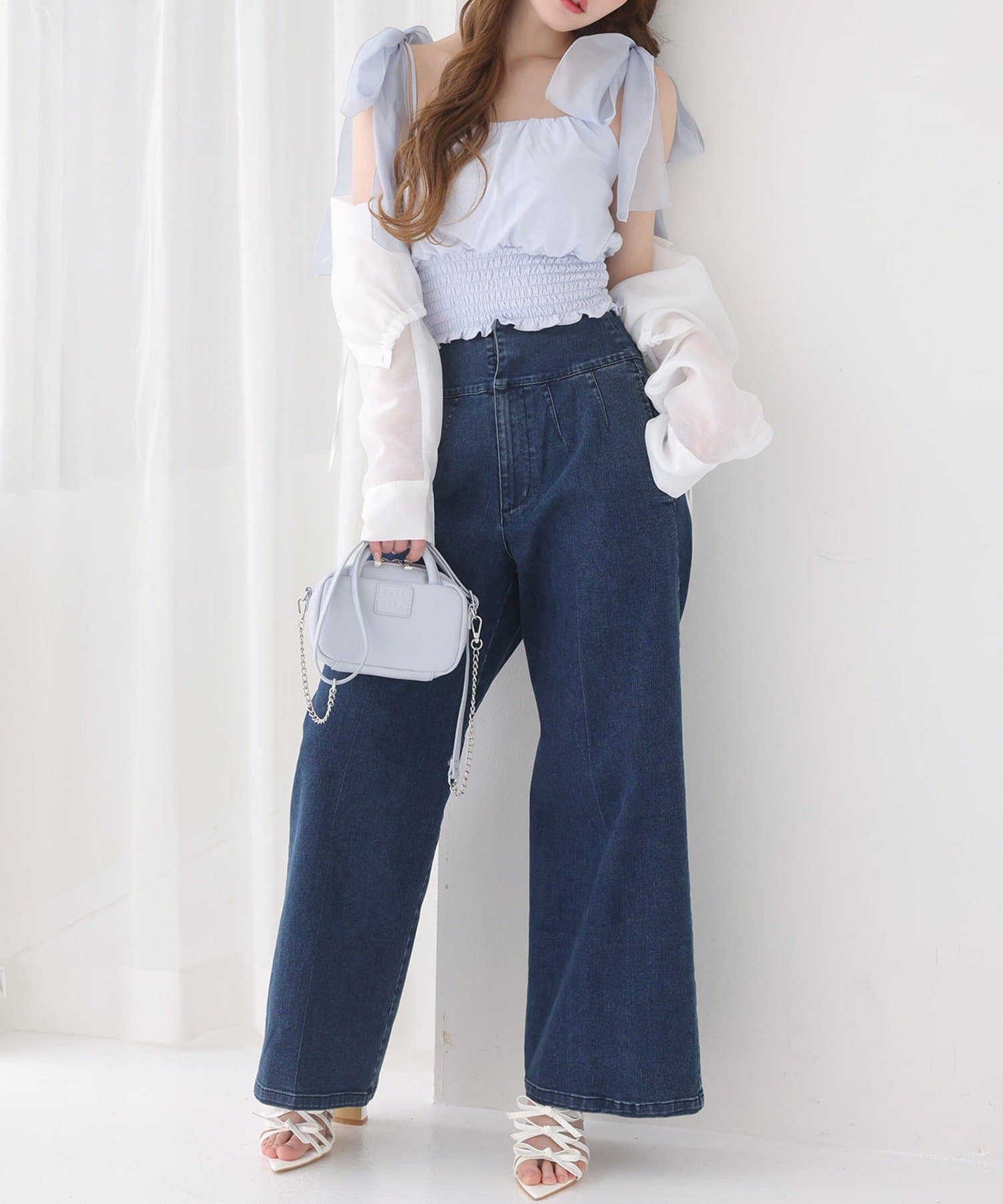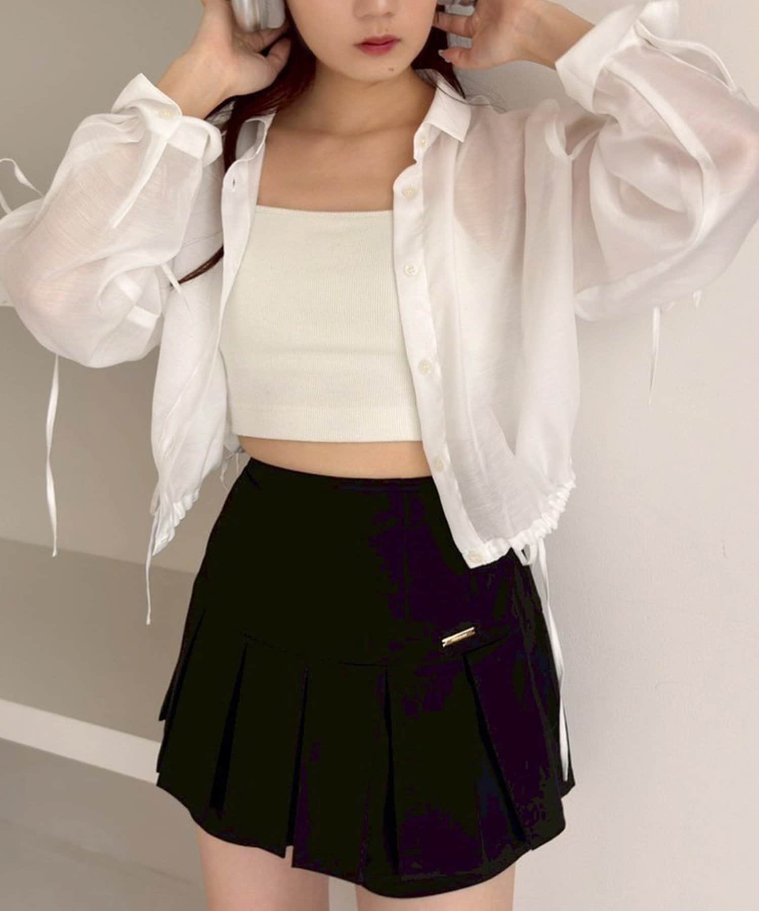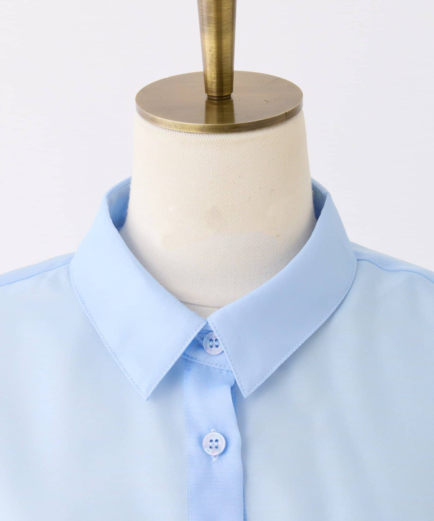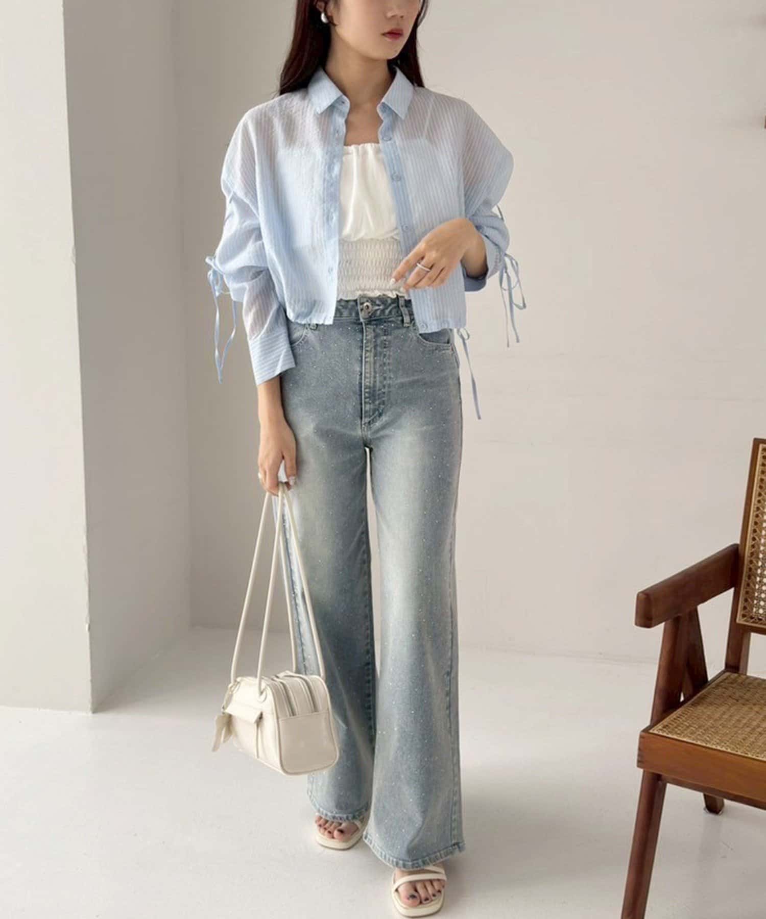 袖と裾のリボンが、カジュアルになりやすいシャツを華やかでフェミニンな印象にしてくれます。
