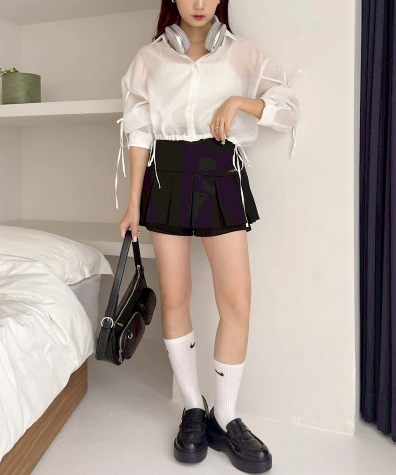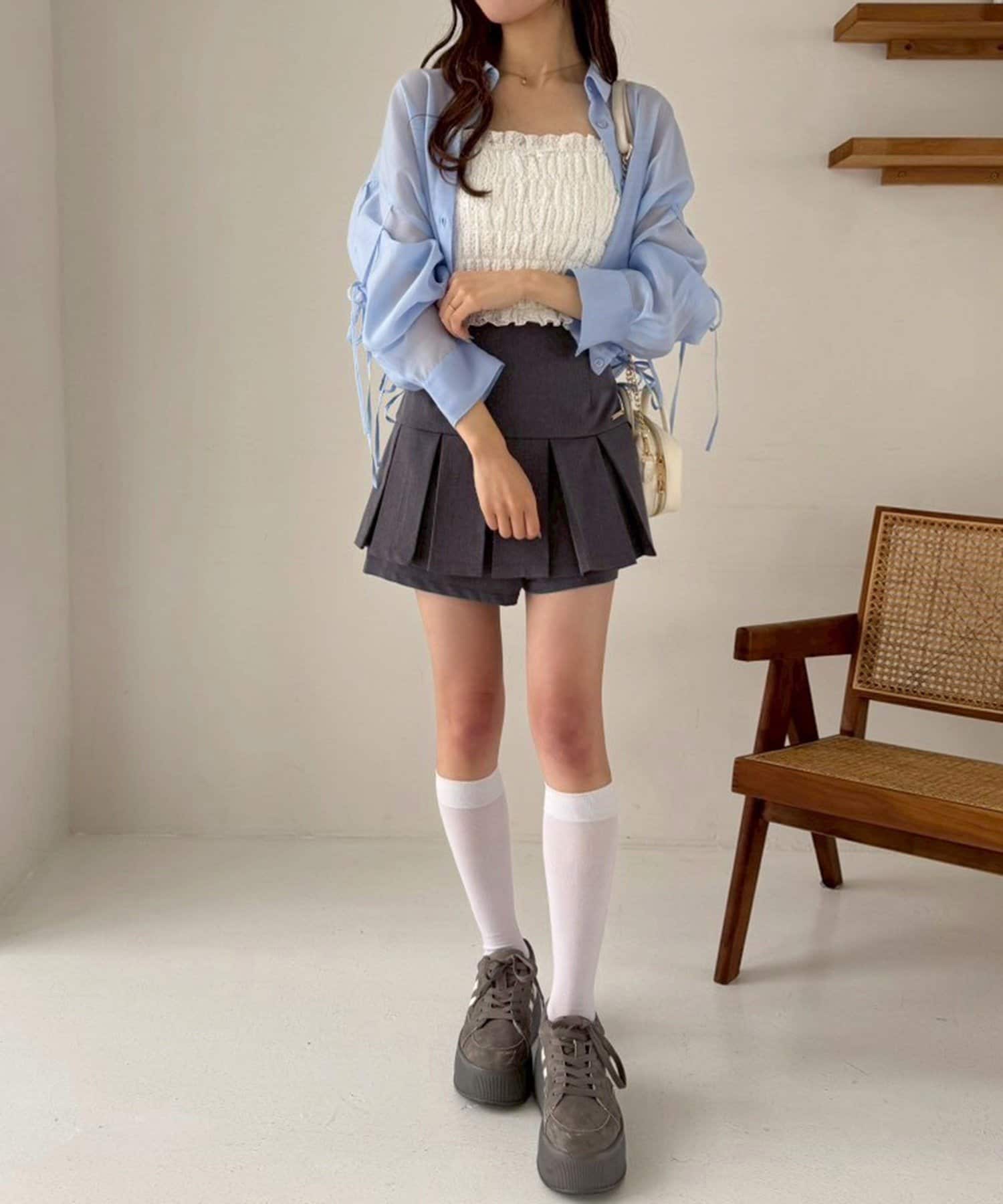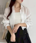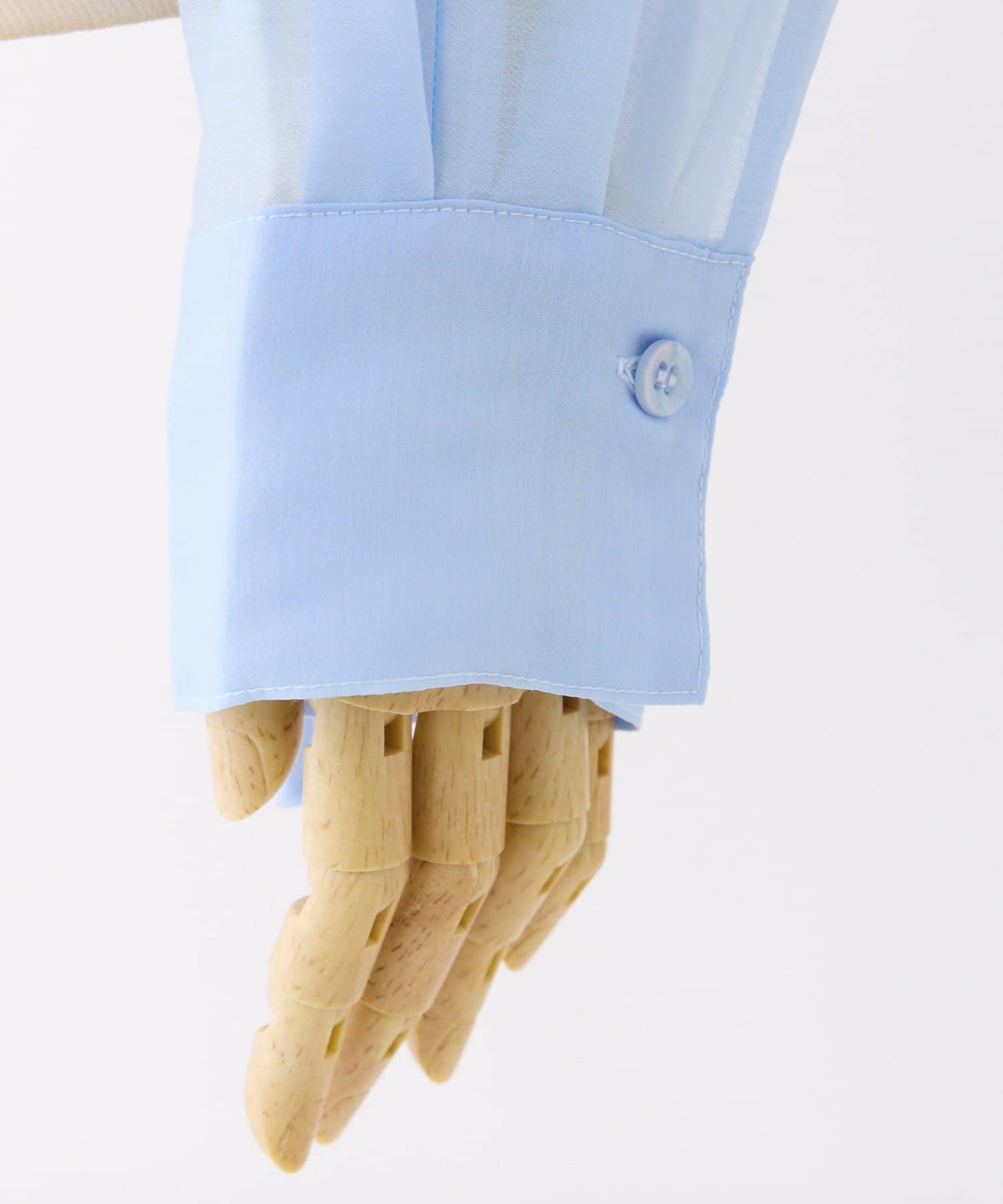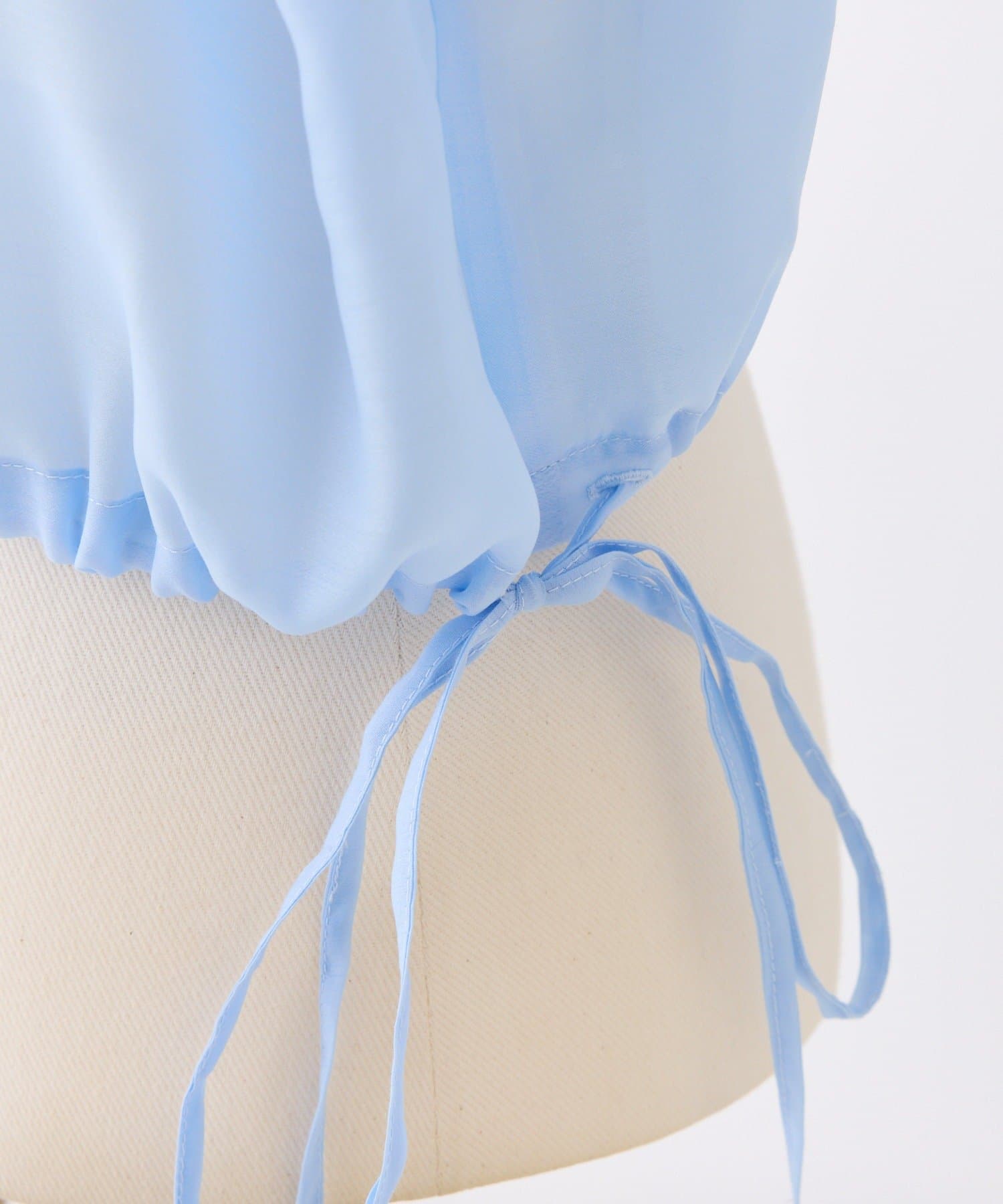 袖と裾のリボンが、カジュアルになりやすいシャツを華やかでフェミニンな印象にしてくれます。