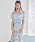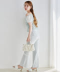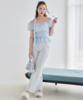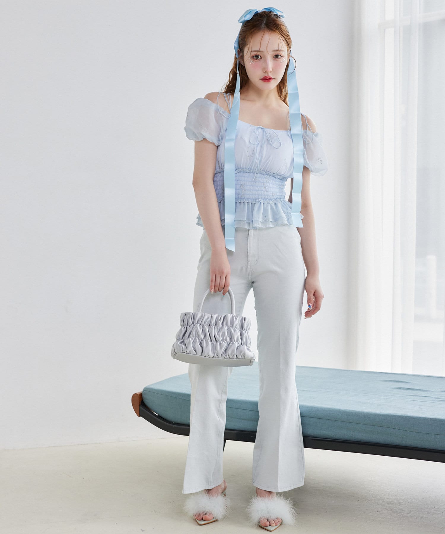 デニムパンツを合わせて甘さを抑えたカジュアルスタイルにしたり、