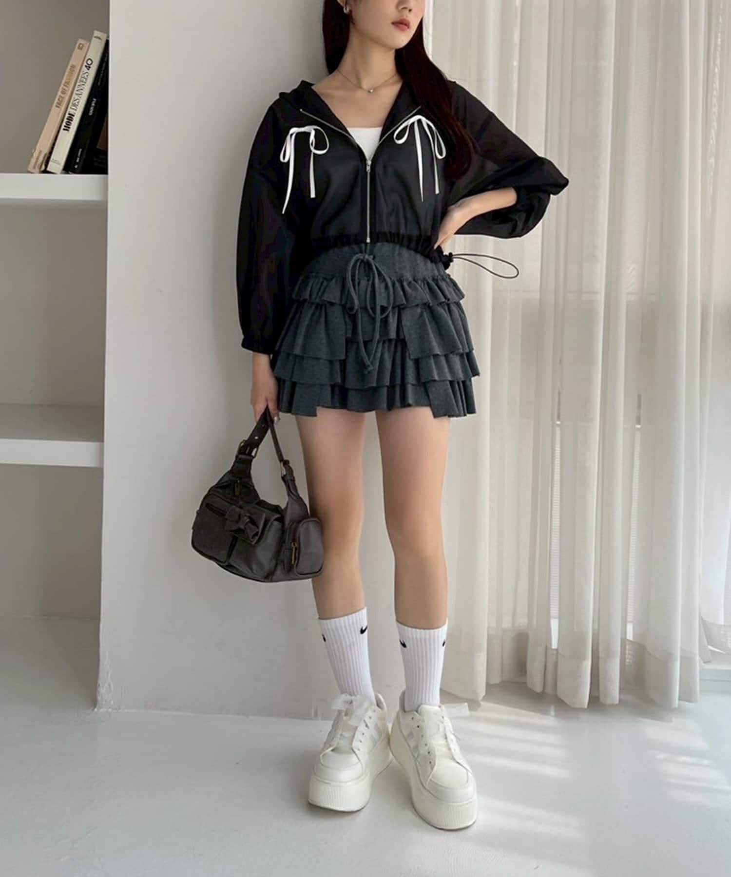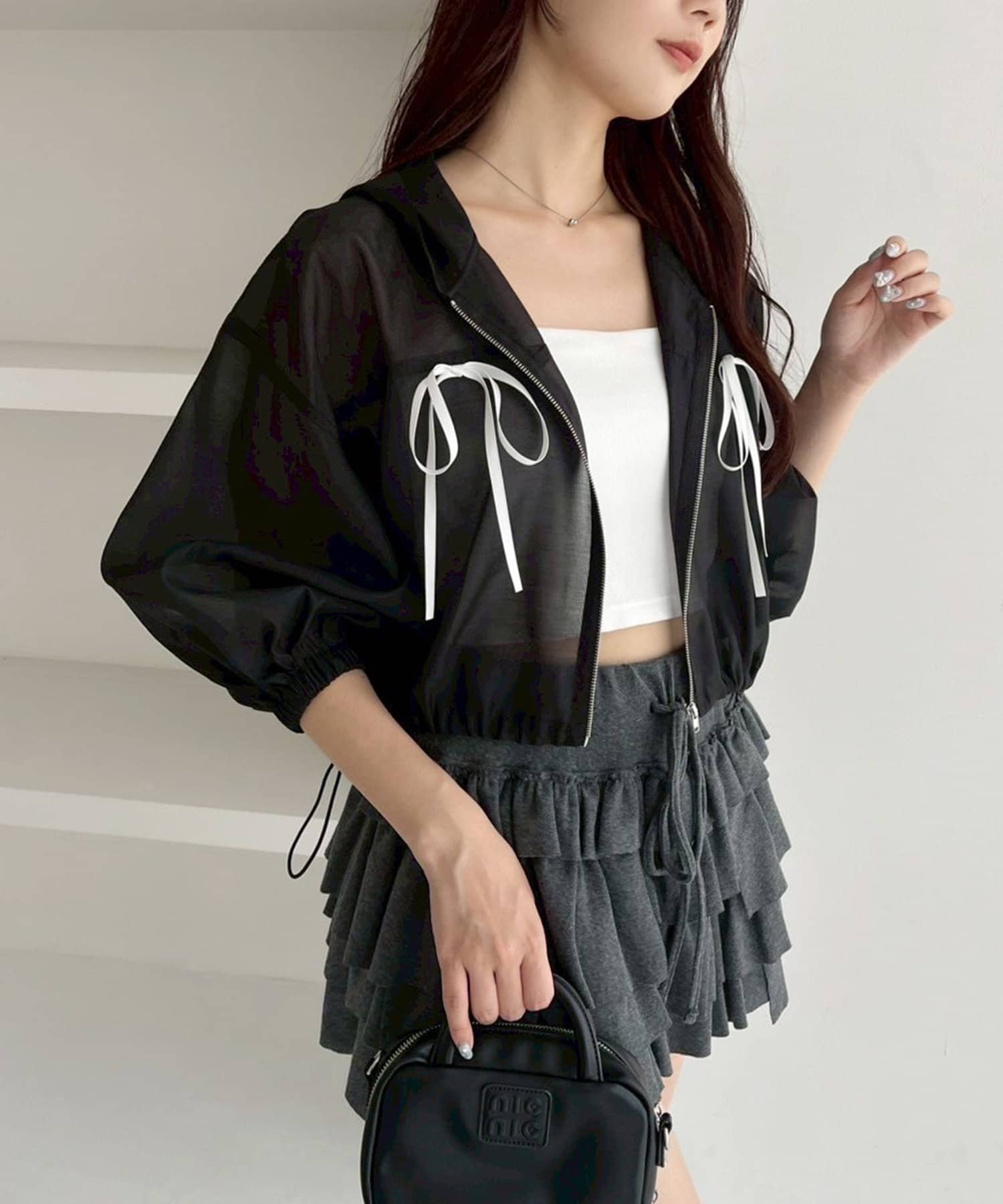 えりの付いていないシアーの羽織を探していたのでピッタリでした!裾を絞れるのでハイウエストデニムとか相性抜群です!胸元のリボンがかわいいしフードもついてて甘めカジュアルの具合がとてもかわいい