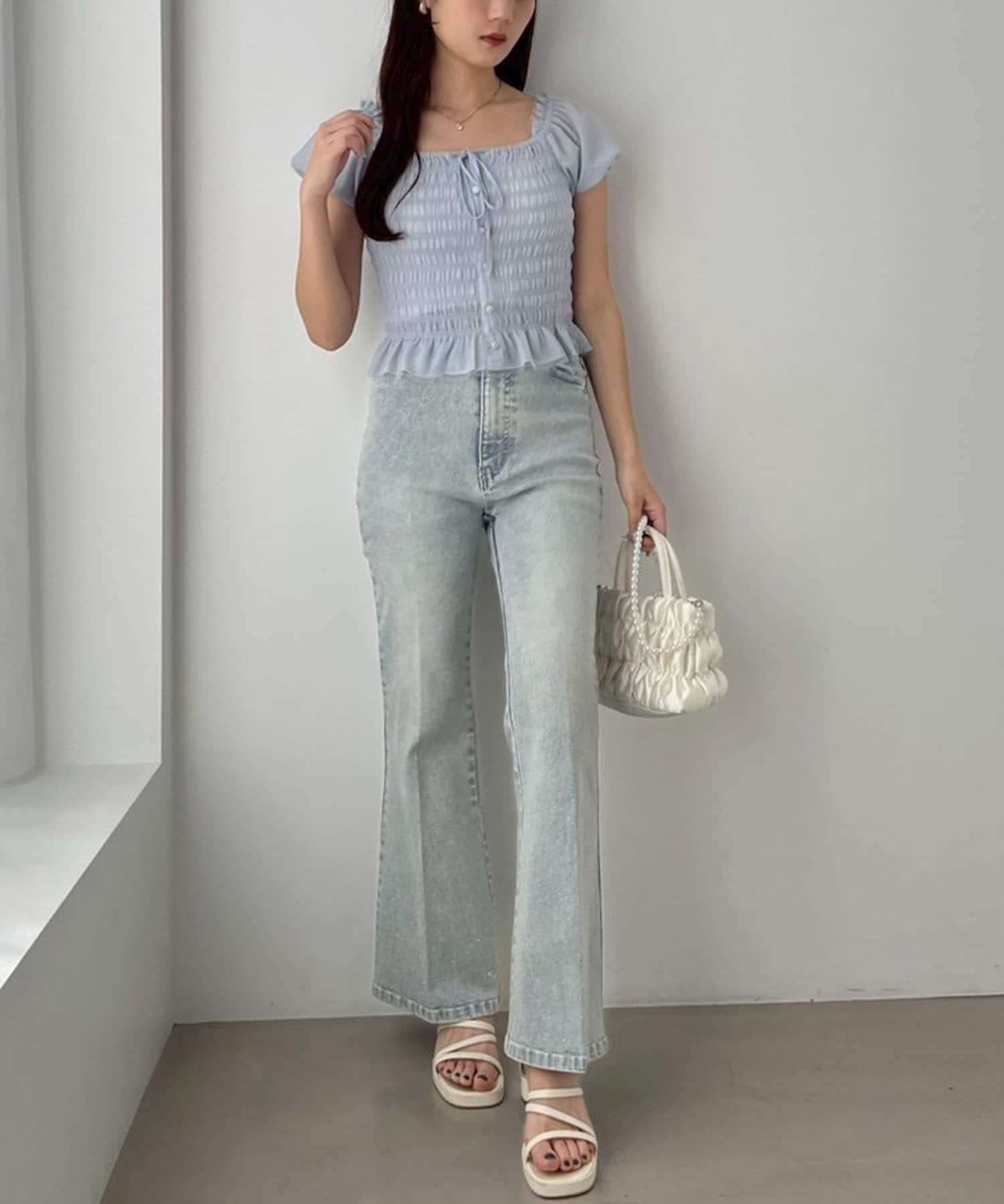 ショート丈のトップスなので、ハイウエスとボトムとの相性がバツグン。