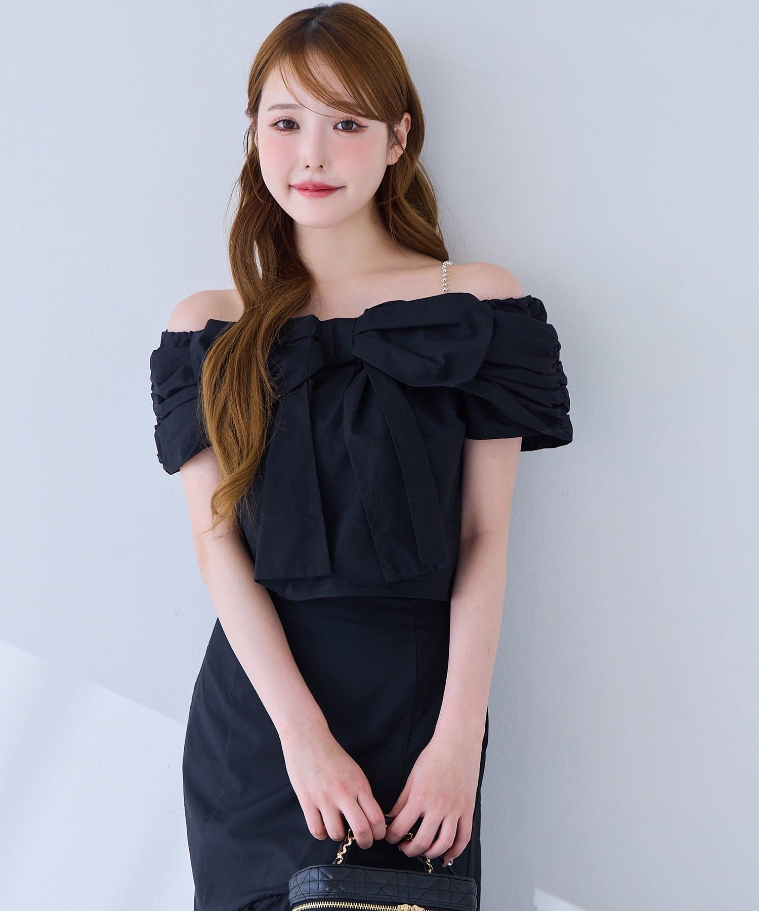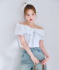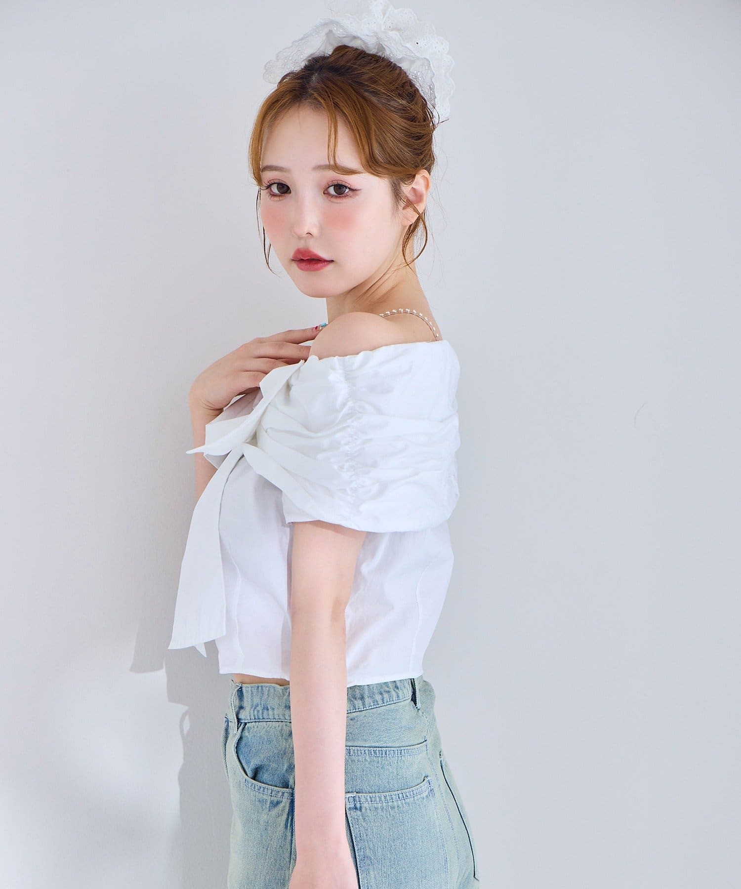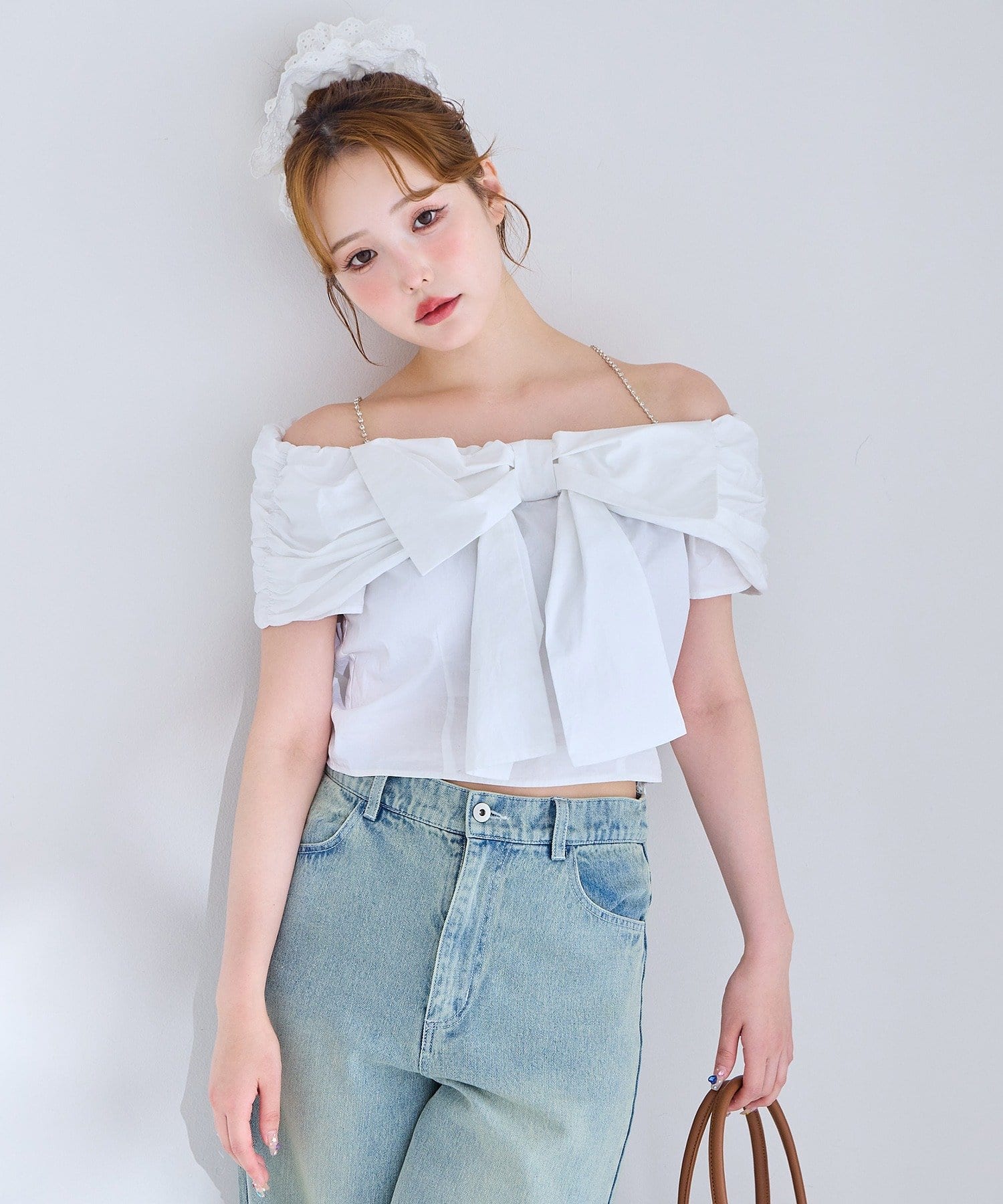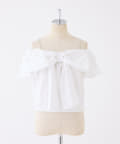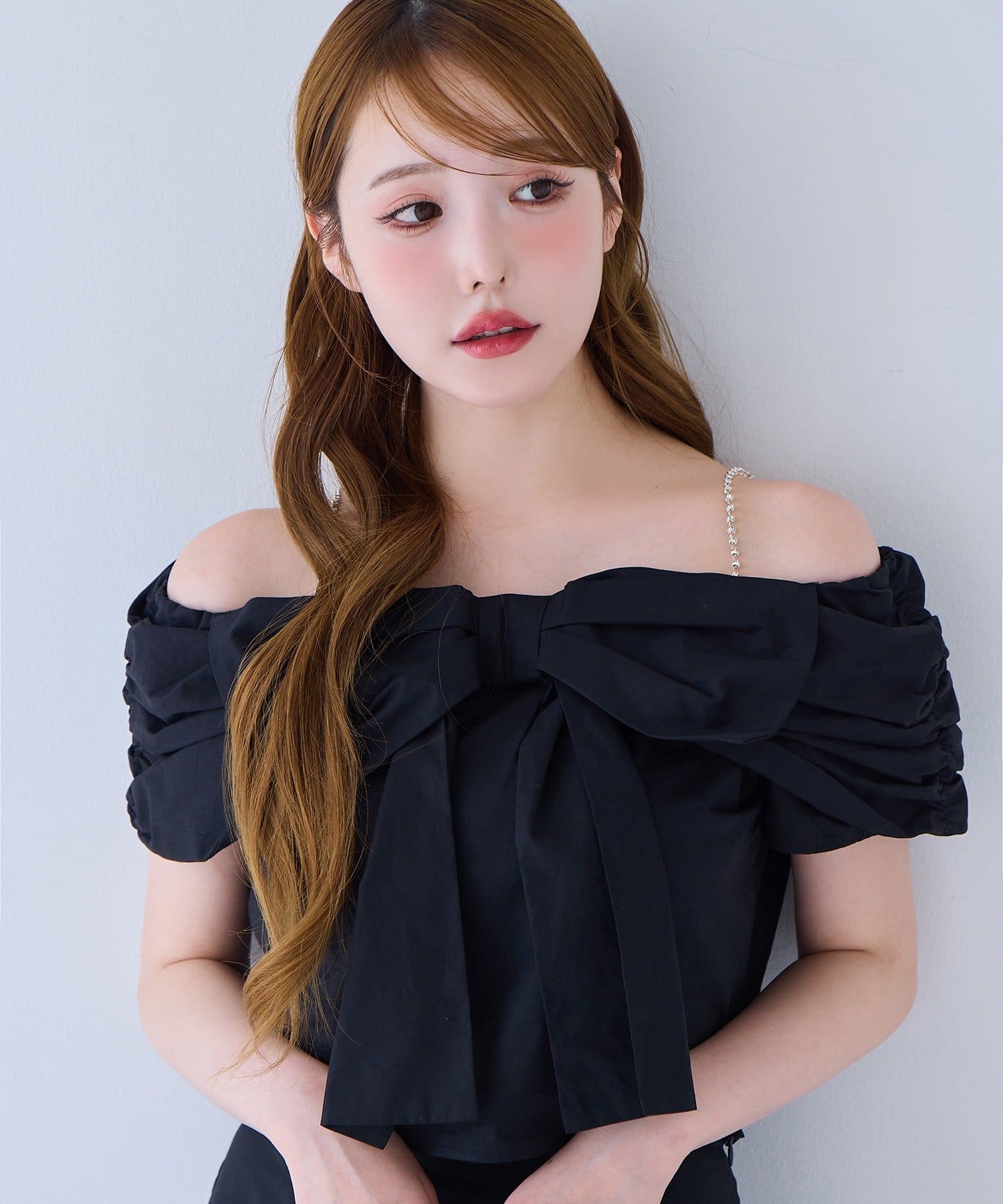 フロントにあしらわれた大きめリボンが主役の、オフショルブラウス