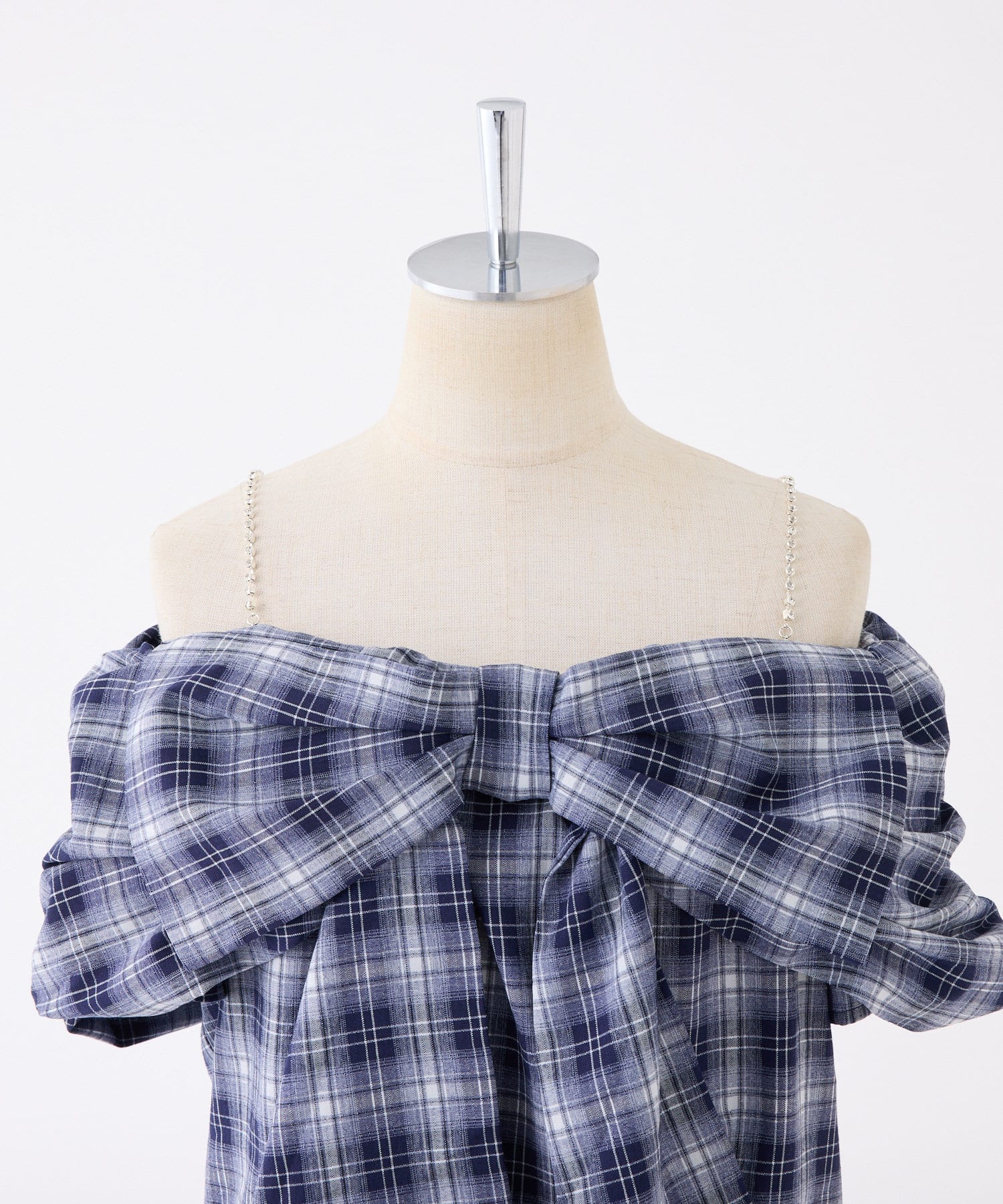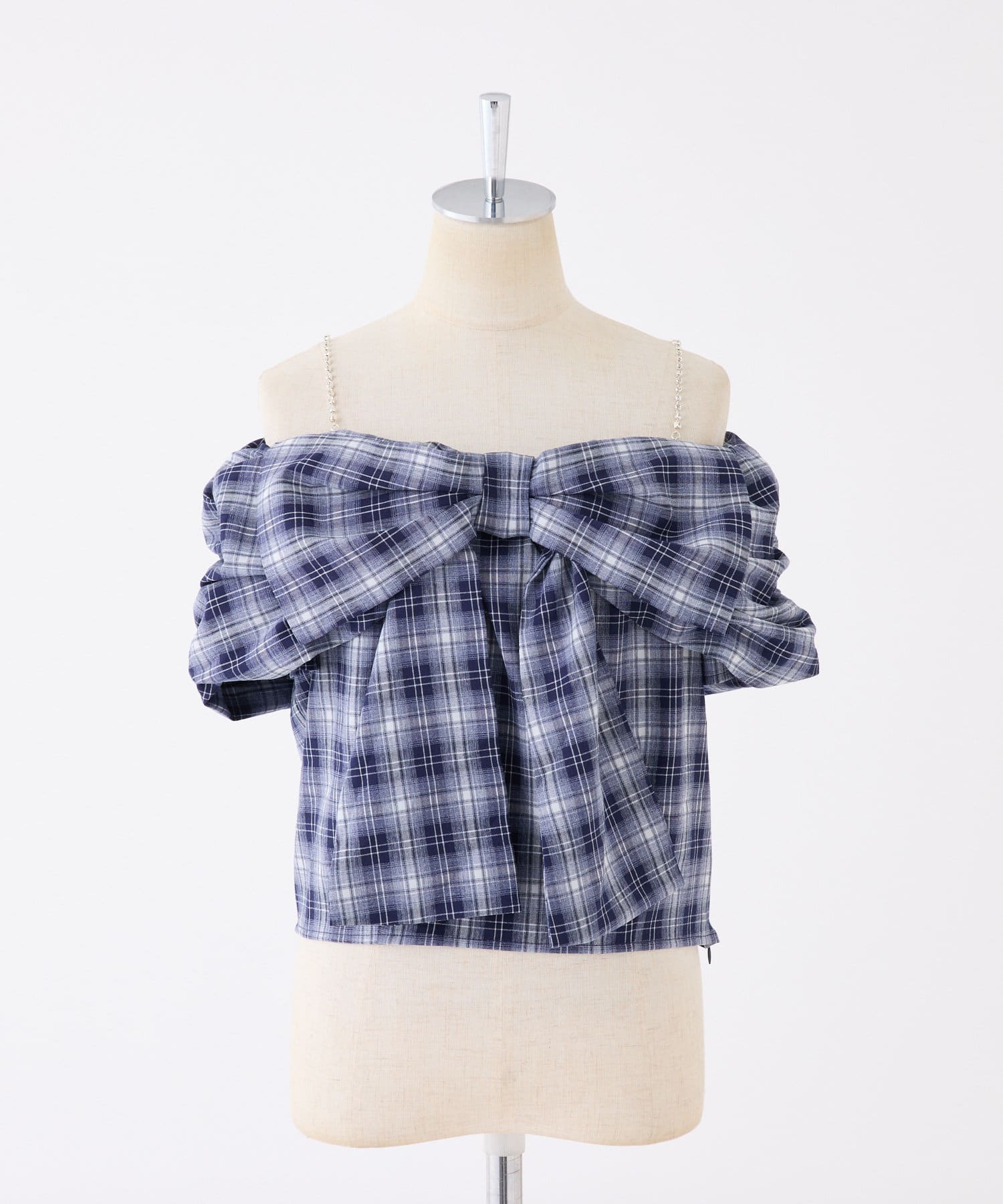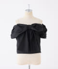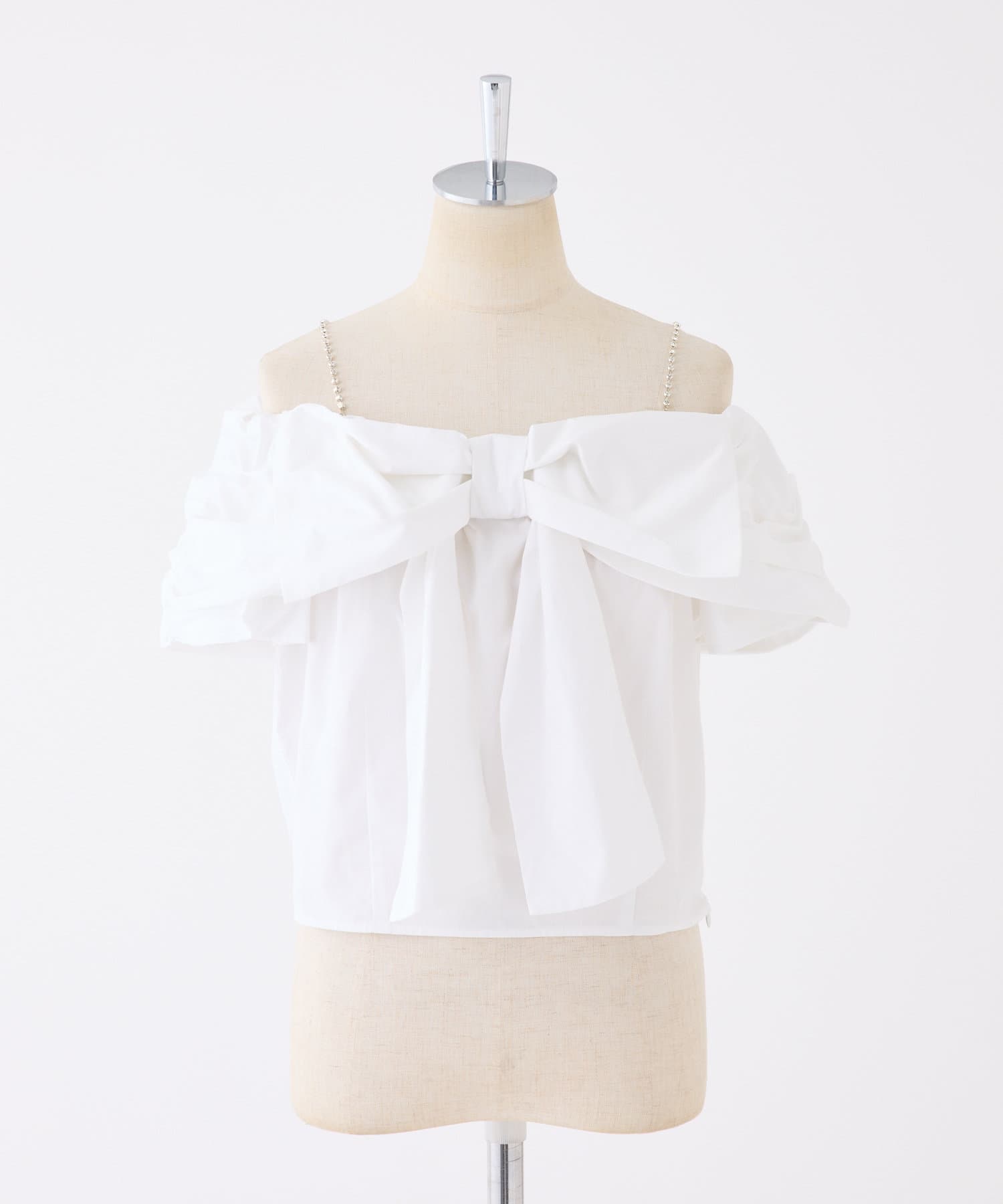 フロントにあしらわれた大きめリボンが主役の、オフショルブラウス